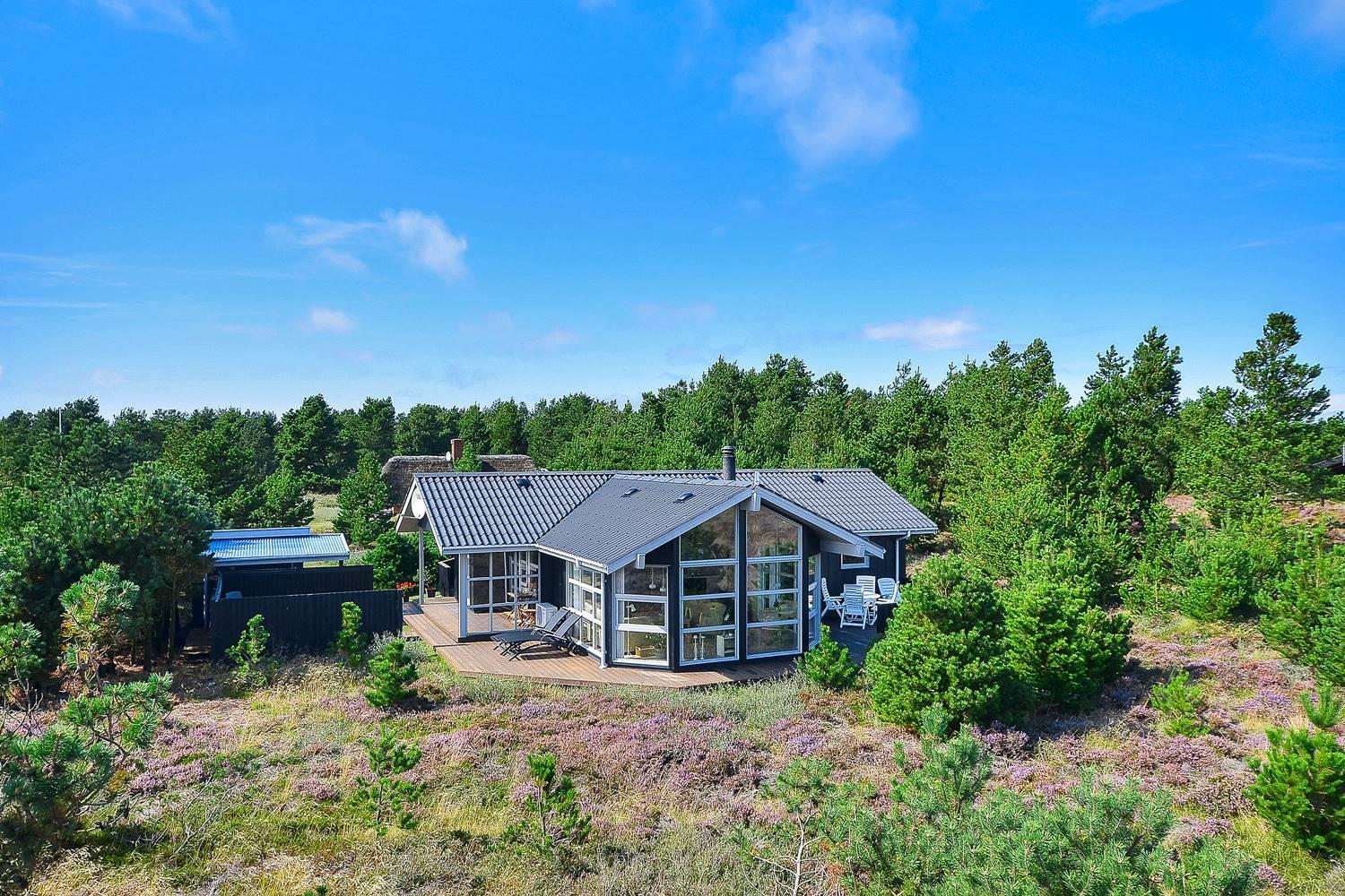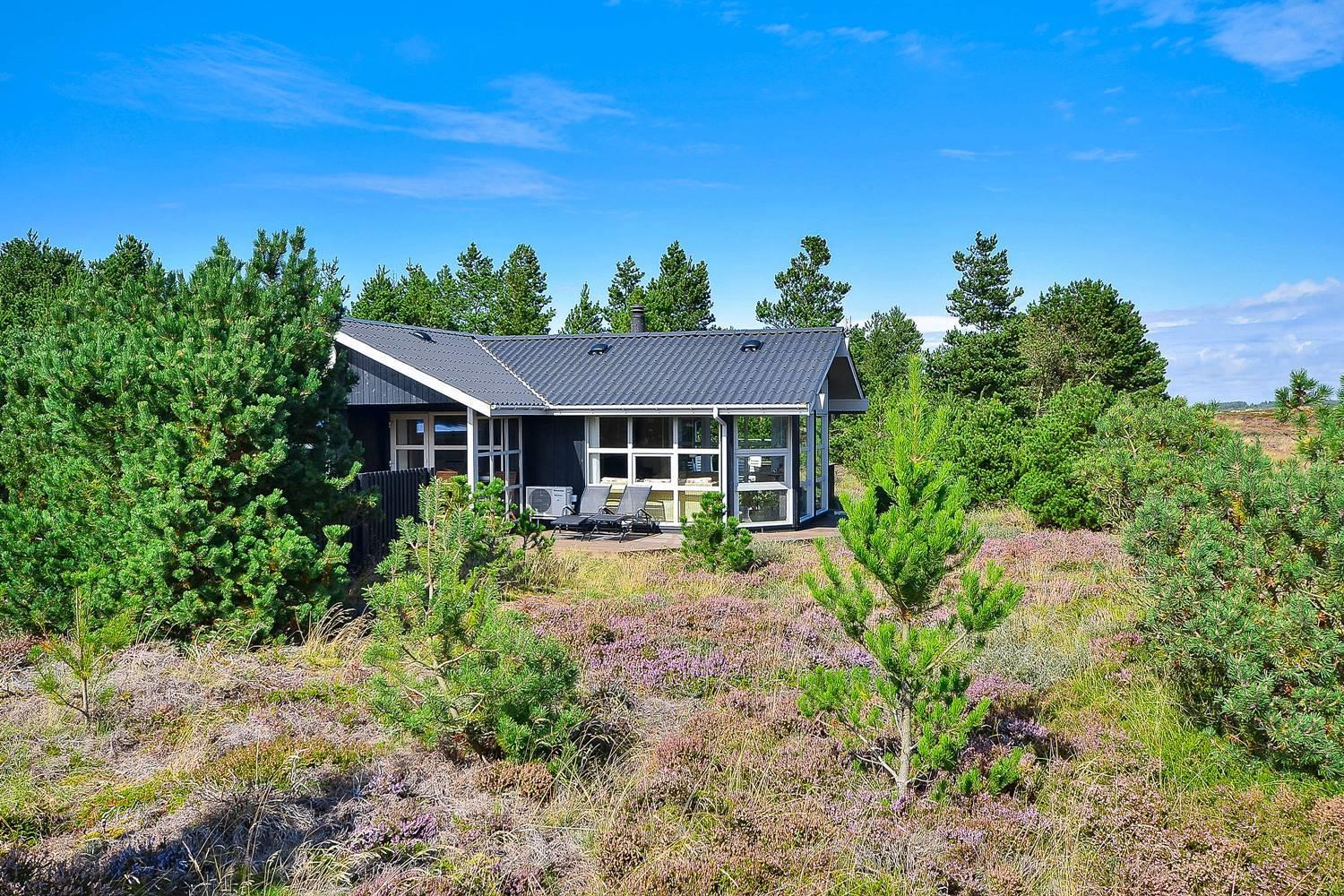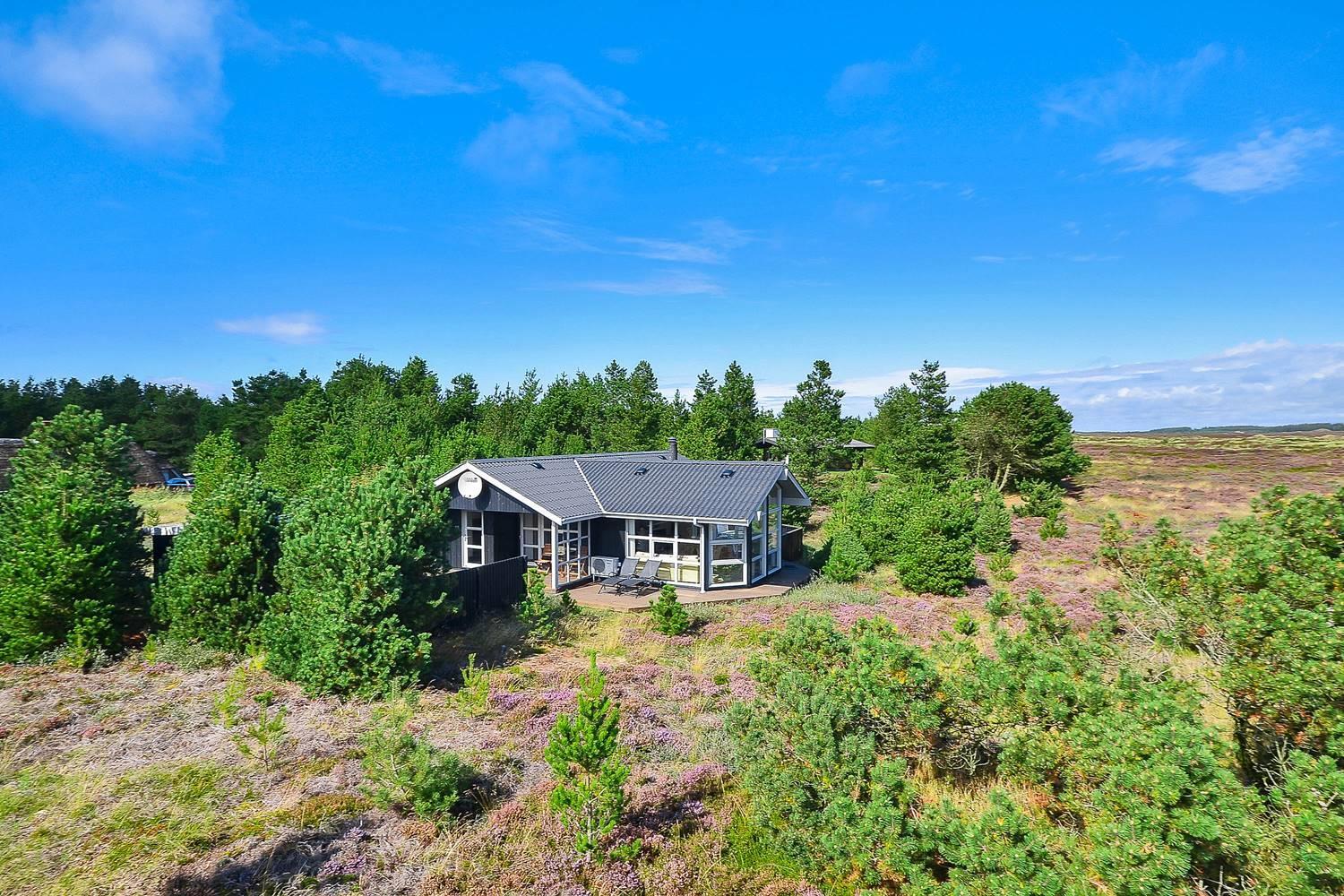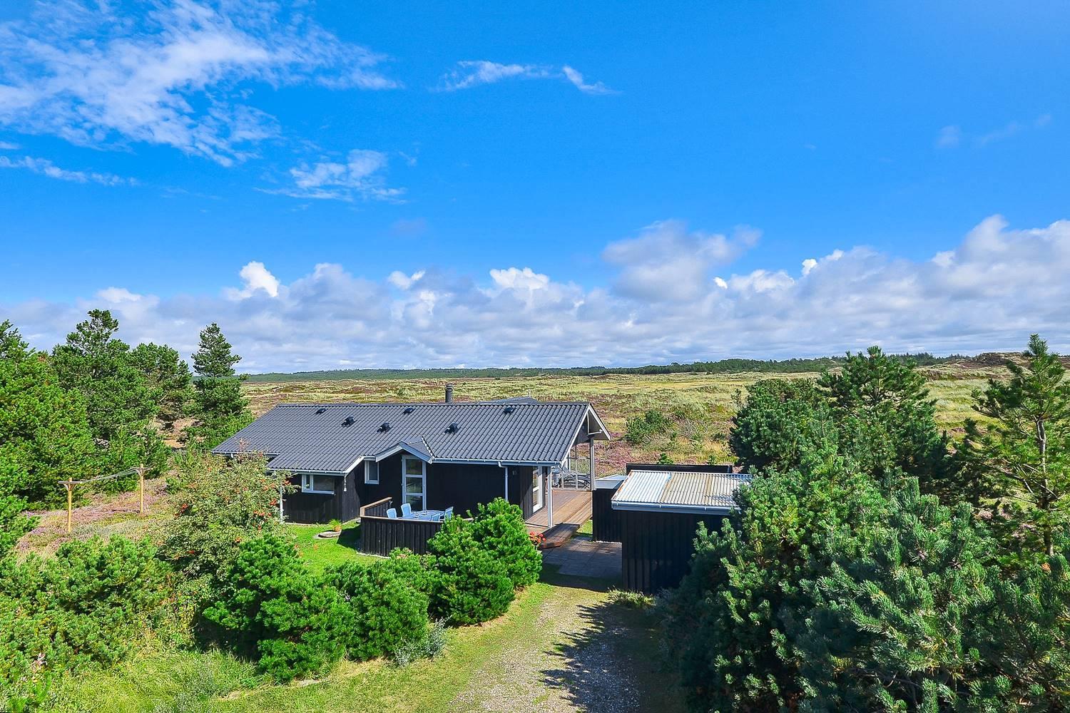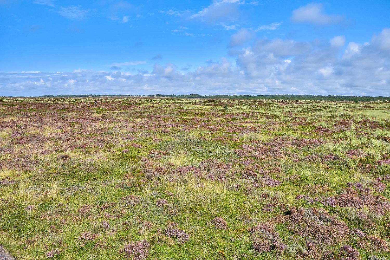 Feriehus på klitgrund med ugenert terrasse og udsigt til fredet hedeområde nær Henne Strand.