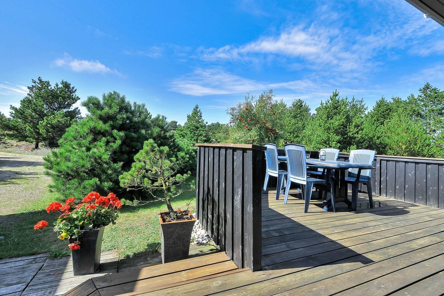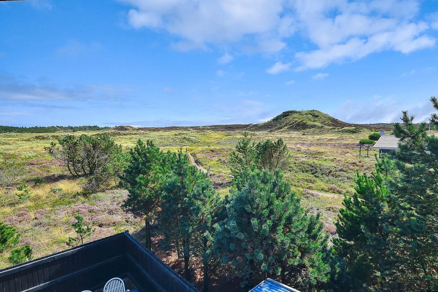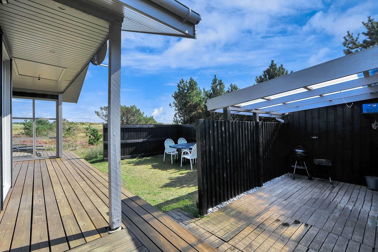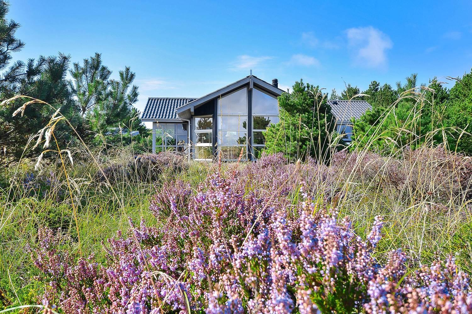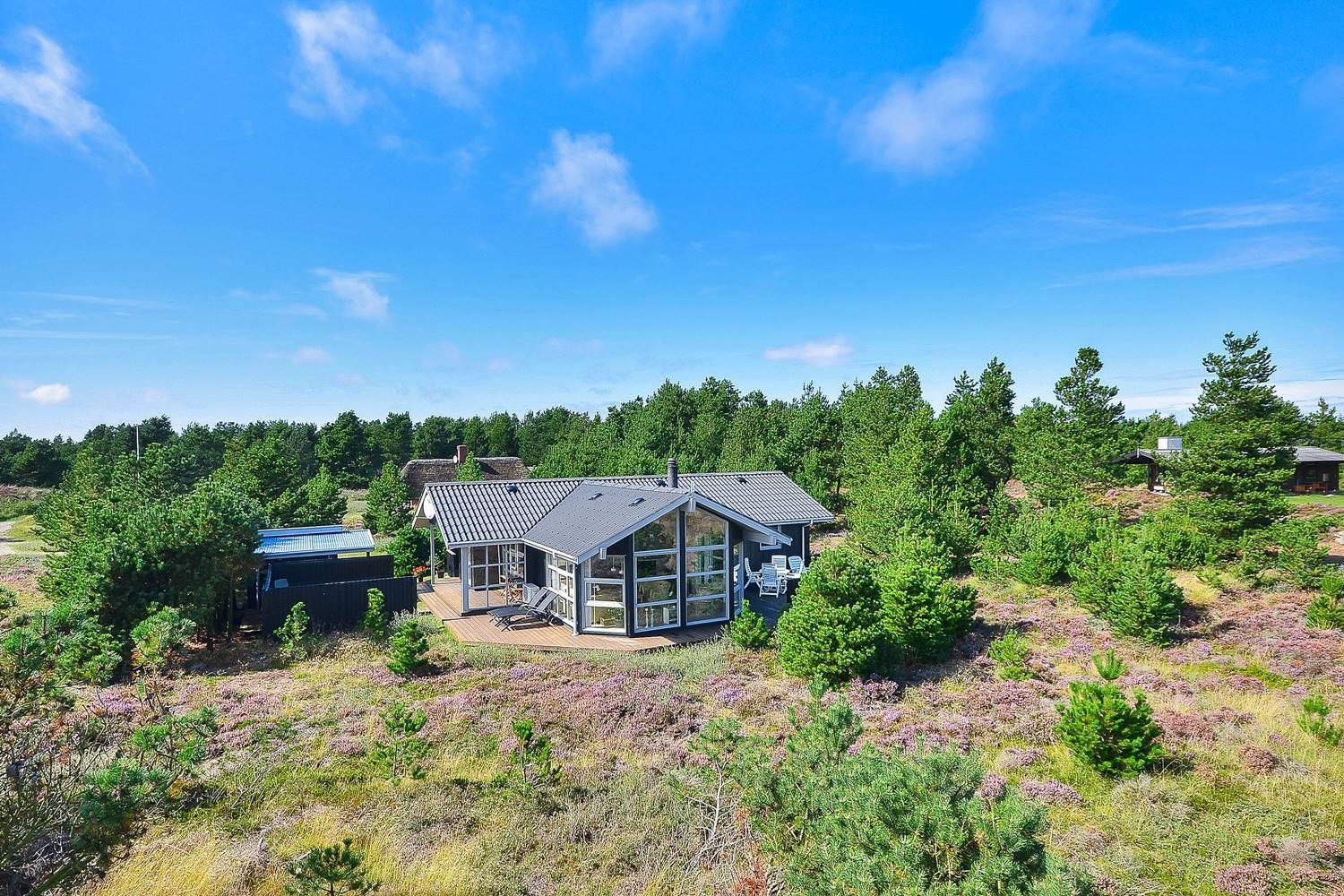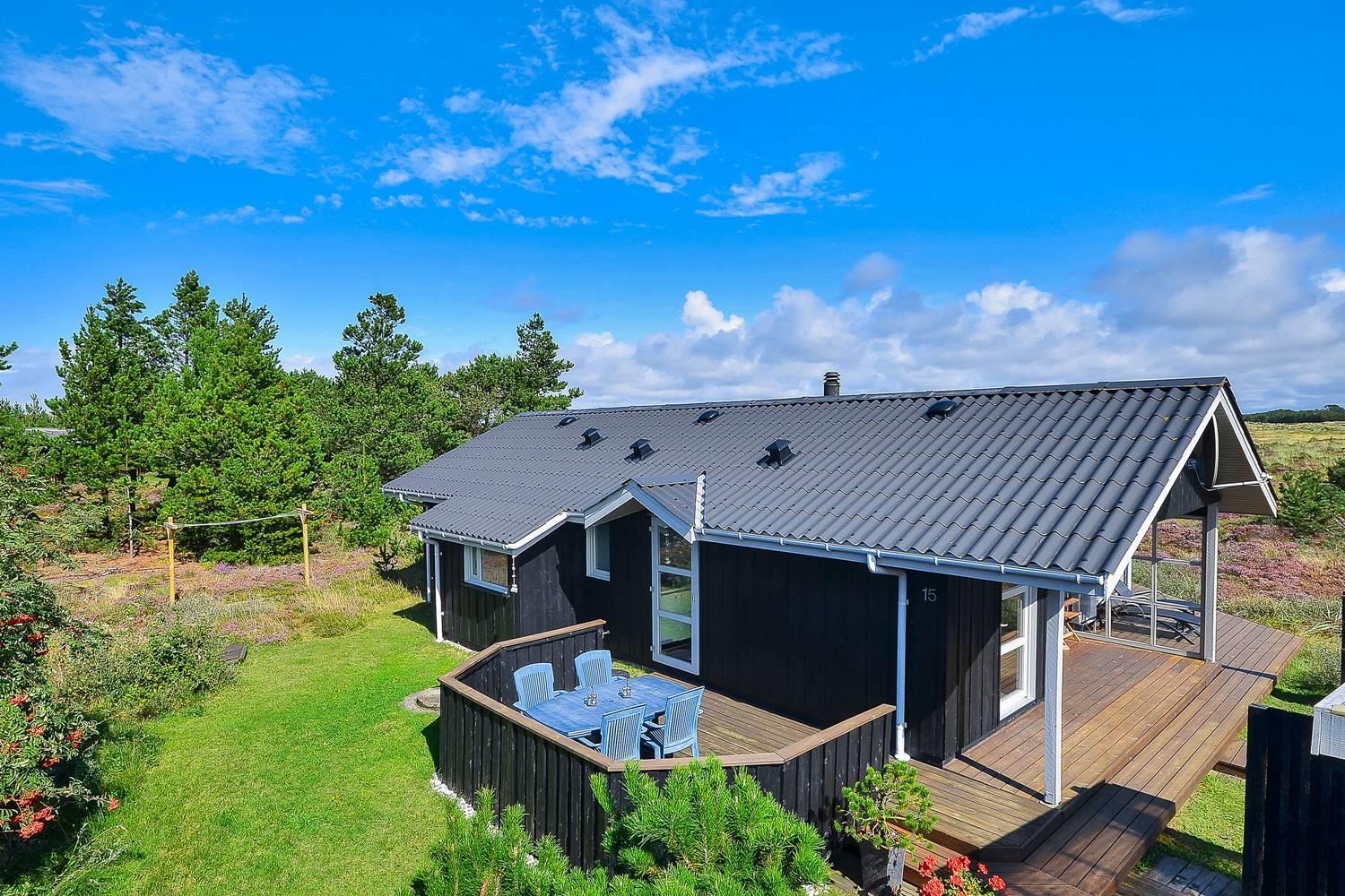 Feriehus på klitgrund med ugenert terrasse og udsigt til fredet hedeområde nær Henne Strand.