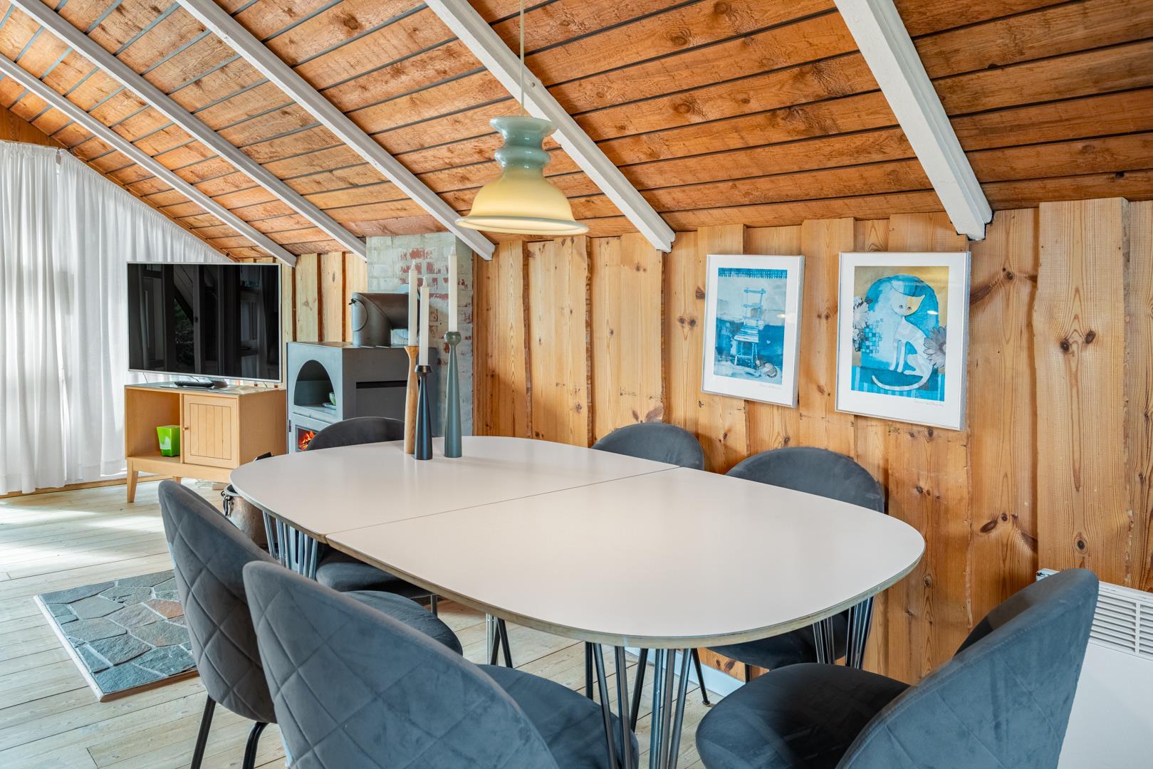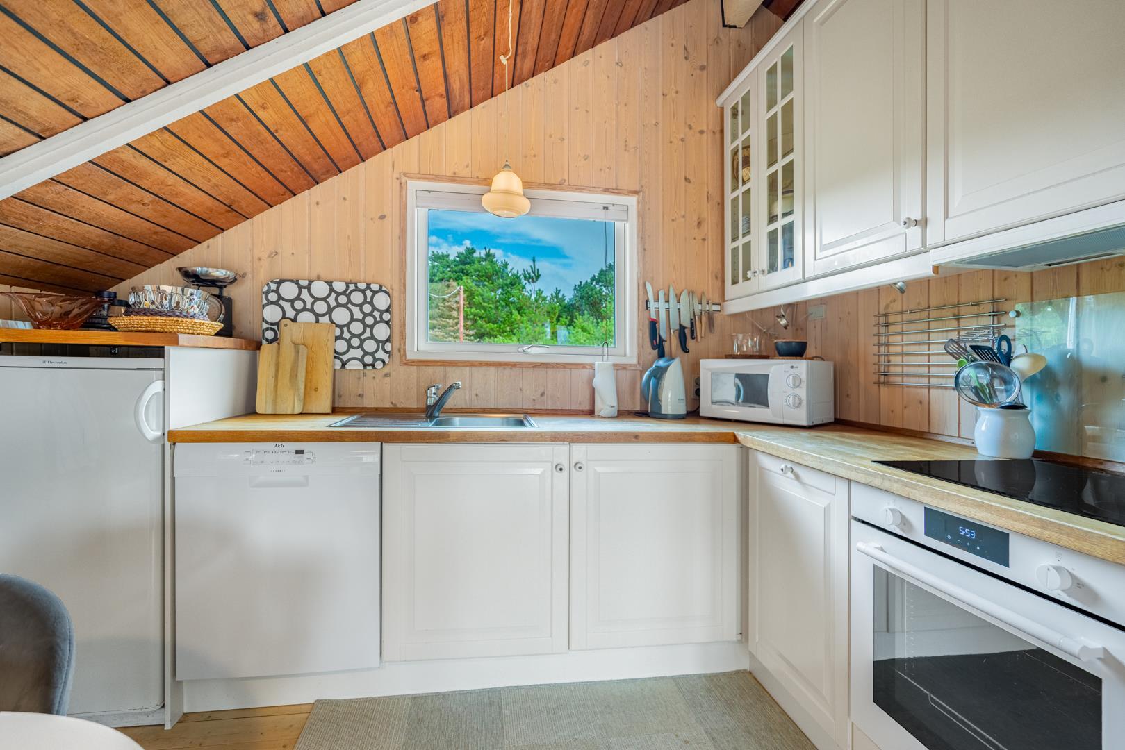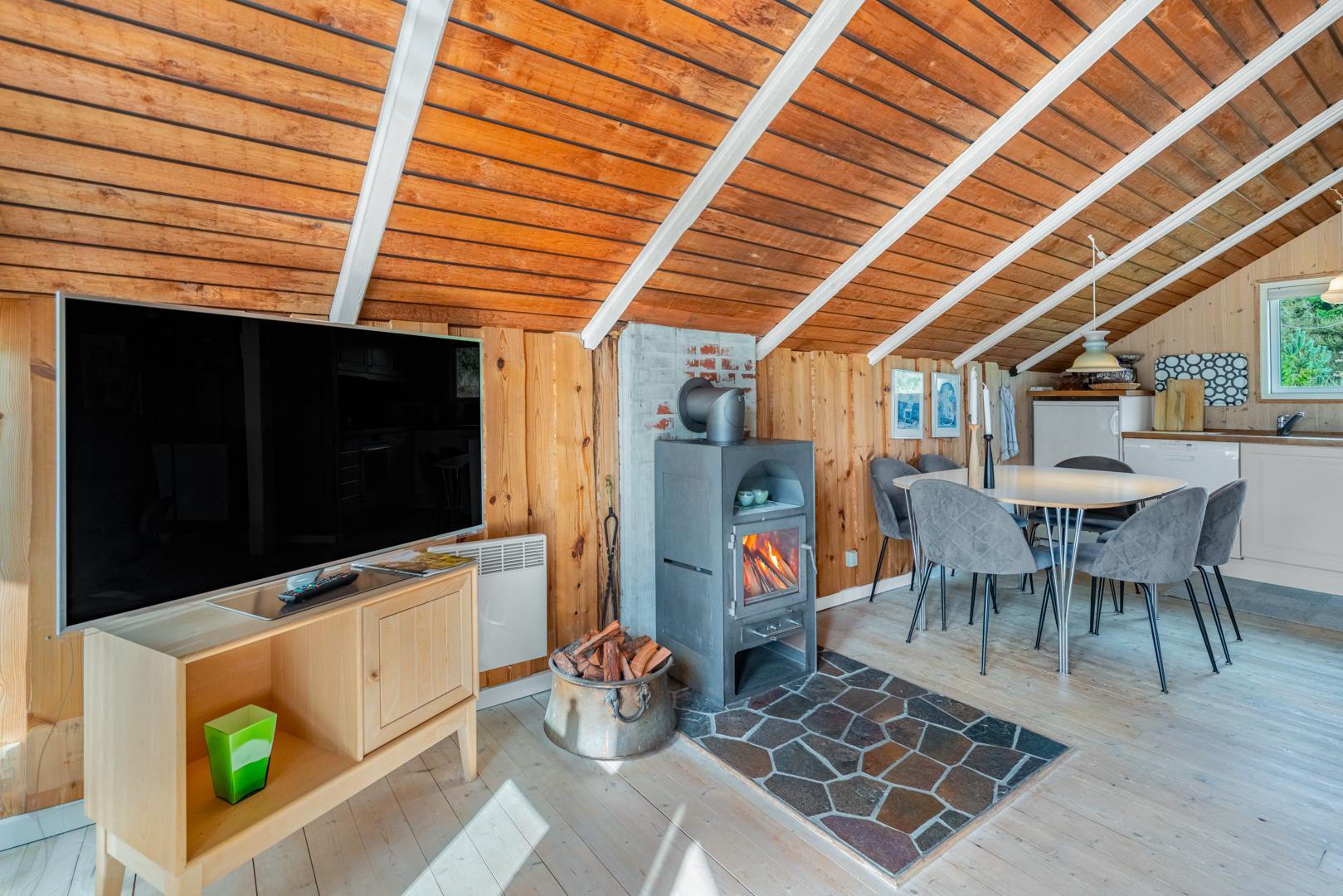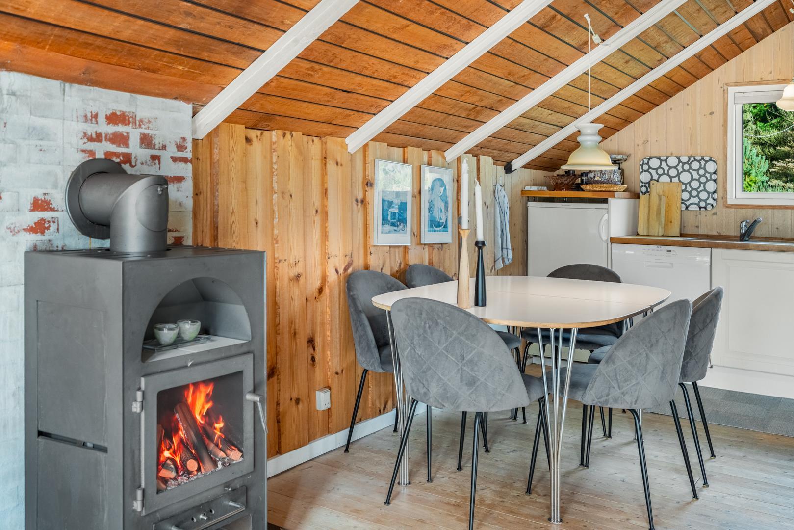 Hyggelig og yderst velholdt Kalmar feriehus med dejlig syd/vest vendt træterrasse, beliggende på en rolig og stor naturgrund meget tæt ved heden. Feriehuset fremstår overalt lyst og venligt, køkken/alrummet ligger i åben forbindelse til stuen med brændeovn.