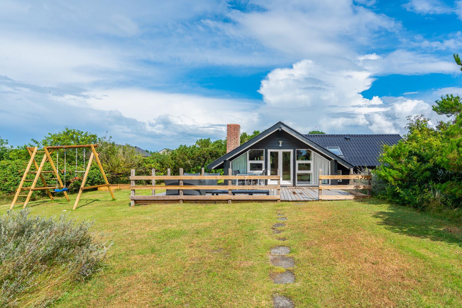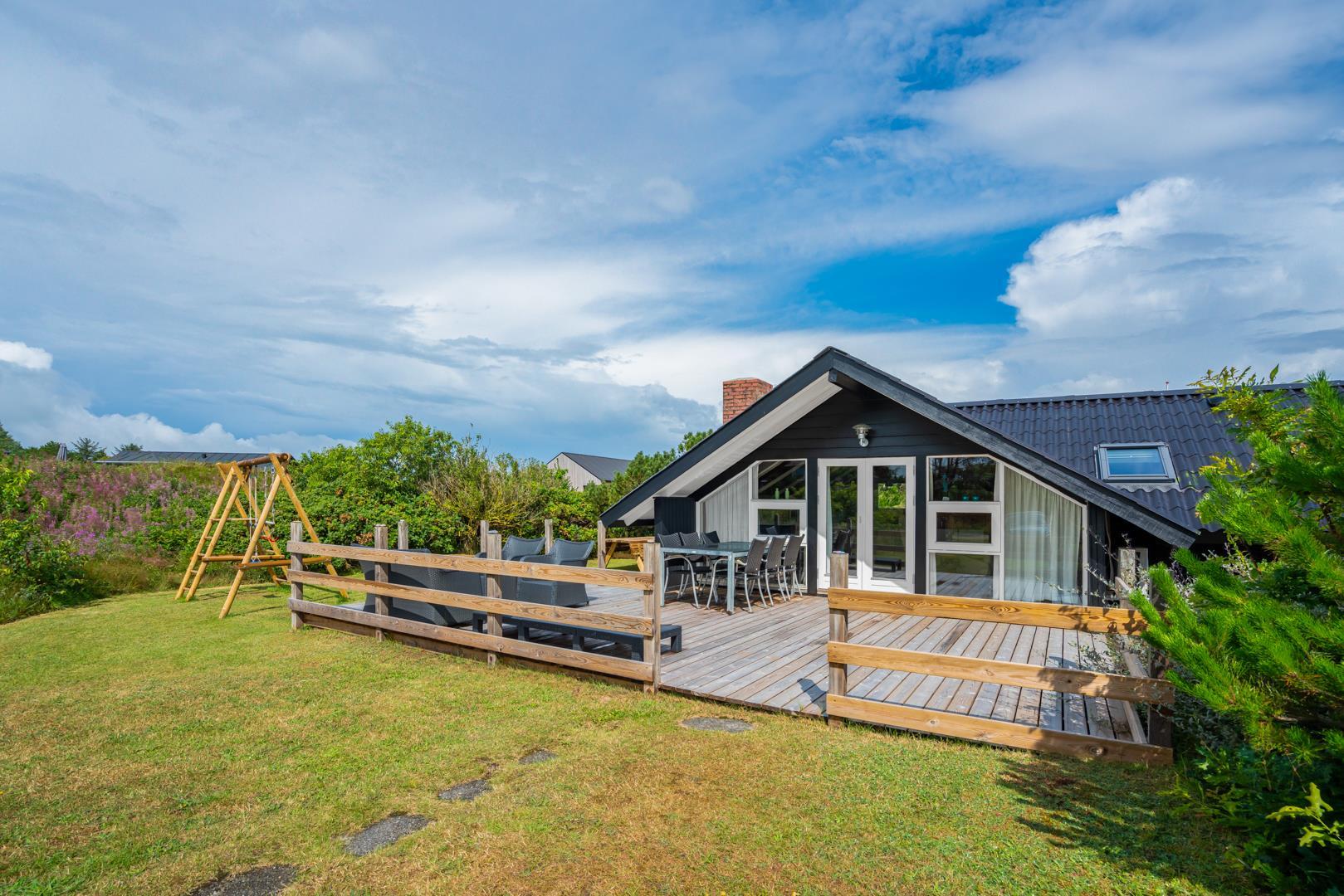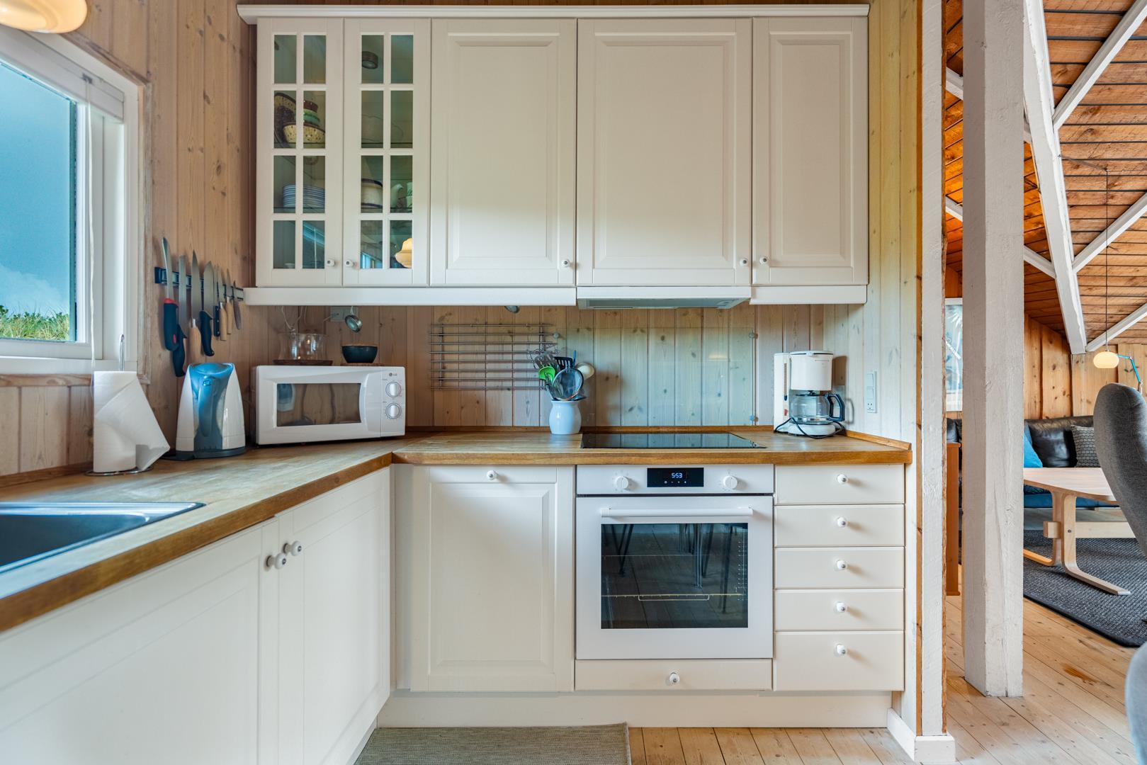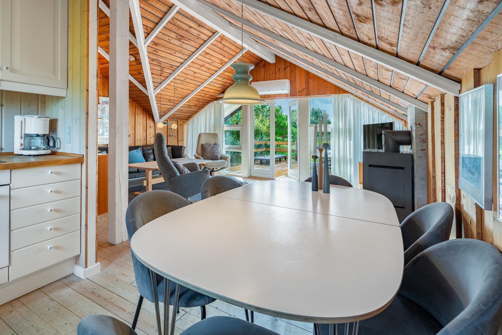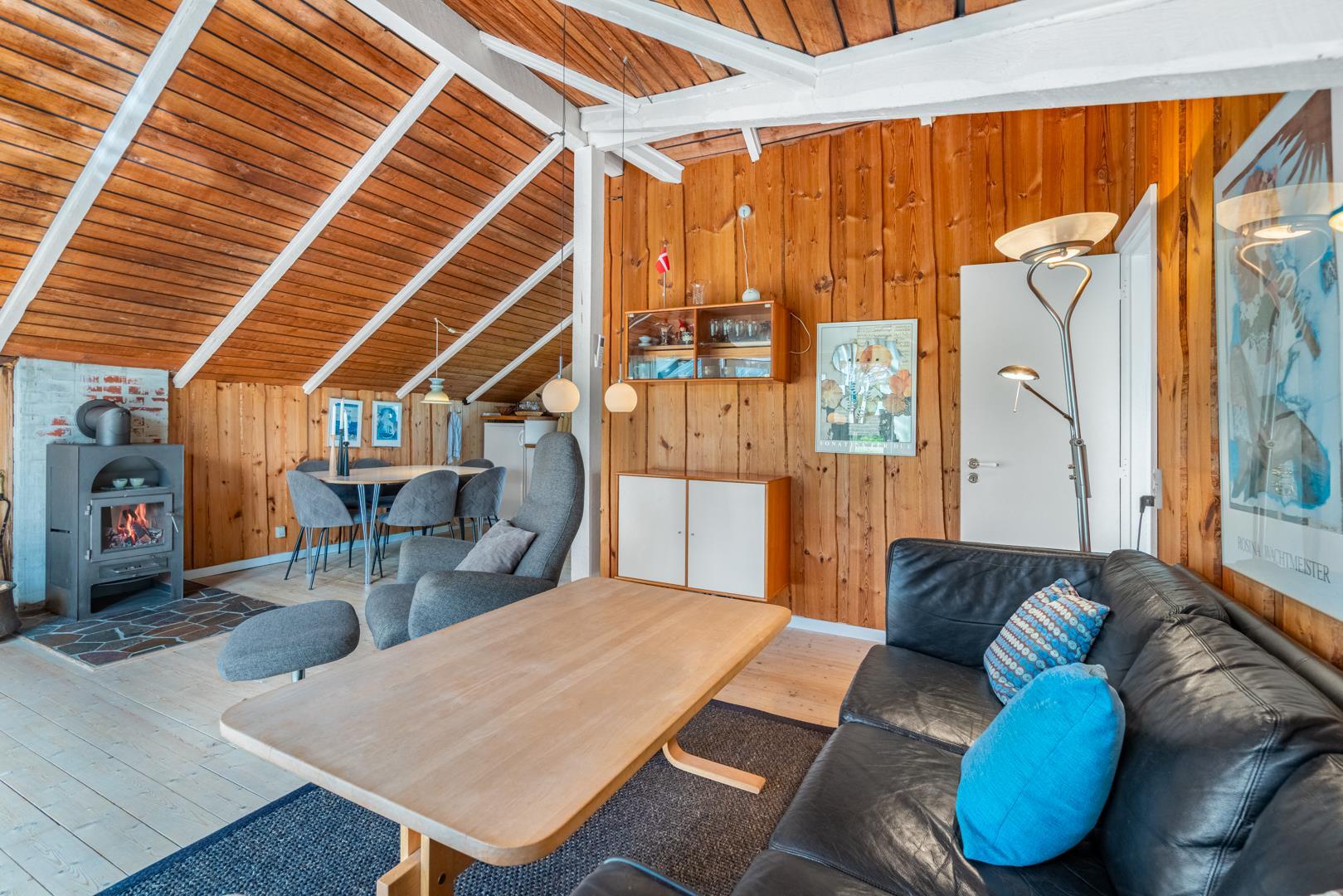 Hyggelig og yderst velholdt Kalmar feriehus med dejlig syd/vest vendt træterrasse, beliggende på en rolig og stor naturgrund meget tæt ved heden. Feriehuset fremstår overalt lyst og venligt, køkken/alrummet ligger i åben forbindelse til stuen med brændeovn.