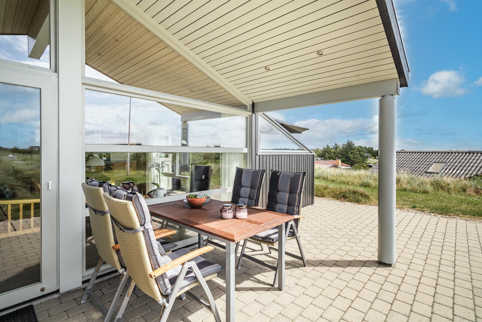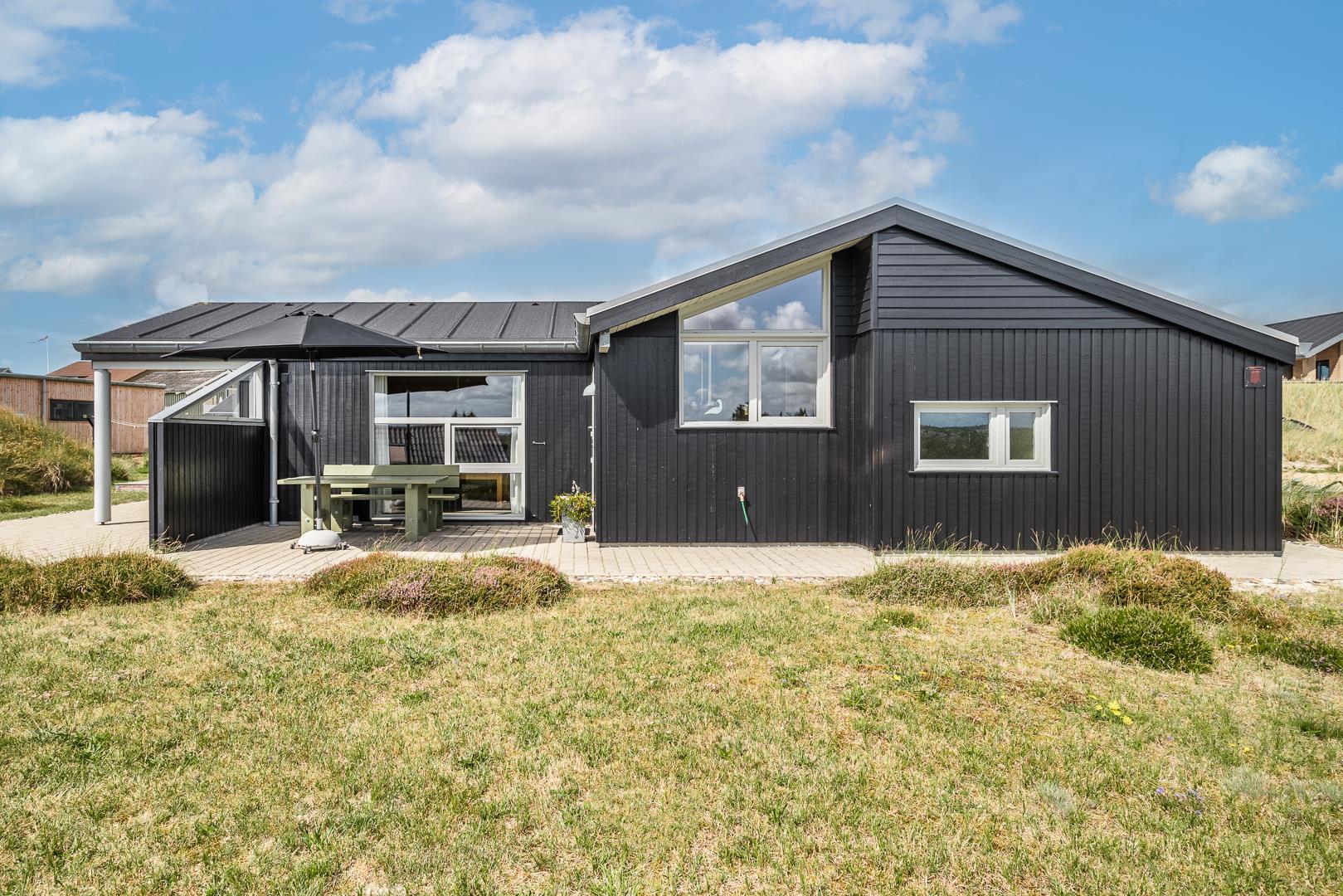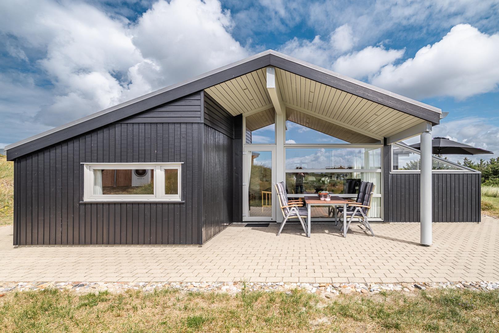 Dette højtbeliggende og meget indbydende sommerhus Høgevej 25 i Henne Strand byder på en enestående udsigt over både Lyngbos Hede og den smukke Blåbjerg Plantage.
