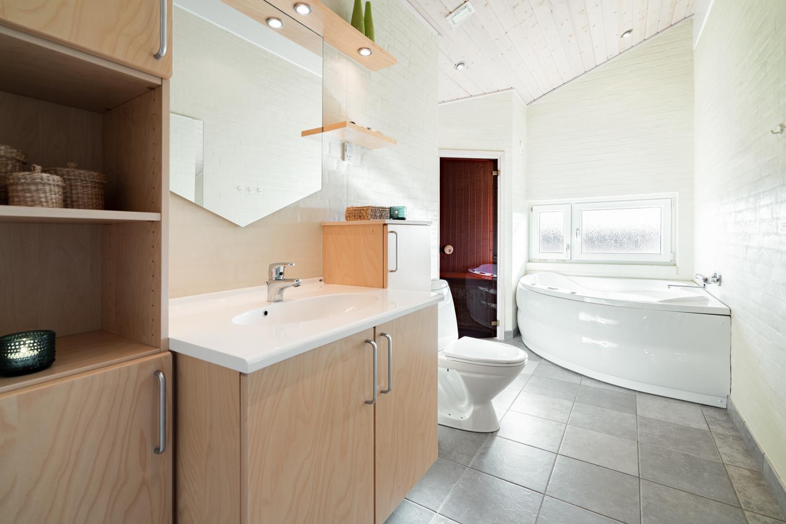 Her finder du tre gode soveværelser med behagelige dobbeltsenge, et stort og flot badeværelse med spa og adgang til husets egen sauna – oplagt til afslapning efter en dag ved stranden eller i klitterne. Derudover har huset et ekstra gæstetoilet – praktisk, især hvis I er flere af sted.