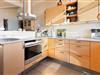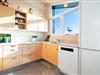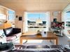 Køkkenet ligger i åben forbindelse med den smagfuldt indrettede stue, hvor brændeovnen og store vinduespartier skaber en varm og lys atmosfære. Herfra er der direkte udgang til en stor og delvist overdækket terrasse med fantastisk udsigt – perfekt til morgenkaffen, grillmiddage og solnedgange i det fri.