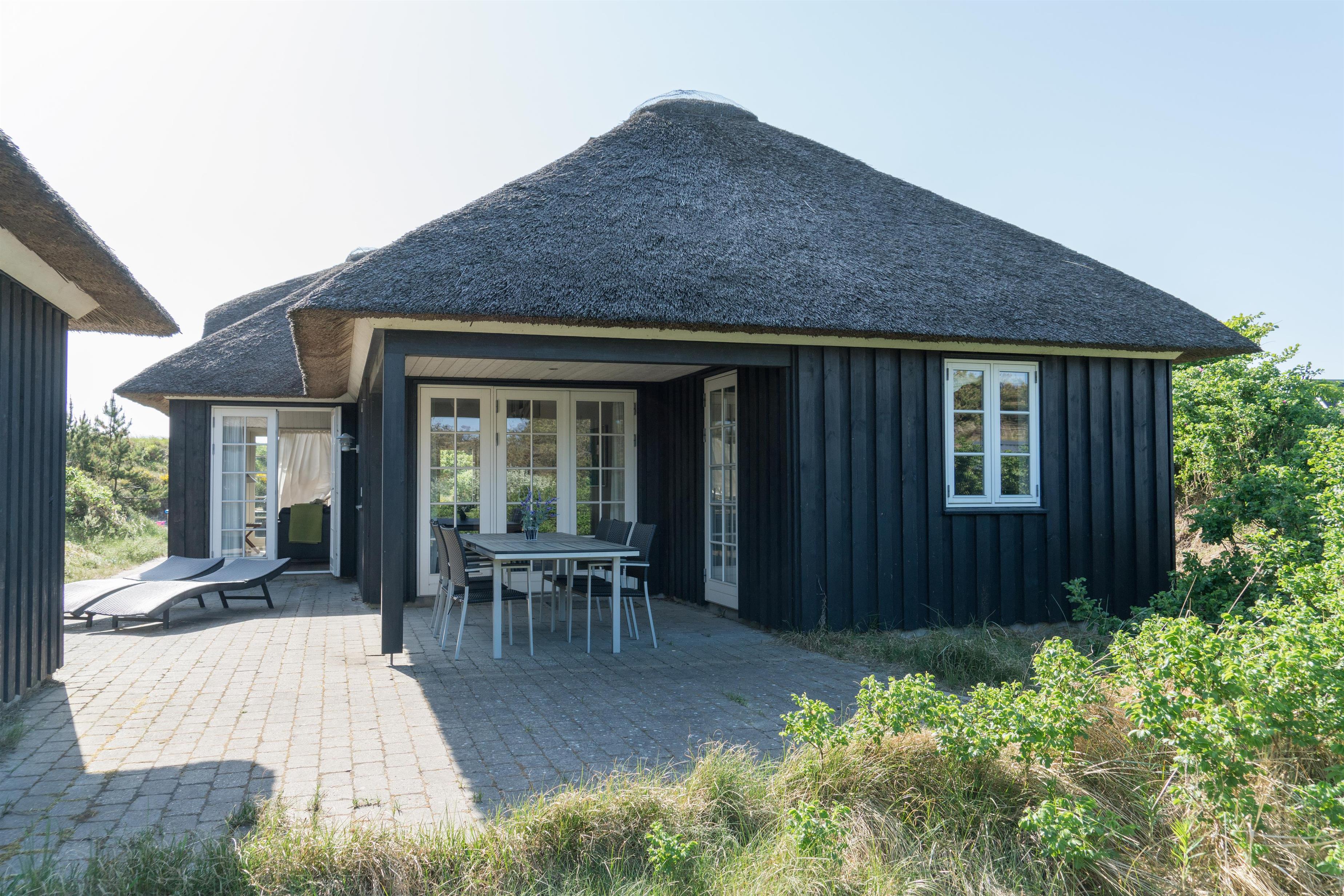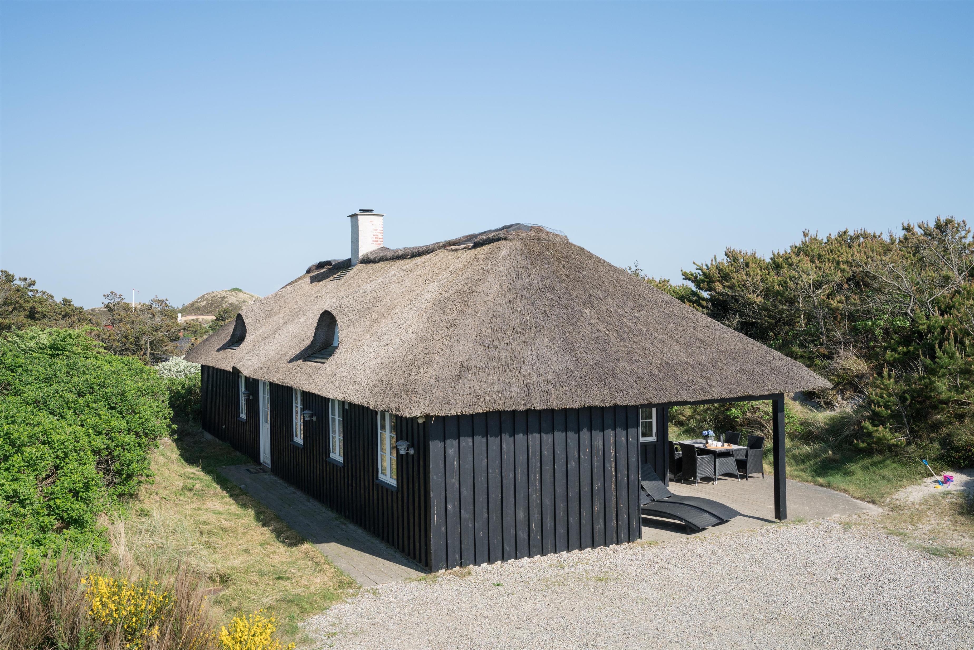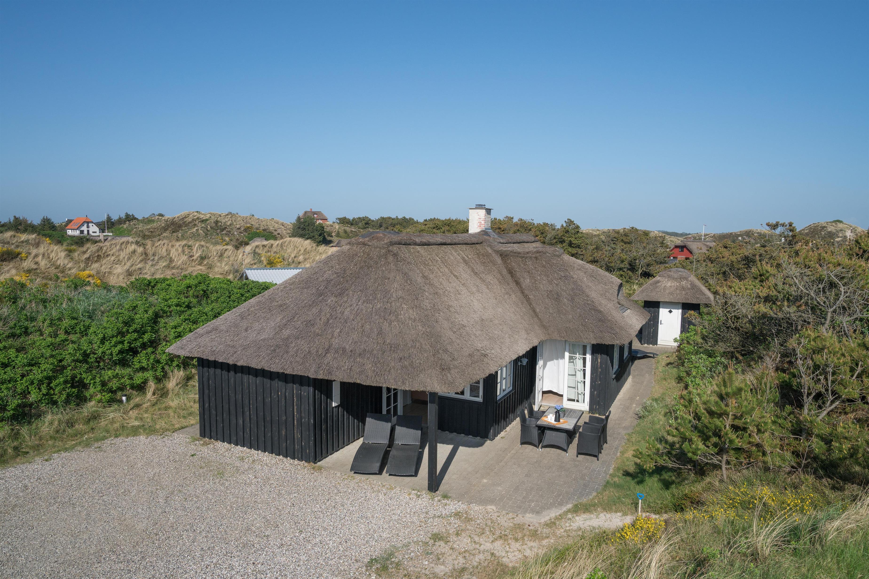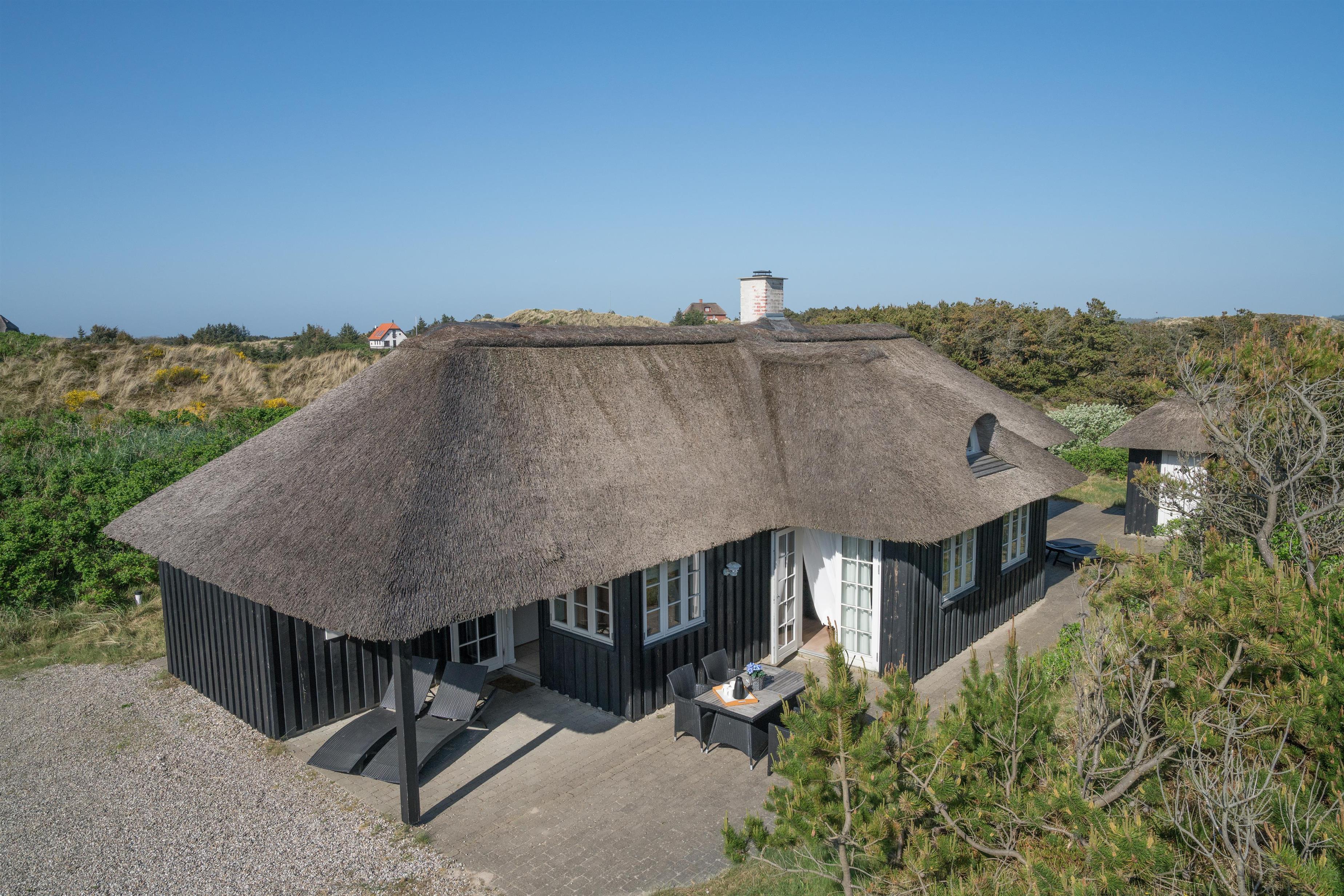 Dejligt feriehus med stråtag og bygget i bondehus stil, beliggende på en dejlig og ugeneret klitgrund for enden af blind stikvej i skønne omgivelser i læ for vinden, kun få minutters gang til Vesterhavet. Huset indeholder stort lækkert køkken med separat fryser og opvaskemaskine. Stue med fladskærms TV og brændeovn. Der forefindes hems. I huset er der loft til kip og vinduer i loftet sørger for et godt lys. Herudover 3 soveværelser med dobbeltsenge, fordelt på 2 afdelinger. Stue samt alle værelser er med trægulve, køkken og gang med klinker. Her tilbydes 2 badeværelser, det ene med spa, sauna, vaskemaskine og tørretumbler. Dejlig entre og stort depotrum. Ugenerede og læfulde terrasser som både er åbne og overdækkede.