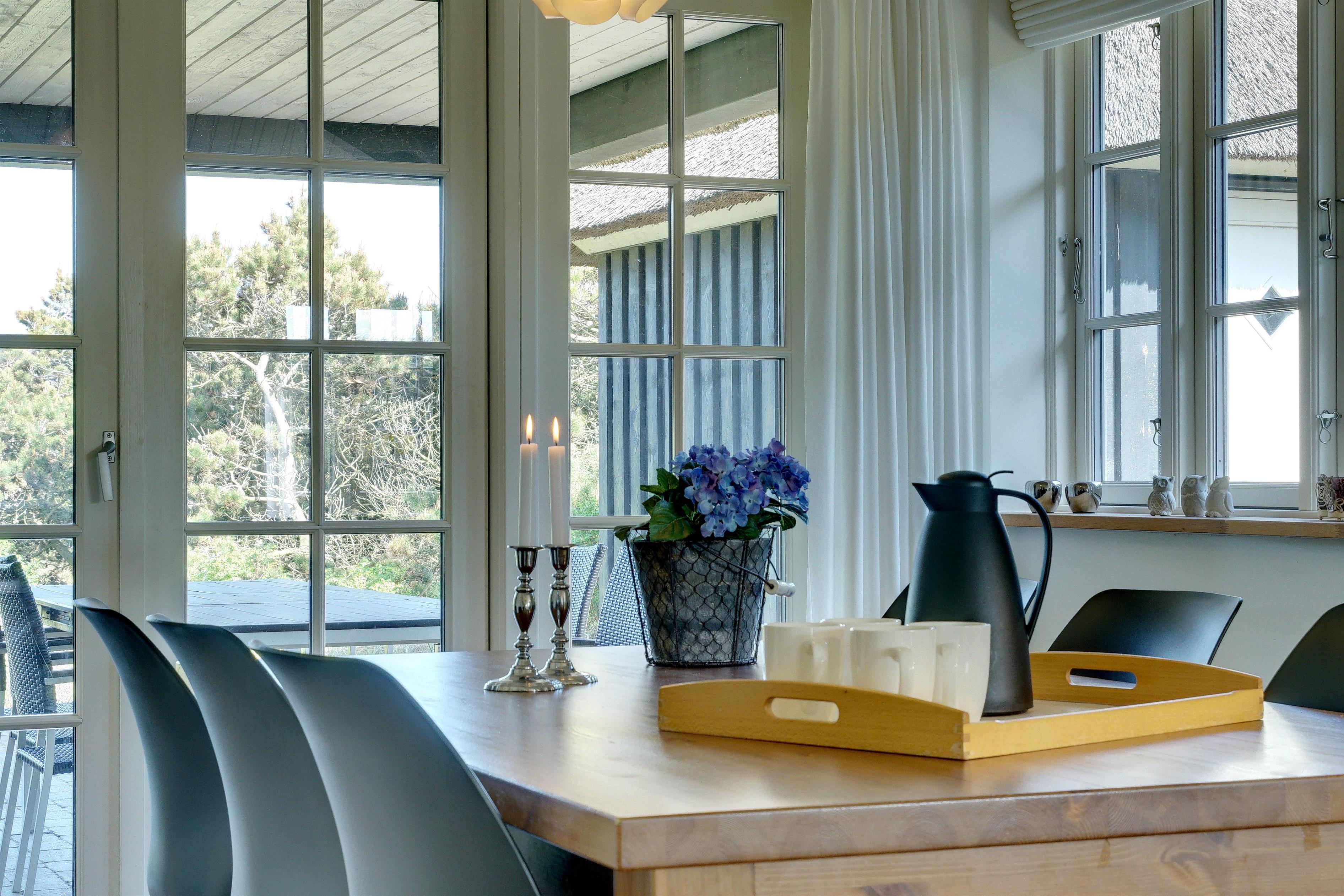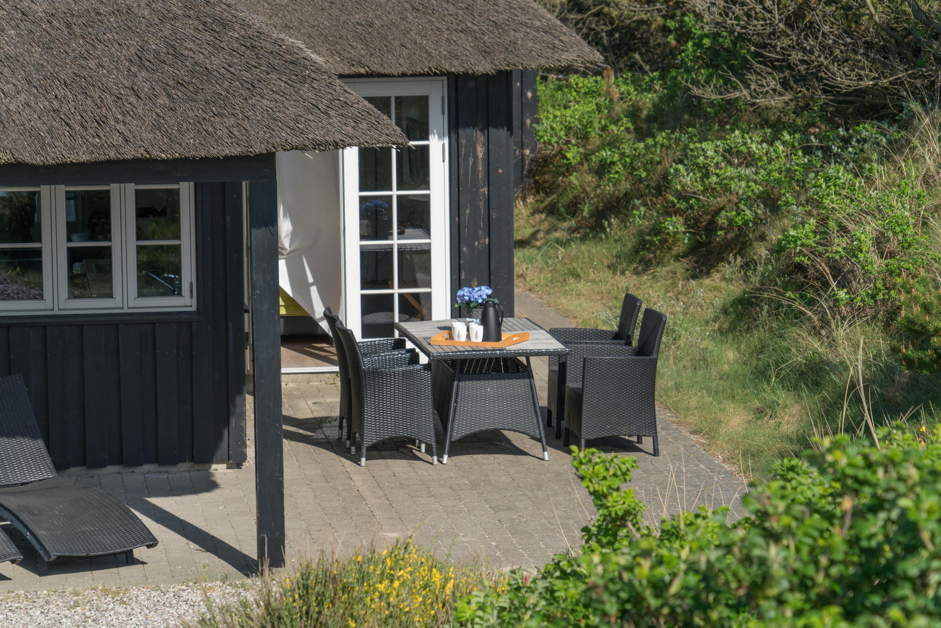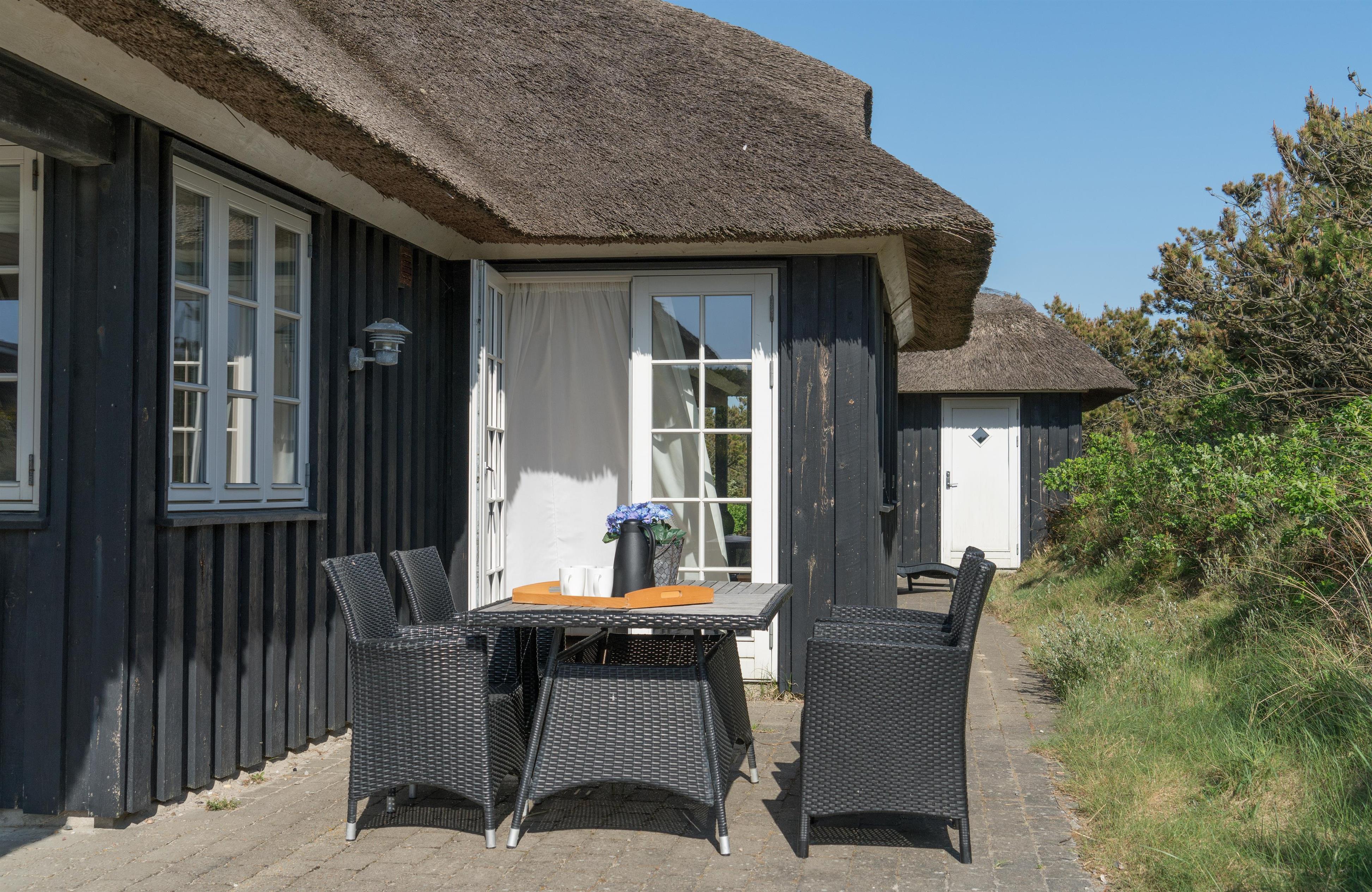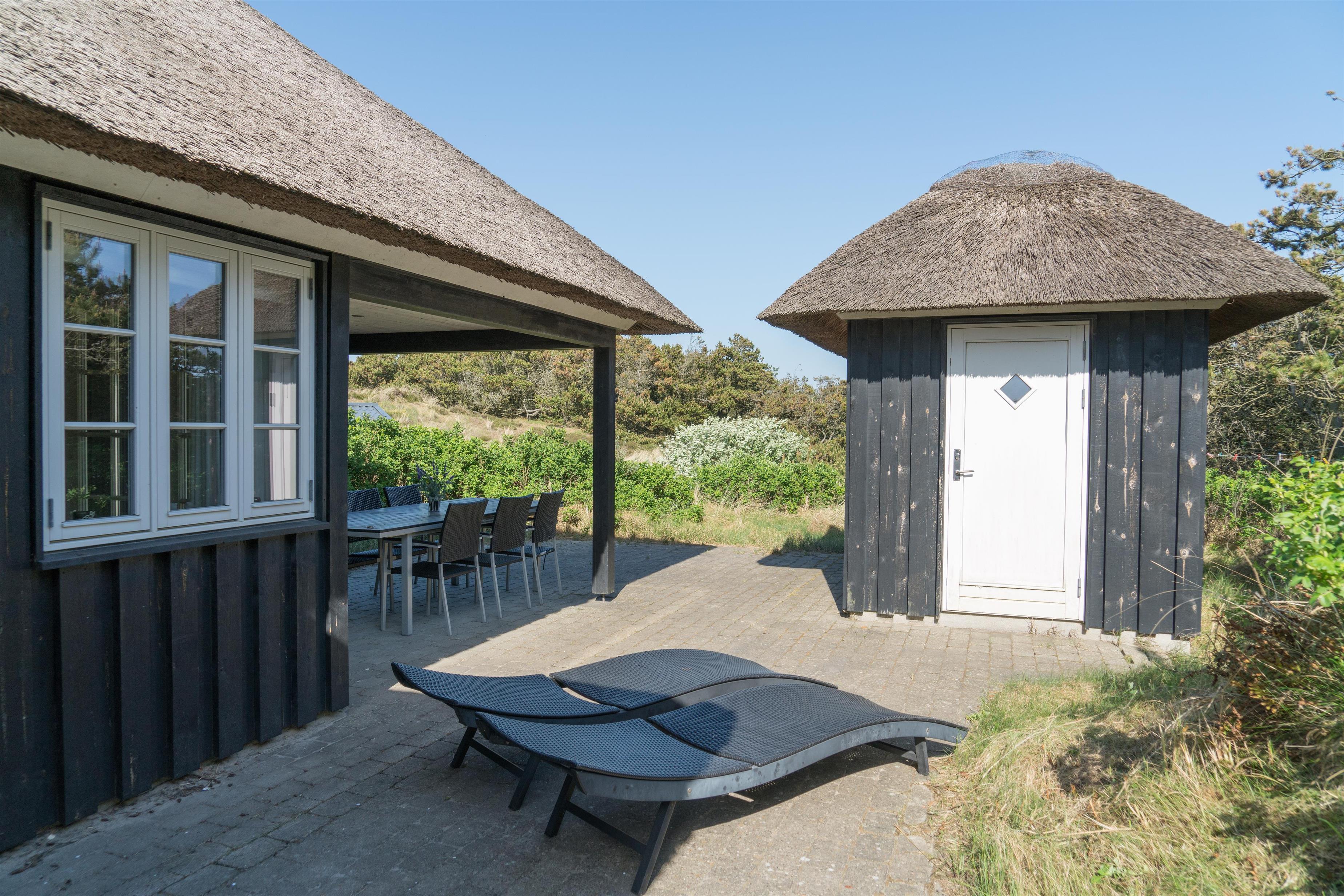 Dejligt feriehus med stråtag og bygget i bondehus stil, beliggende på en dejlig og ugeneret klitgrund for enden af blind stikvej i skønne omgivelser i læ for vinden, kun få minutters gang til Vesterhavet. Huset indeholder stort lækkert køkken med separat fryser og opvaskemaskine. Stue med fladskærms TV og brændeovn. Der forefindes hems. I huset er der loft til kip og vinduer i loftet sørger for et godt lys. Herudover 3 soveværelser med dobbeltsenge, fordelt på 2 afdelinger. Stue samt alle værelser er med trægulve, køkken og gang med klinker. Her tilbydes 2 badeværelser, det ene med spa, sauna, vaskemaskine og tørretumbler. Dejlig entre og stort depotrum. Ugenerede og læfulde terrasser som både er åbne og overdækkede.