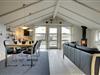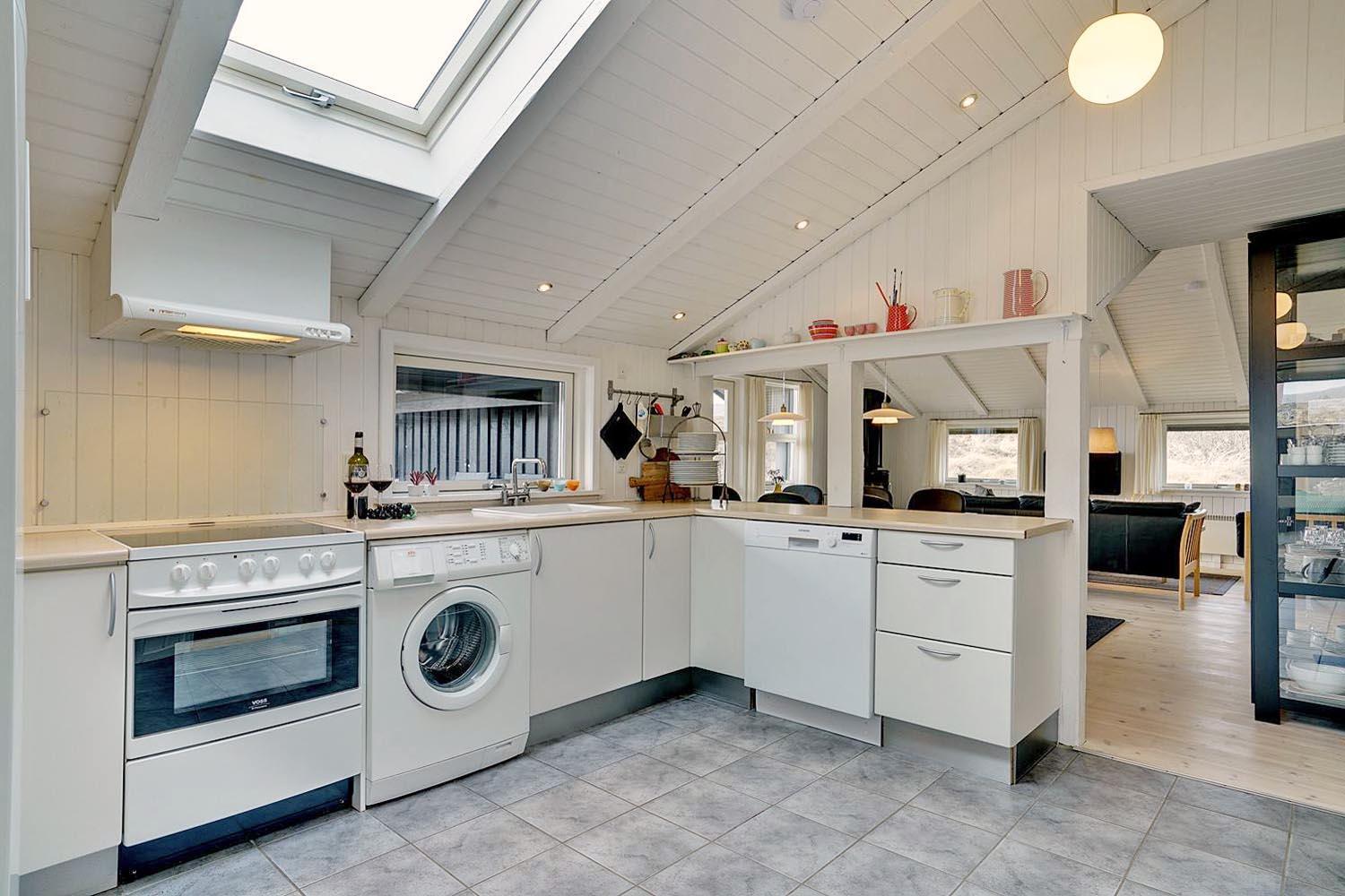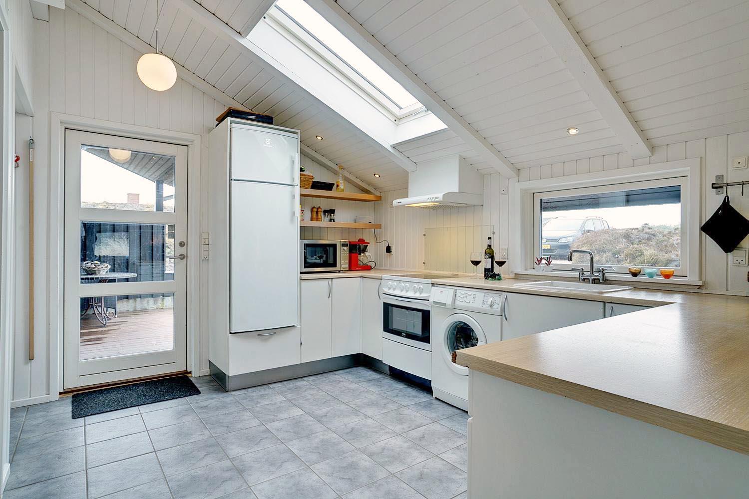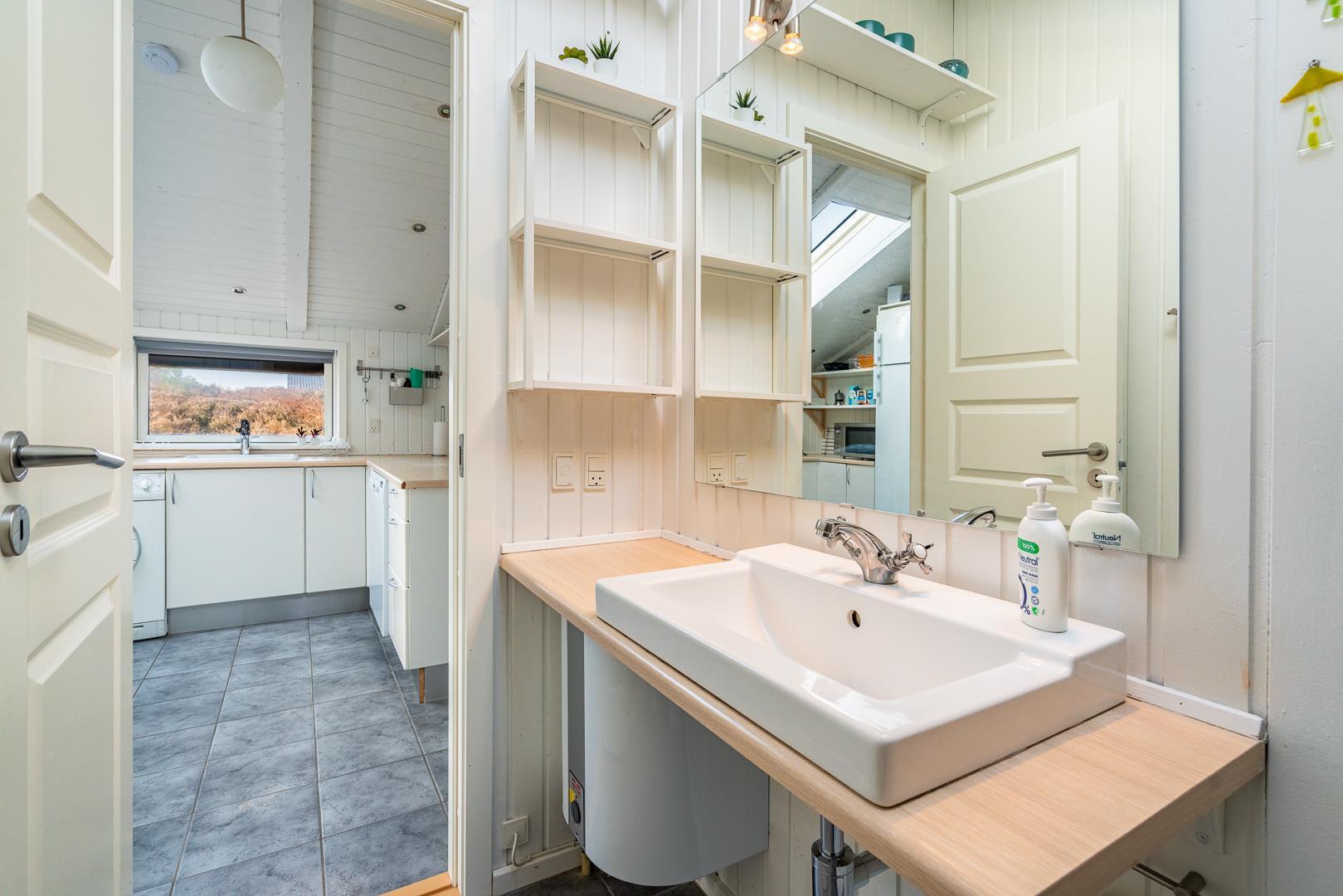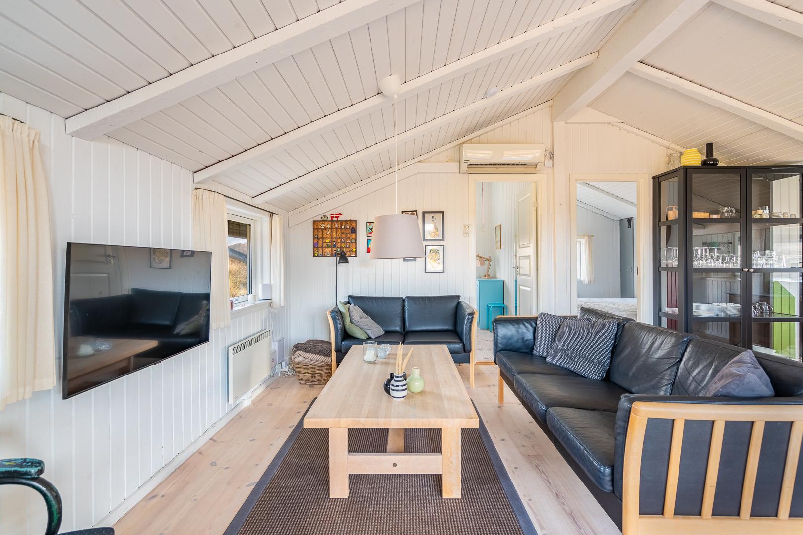 Flot køkken i åbne forbindelse med lyse stue gode møbler, hvorfra udgang til pragtfuld træterrasse som omkranser huset. malet i lyse, venlige farver og er indrettet med gode og flotte møbler. Badeværelse med gulvvarme.
