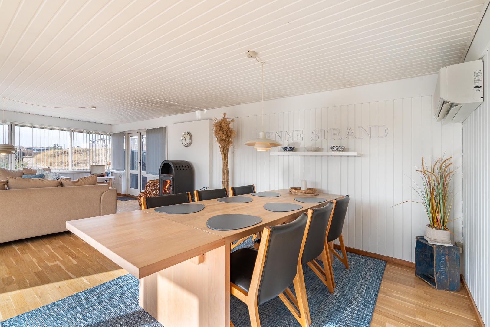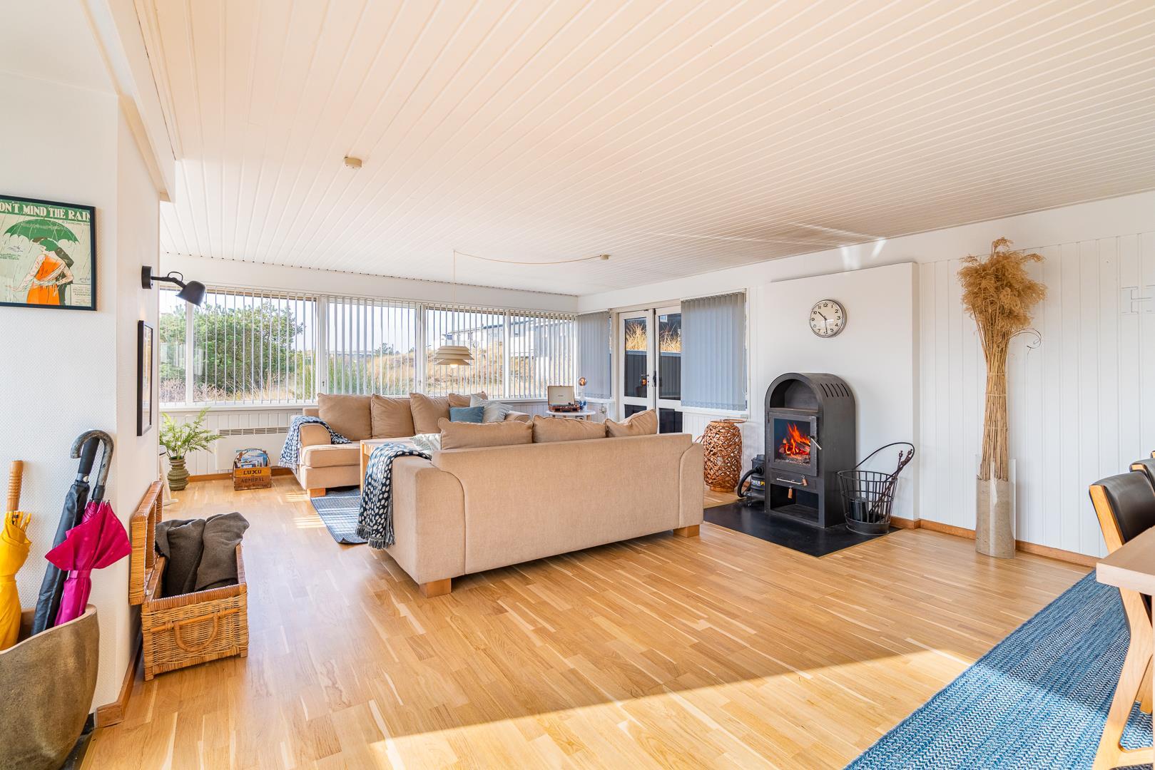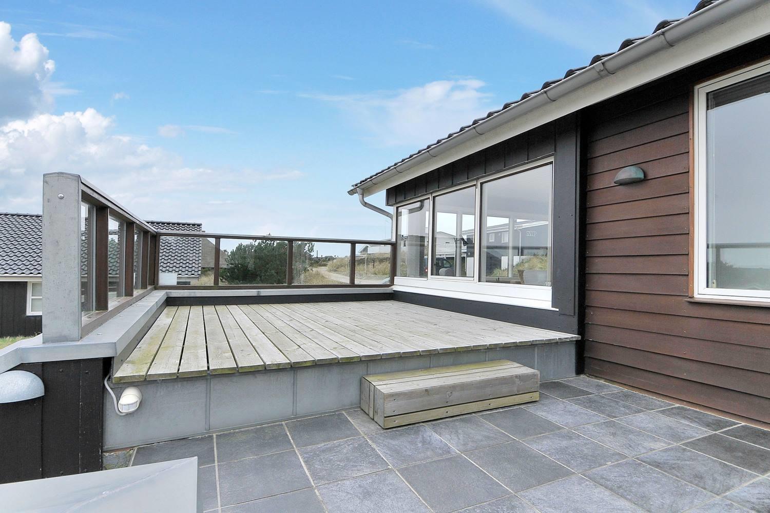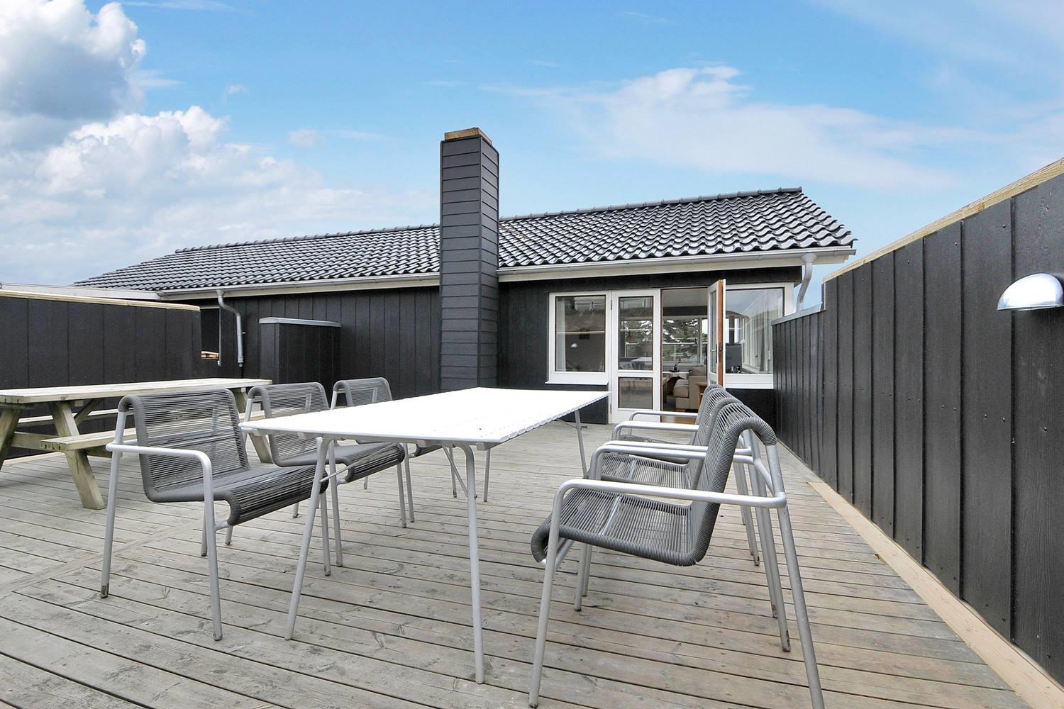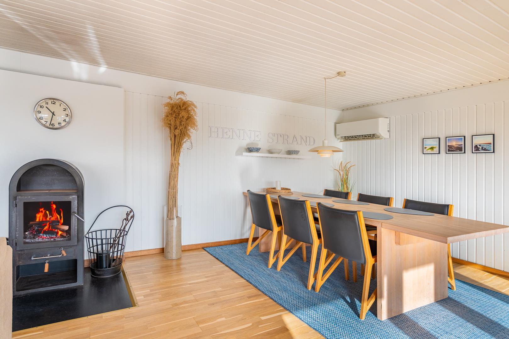 Hyggeligt feriehus med 110 m², tæt på Vesterhavet og Henne Strands centrum, med flere terrasser og 2 badeværelser.