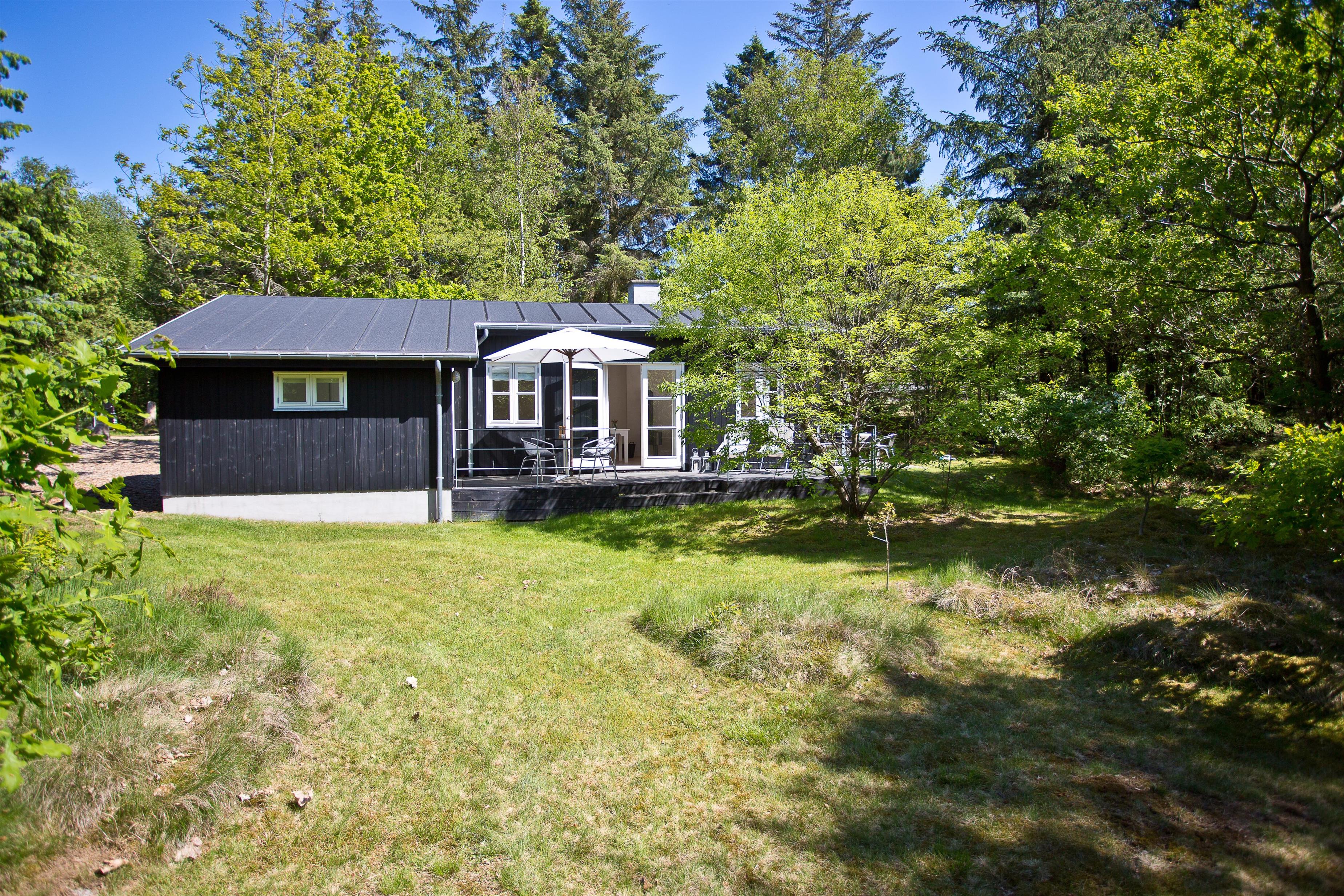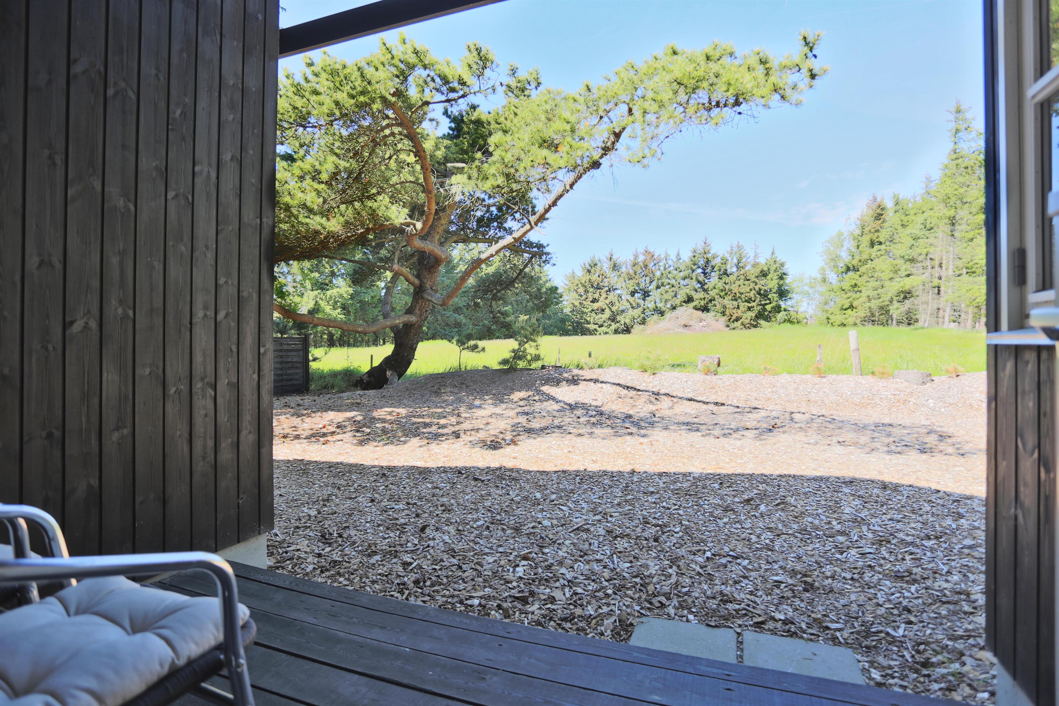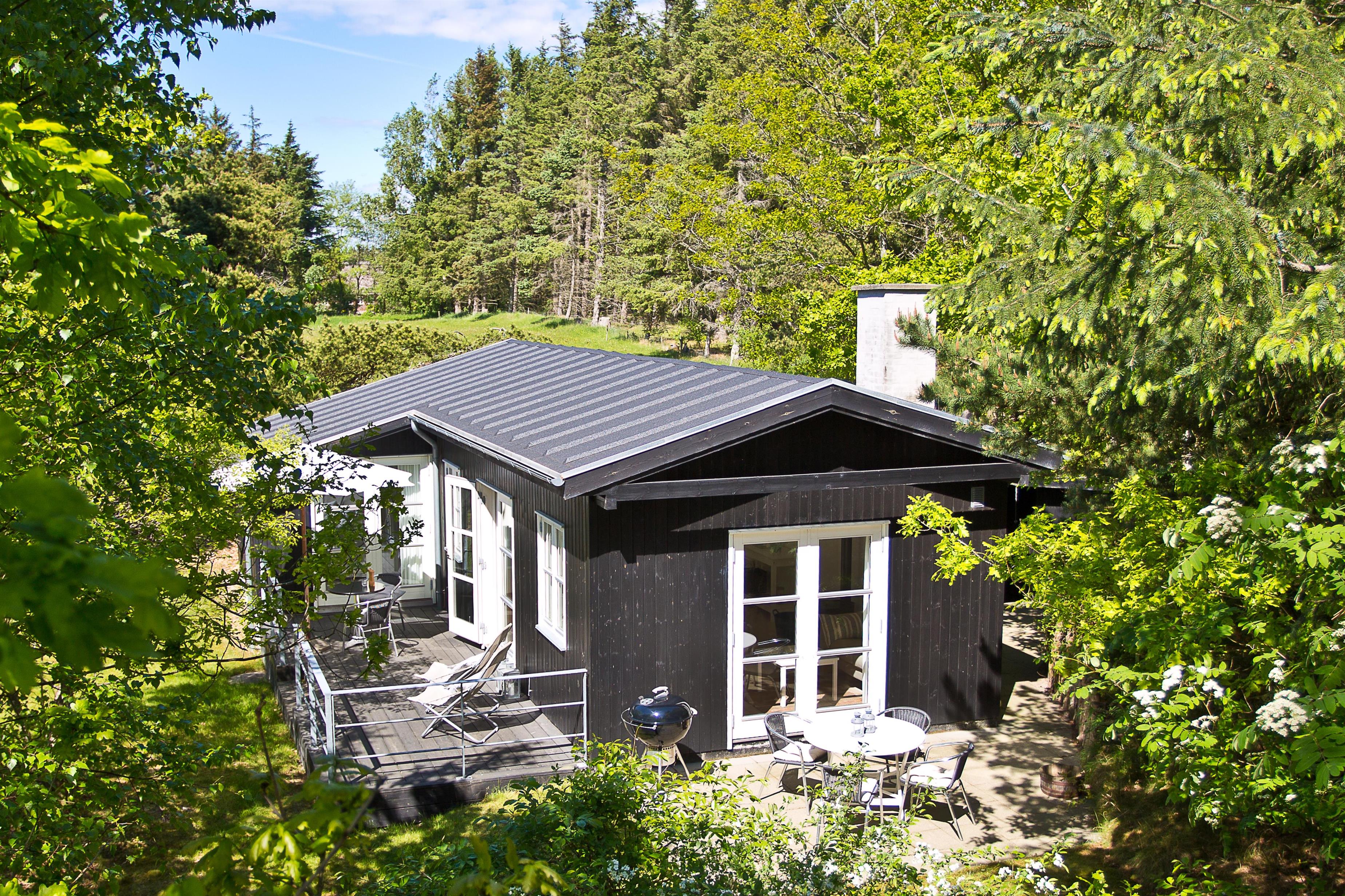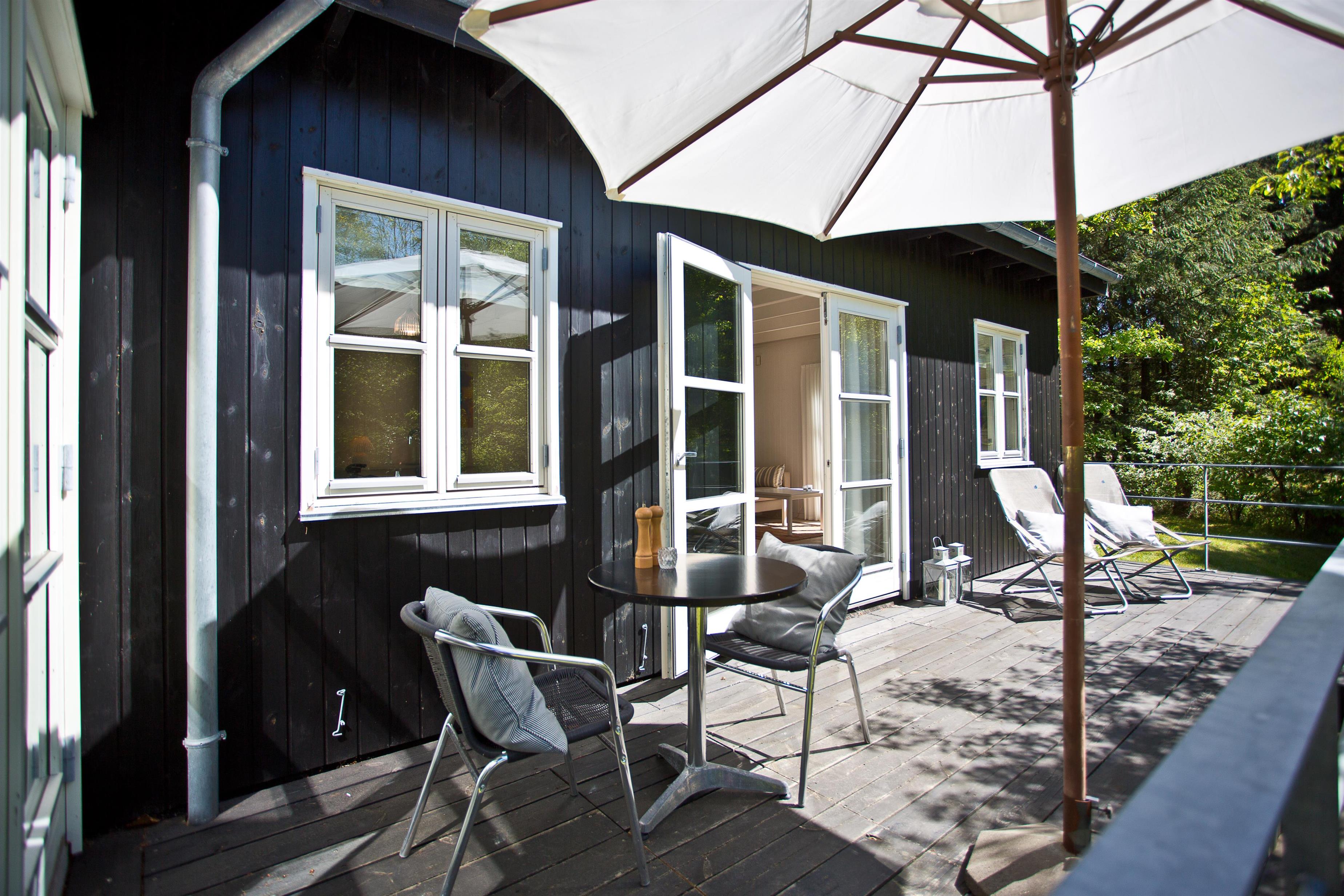 Huset ligger på naturgrund hvor du ugenert kan nyde de dejlige omgivelser. Der er terrasse rundt om huset med havemøbler og grill. Ved indgangen er der også en lille overdækket terrasse med med havestole.