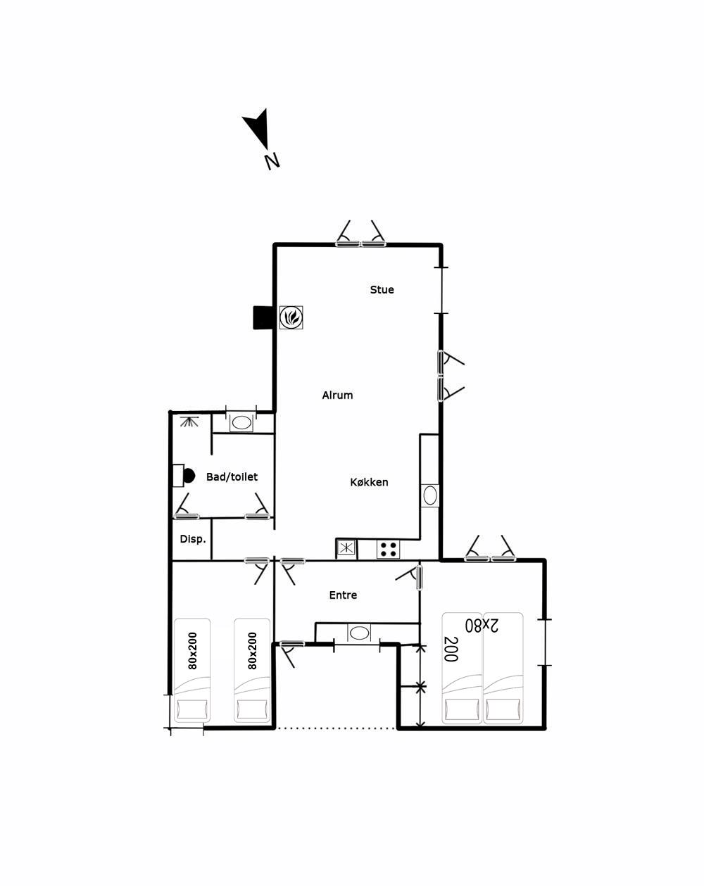 Sengestørrelse: 1 dobbeltseng med 2 madrasser 80 x 200 cm + 2 enkeltsenge 80 x 200 cm