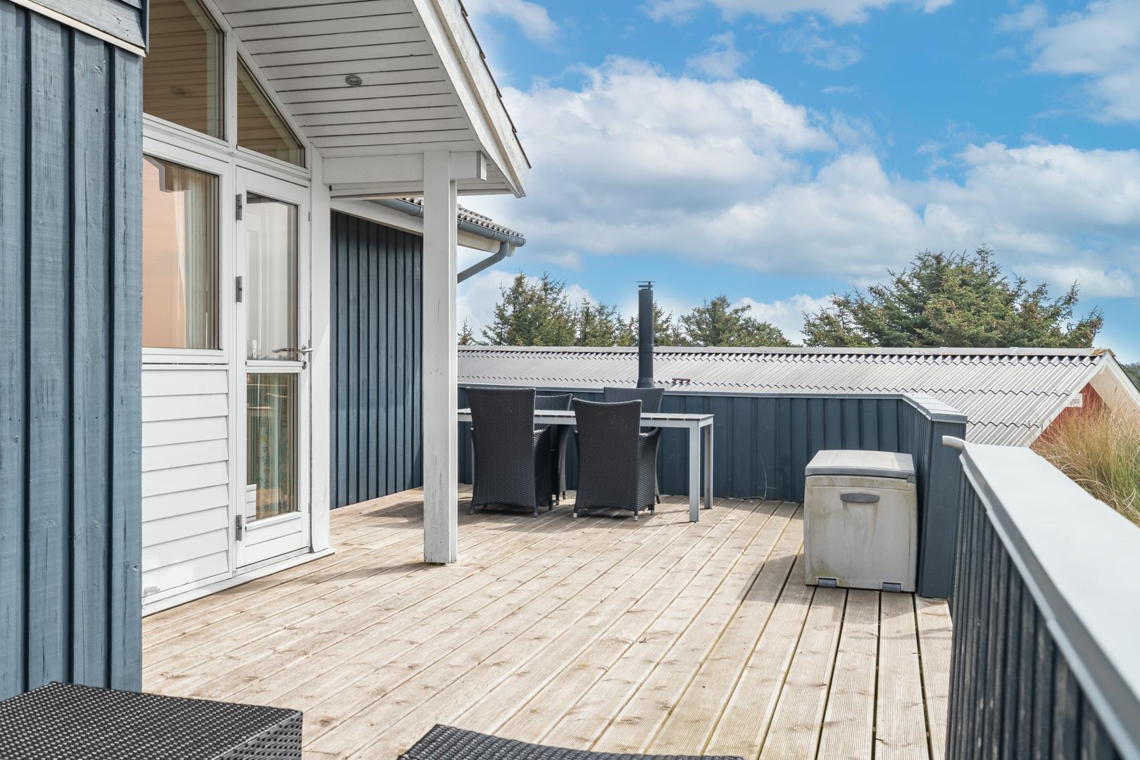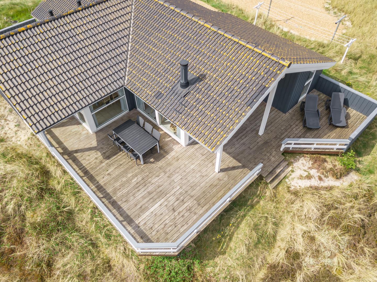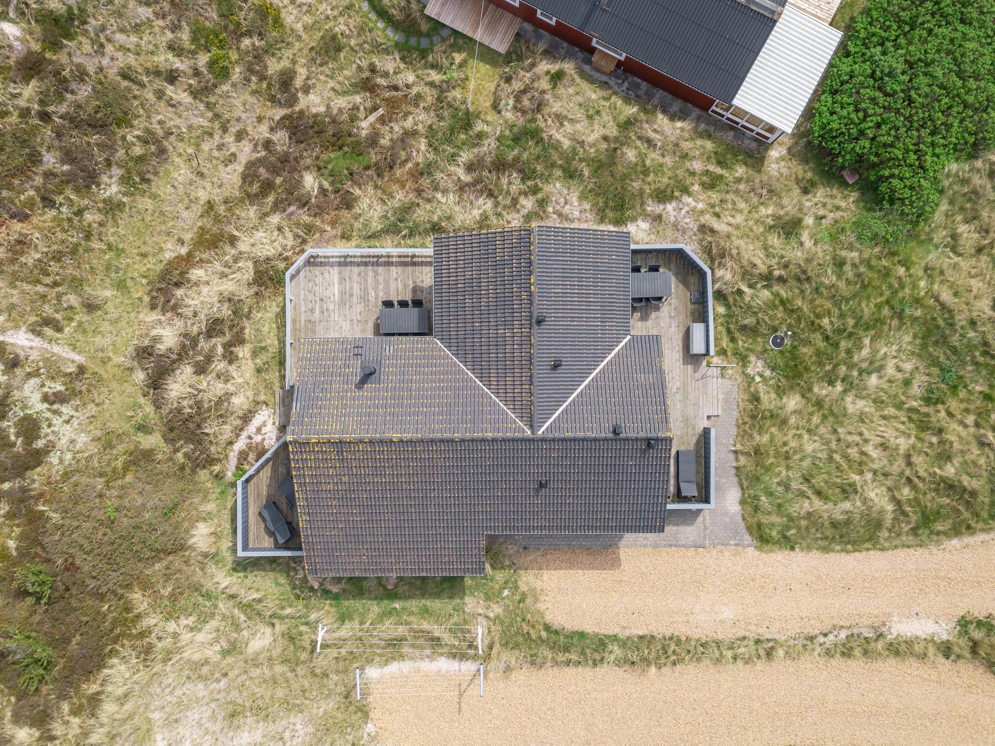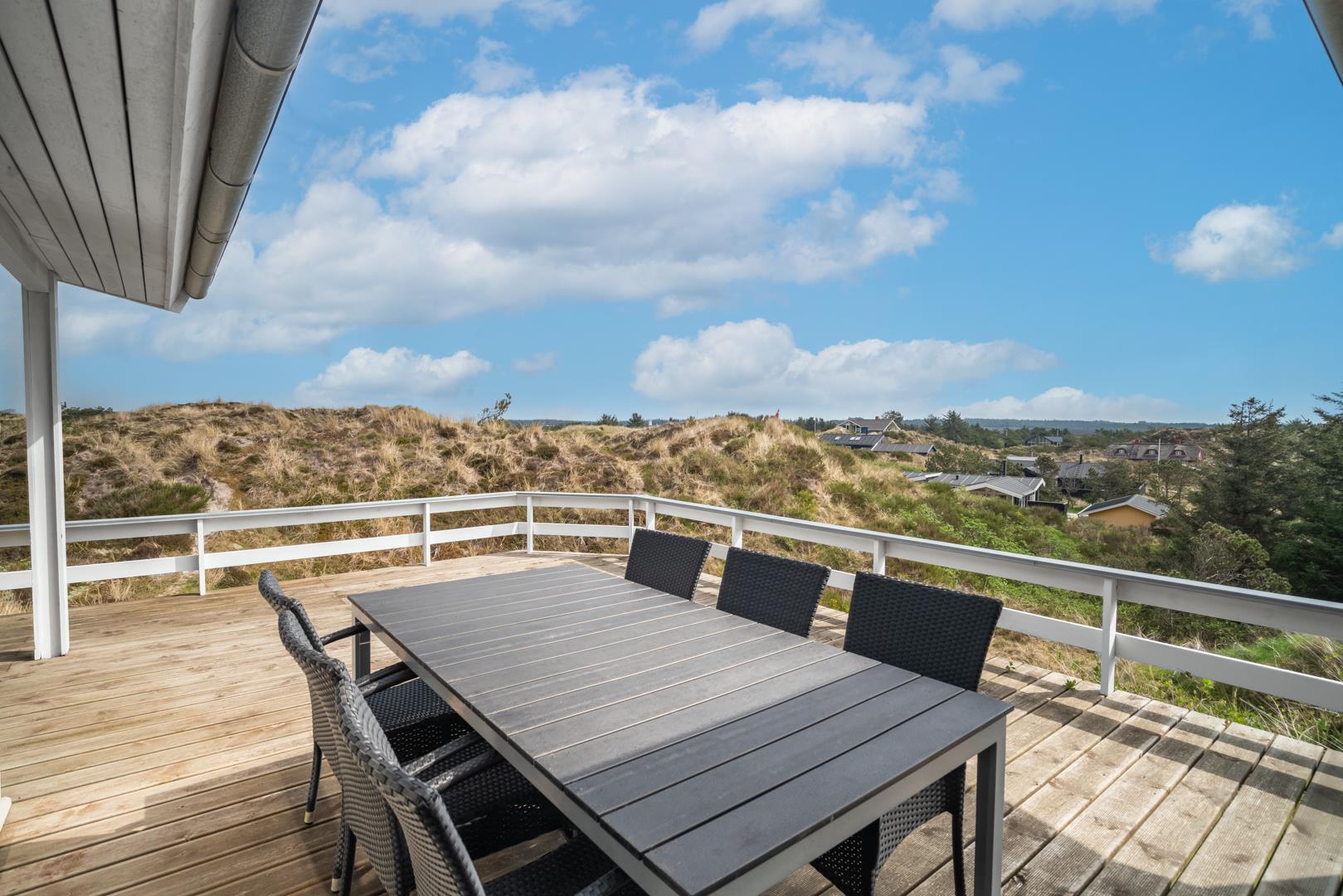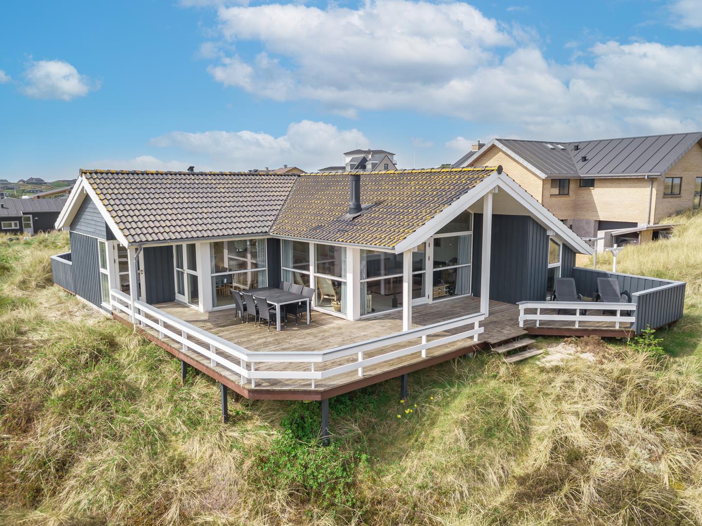 Højt placeret for enden af en blind stikvej, på en kuperet klitgrund, finder du dette velholdte og charmerende feriehus. Fra grunden er der en fantastisk panoramaudsigt over Lyngbos Hede og de omkringliggende klitter – en sjælden og eftertragtet beliggenhed i Henne Strand.
