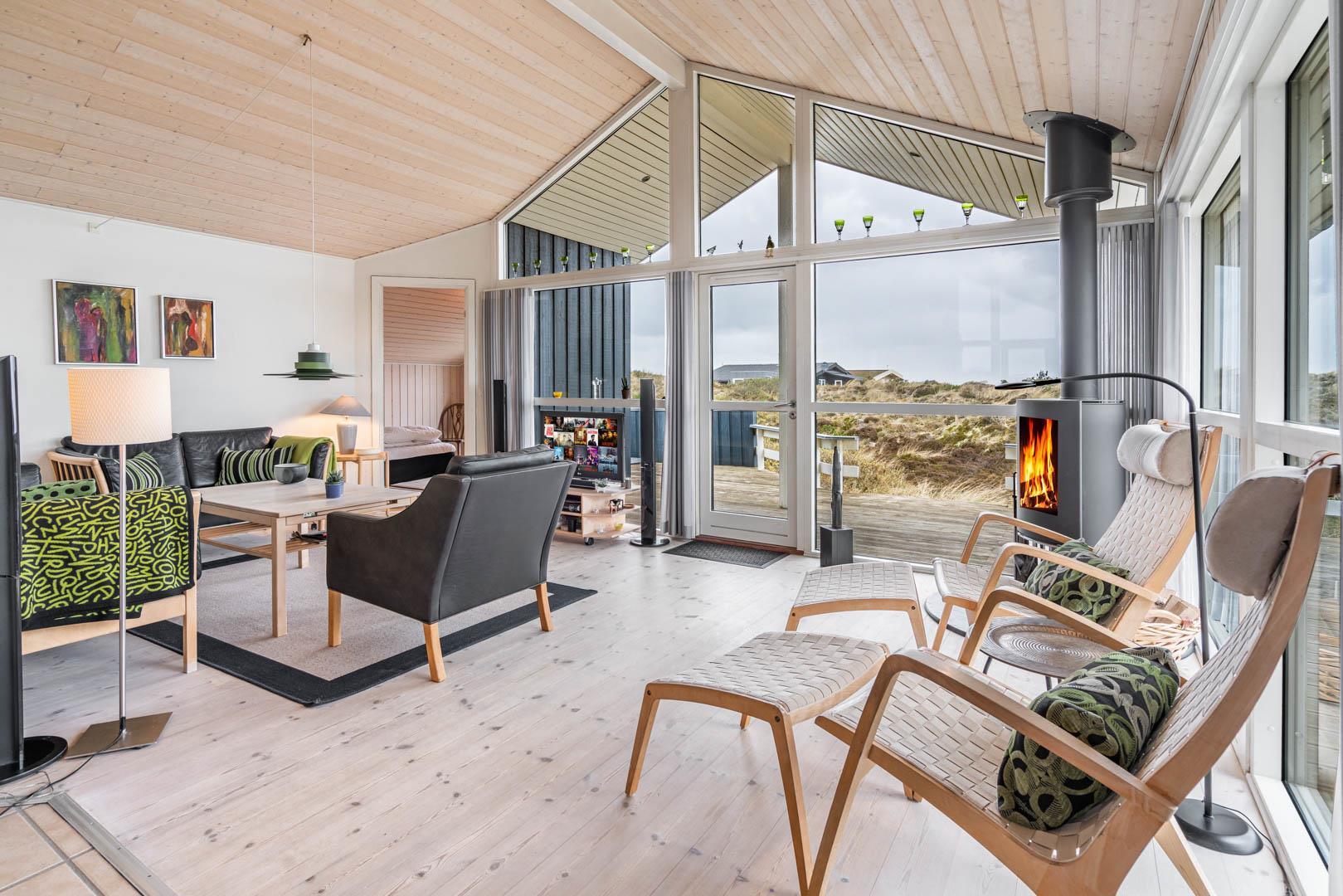Huset byder på et smagfuldt indrettet opholdsrum med store vinduespartier, der giver et fantastisk lysindfald og udsigt til naturen. Fra den rummelige og lyse stue er der direkte udgang til solrige træterrasser, hvor udelivet virkelig kan nydes.
