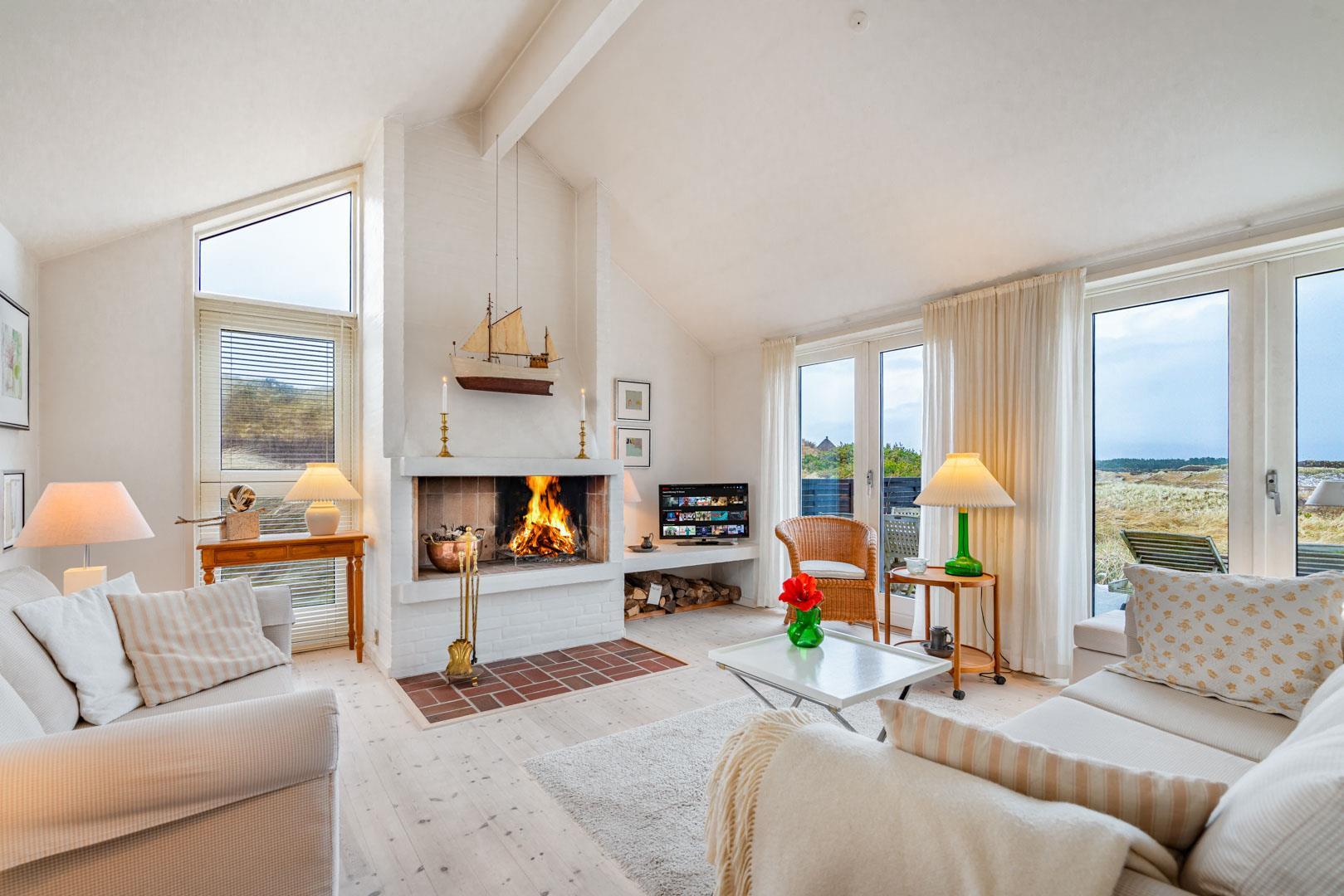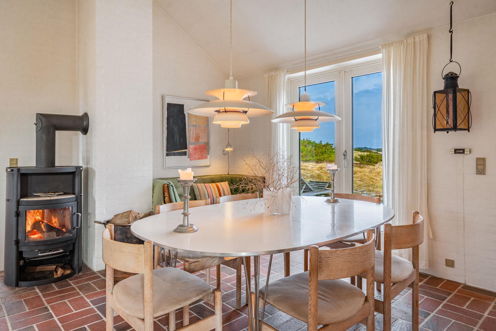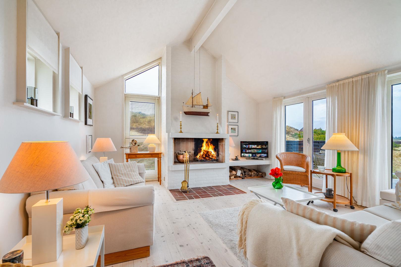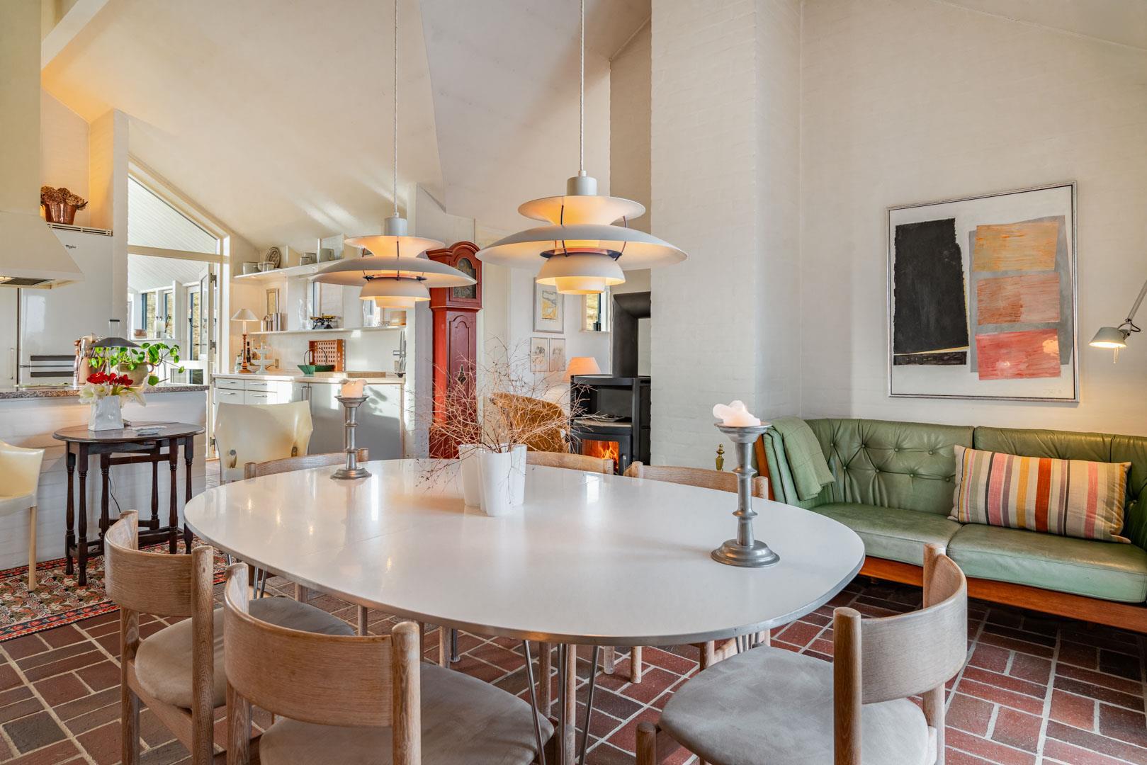 Det lyse og stilfulde sommerhus skaber den perfekte sommerhusstemning i hvert eneste hjørne. Her er en rigtig hyggelig stue med loft til kip og en pejs der indbyder til hyggelige stunder med en god bog. Det åbne og veludstyrede køkken/alrum ligger i forbindelse med spisestuen, her sørger brændeovnen for at sprede varme og hygge til de kolde måneder - et perfekt sted for samvær hvad enten det er over en middag eller et familiespil.