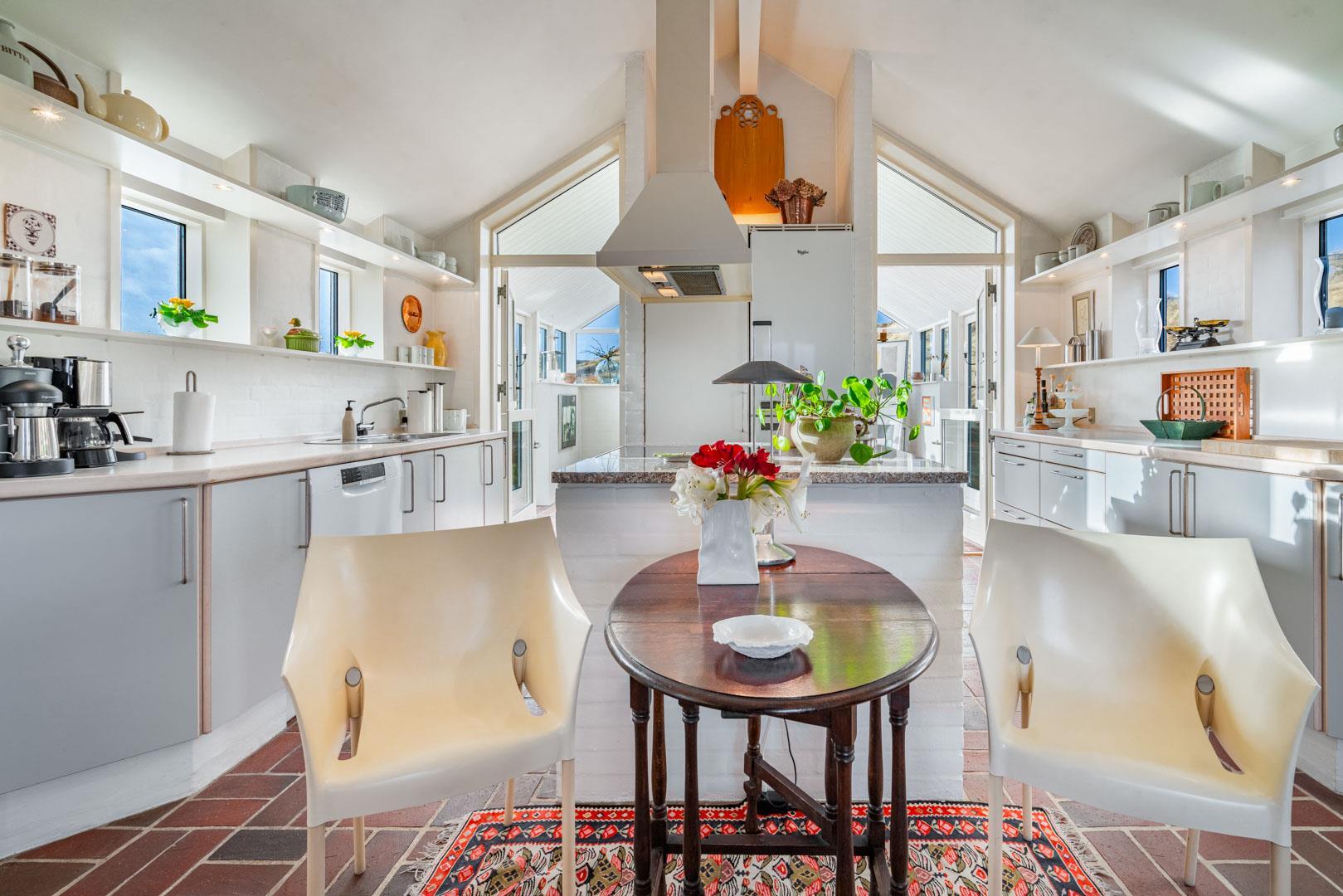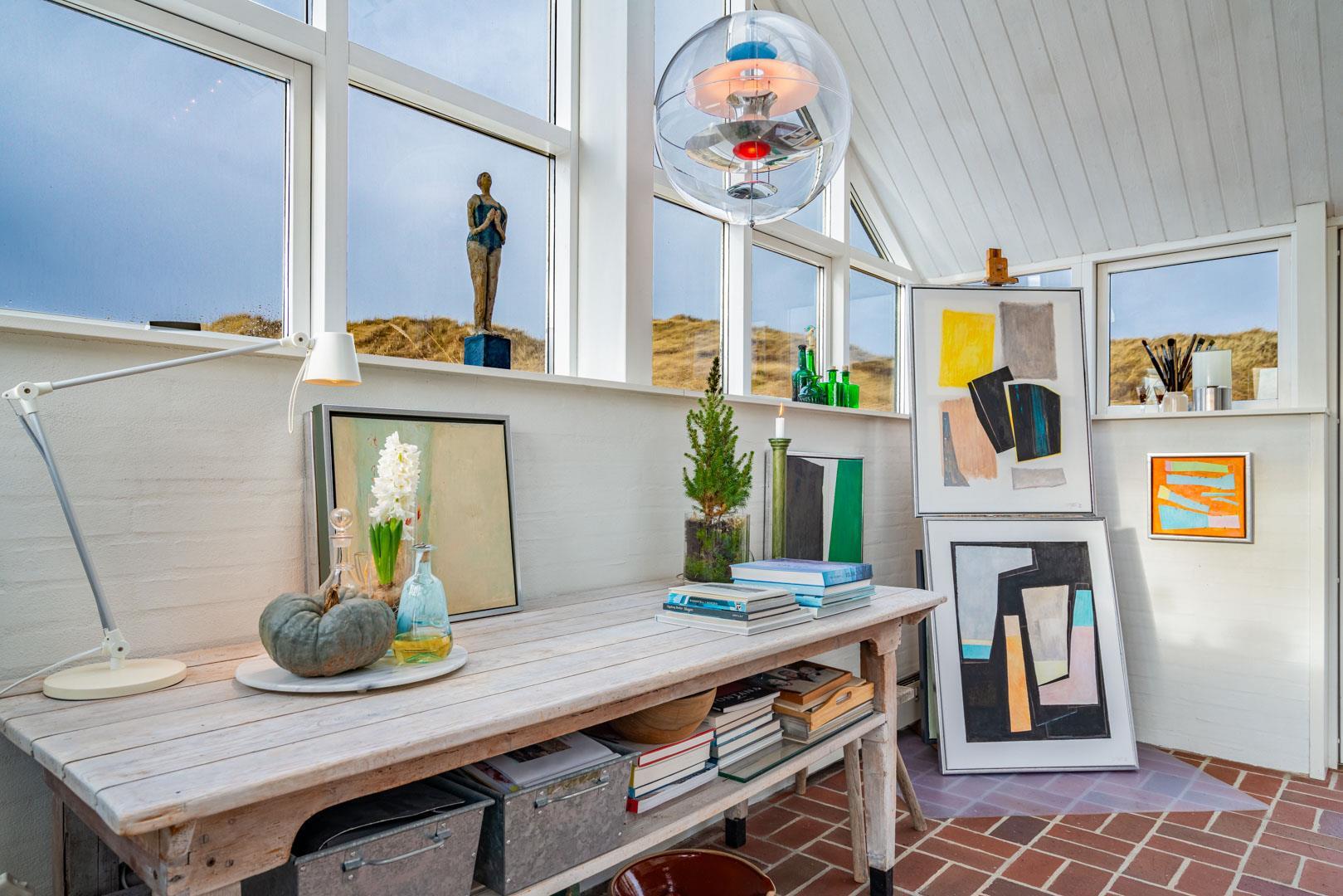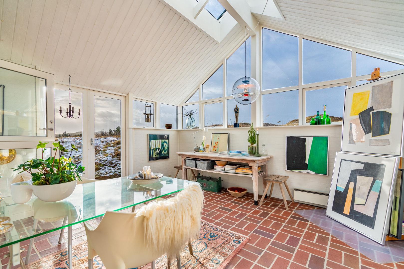 Fra spisestuen er der direkte udgang til et fantastisk atelier med mange lysindfald fra flere døre og vinduer – Et fantastisk rum der gør sommerhuset helt unikt!