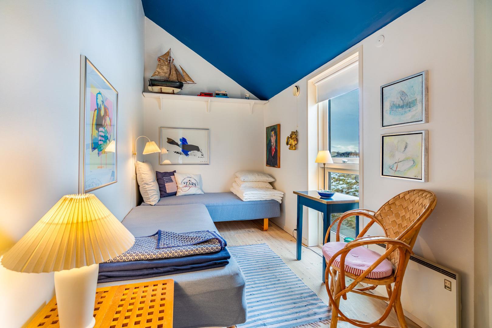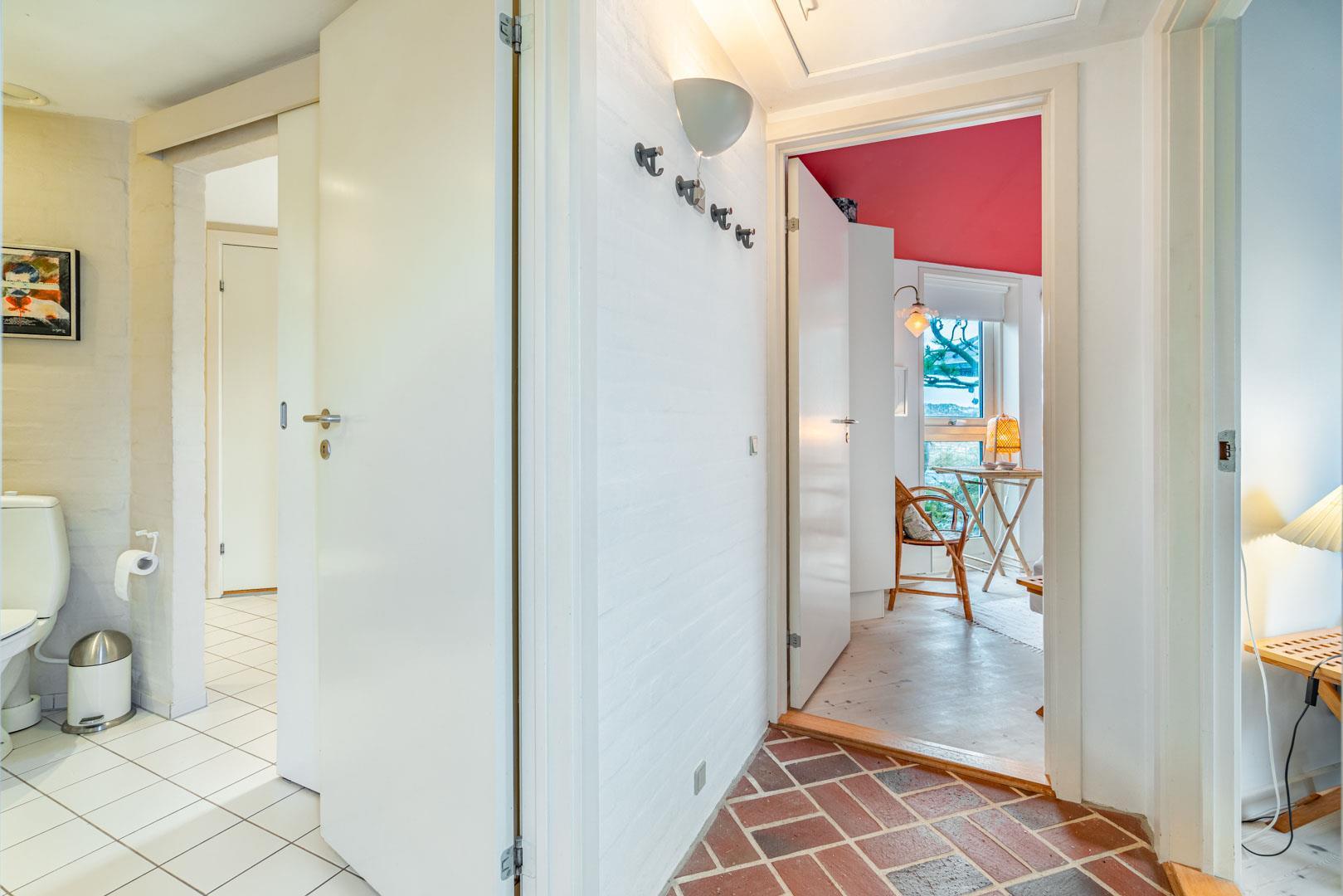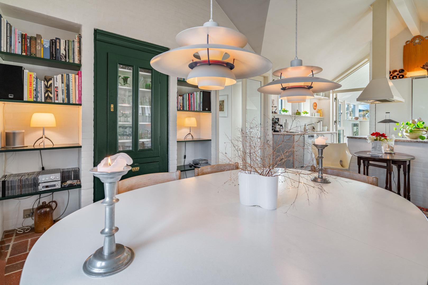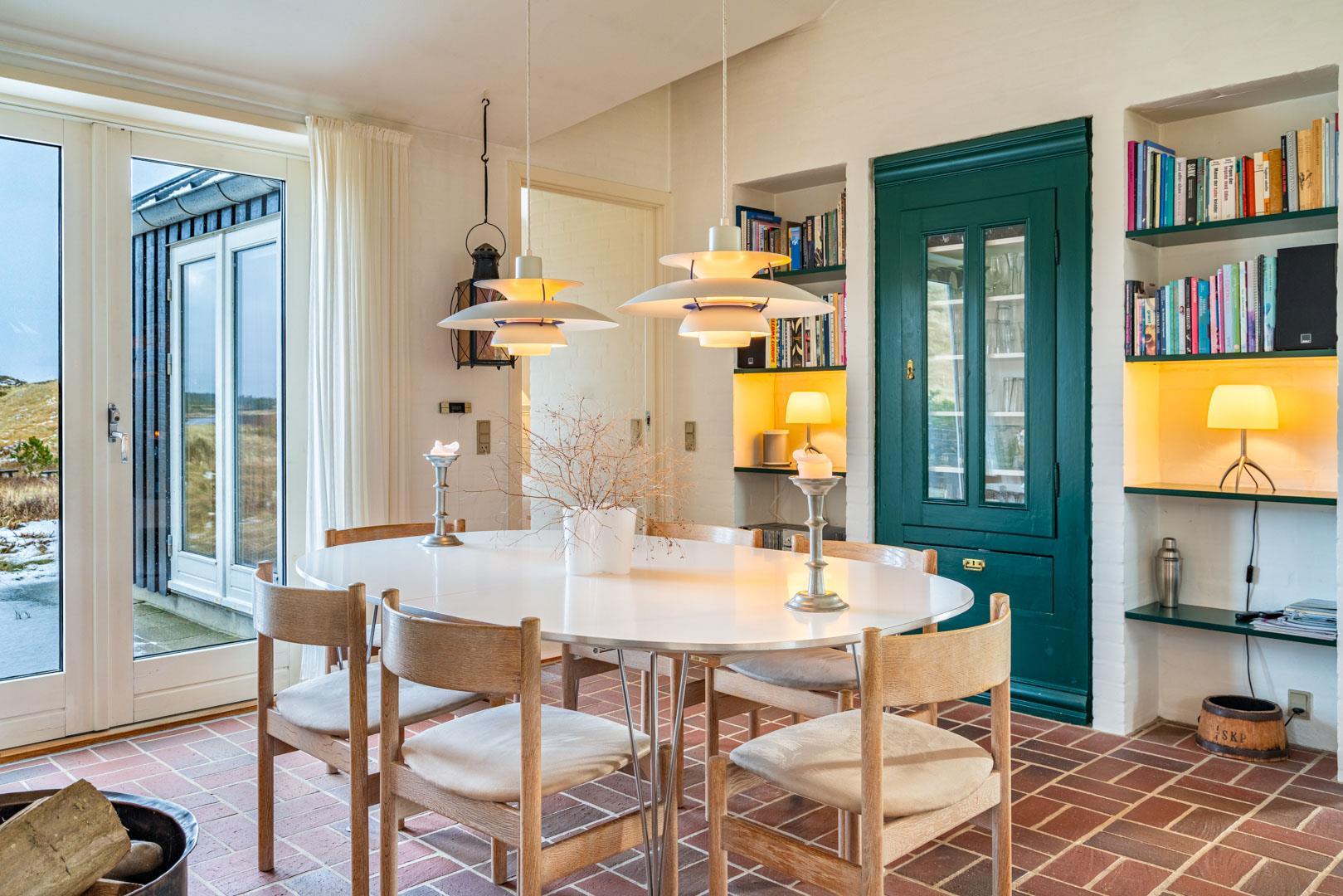 Fra spisestuen er der direkte udgang til et fantastisk atelier med mange lysindfald fra flere døre og vinduer – Et fantastisk rum der gør sommerhuset helt unikt!
