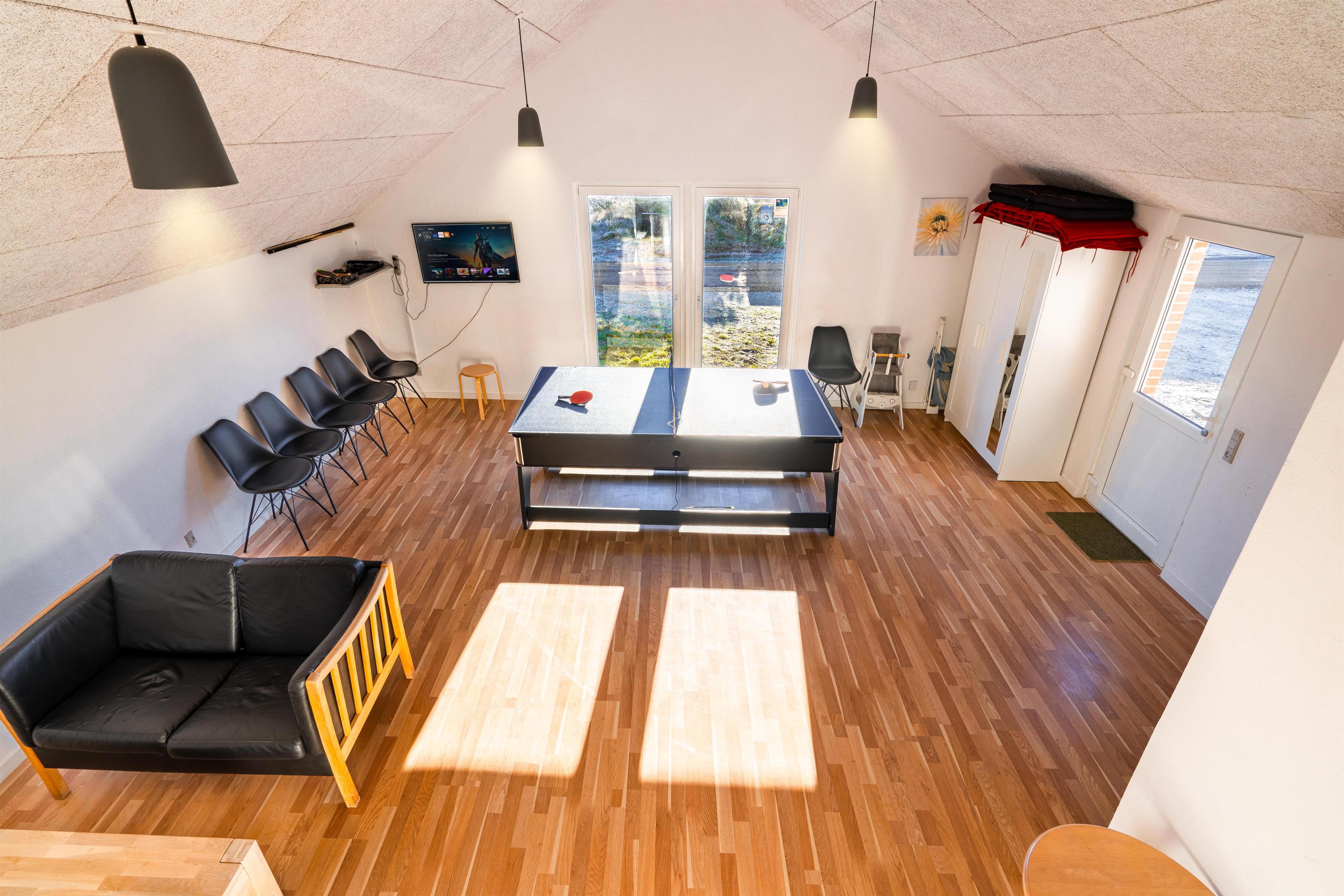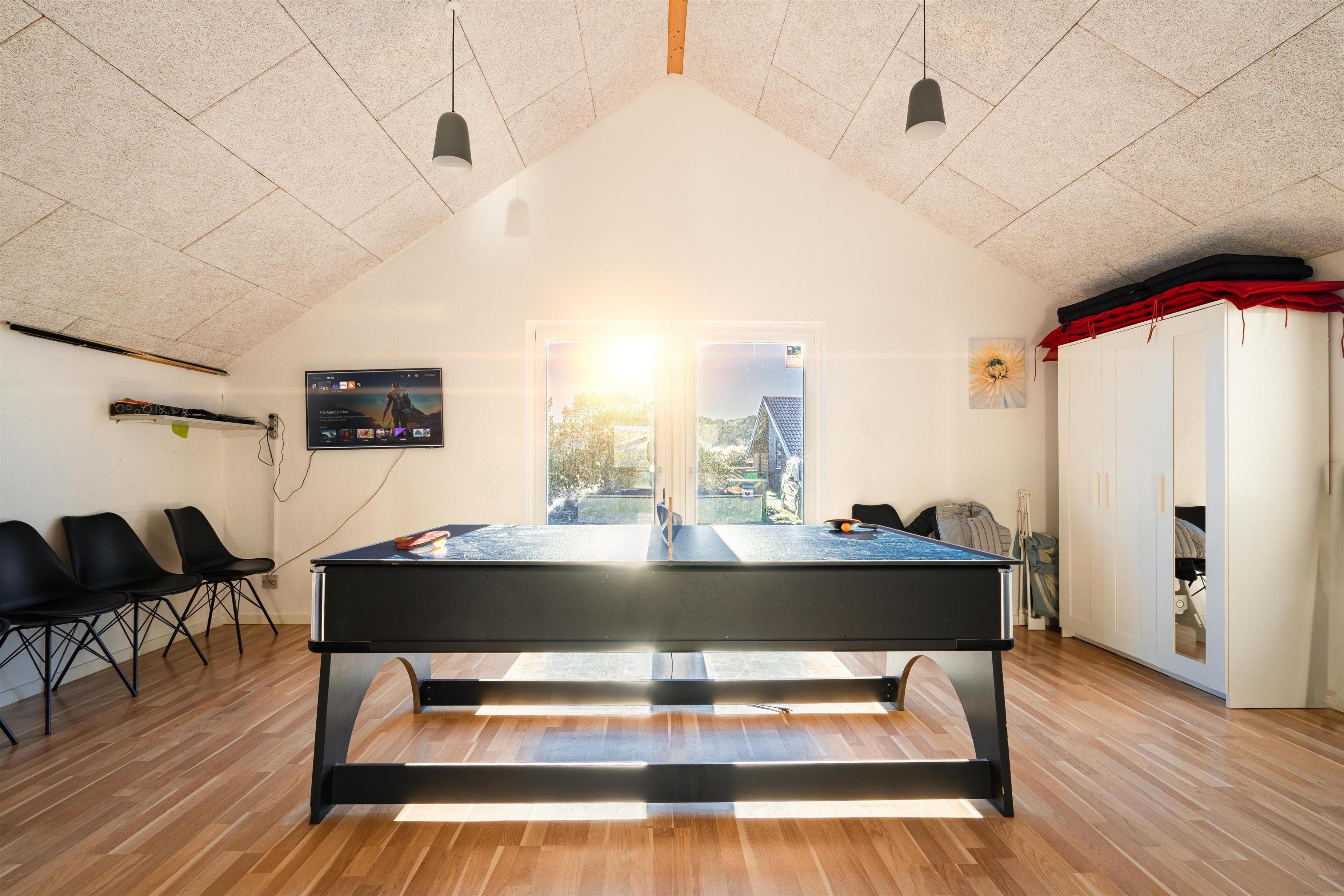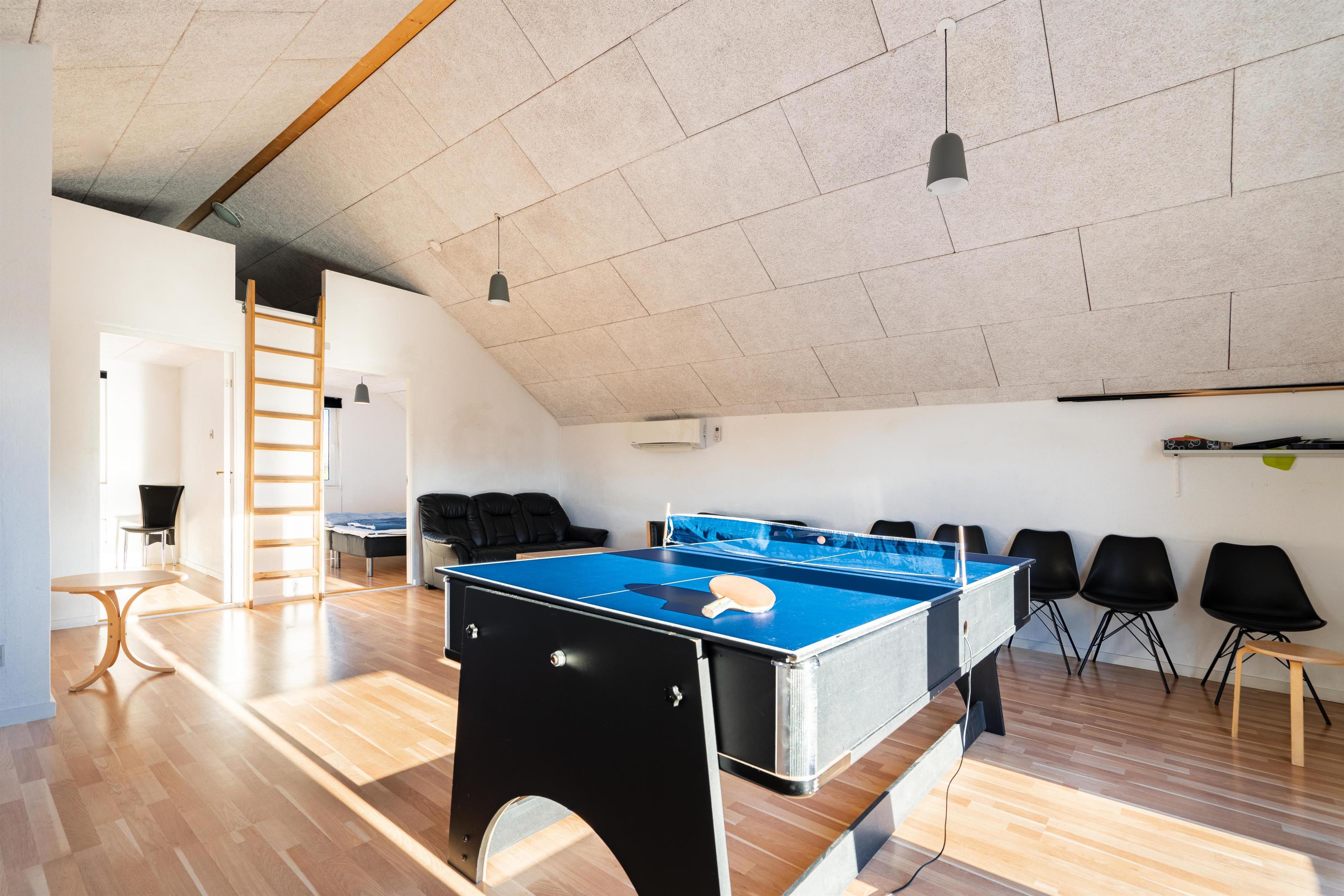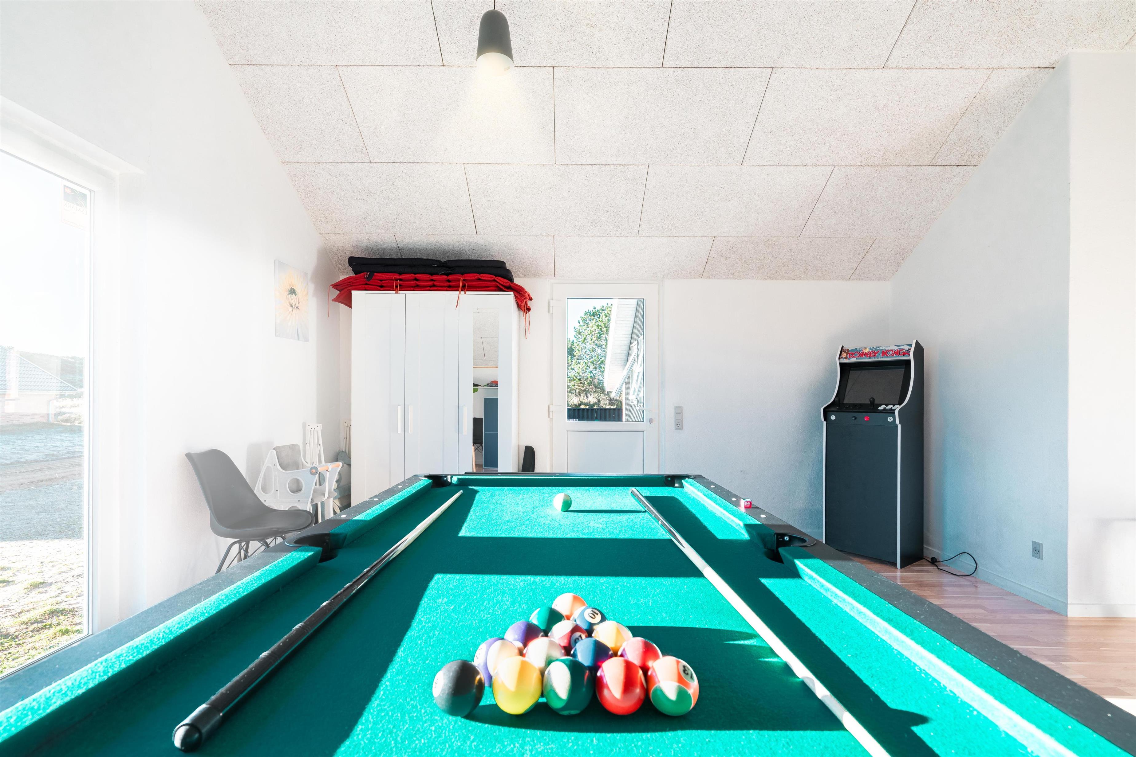 Stort og meget rummeligt aktivitetshus med pool afd. beliggende i gå afstand fra Vesterhavet samt Henne Strand by. Her er virkelig tale om dejligt feriehus til 2 familier. Der er tilbygget stort aktivitetsrum med pollbord samt bordtennis. Feriehuset har en stor køkken/alrum med alt i hårde hvidevarer og herfra er der bla. adgang til huset dejlige pool område samt sauna. Der er også adgang til større ugenert lukket delvis overdækket terrasse hvor der kan hygget ved husets grill. Feriehuset er beliggende ved grusbelagt vej, så der er minimal af trafik. Husk vandreskoene eller cyklerne, da der er mange gode naturstier i området og ikke mindst i Blåbjerg Plantage.