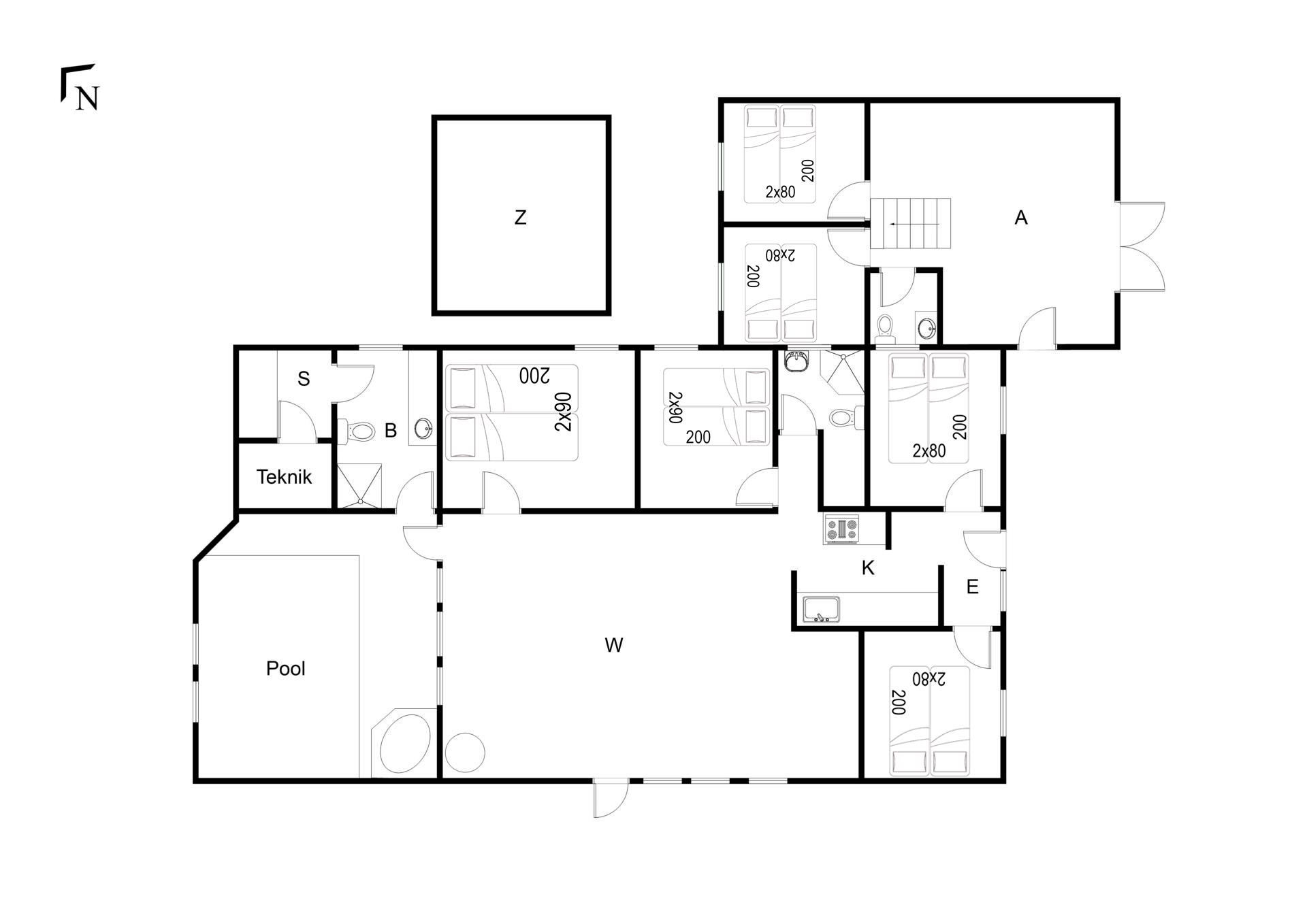 Sengestørrelser: 2 dobbeltsenge med 2 madrasser 90 x 200 cm + 4 dobbeltsenge med 2 madrasser 80 x 200 cm