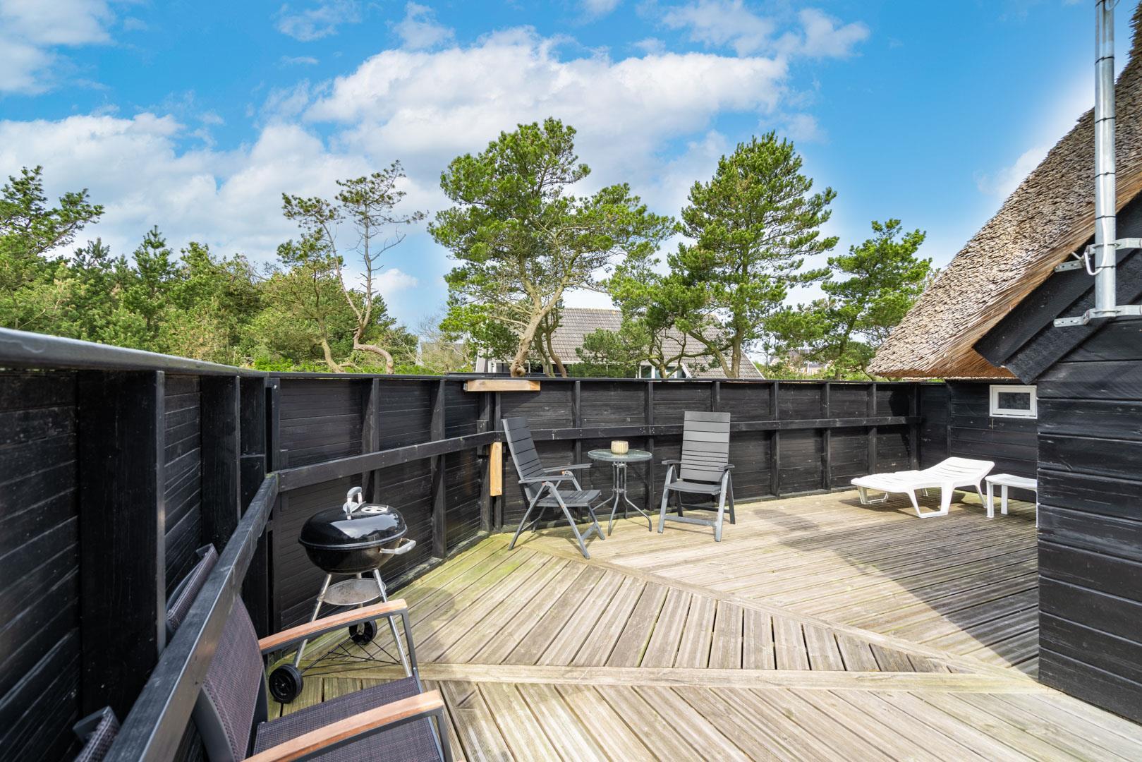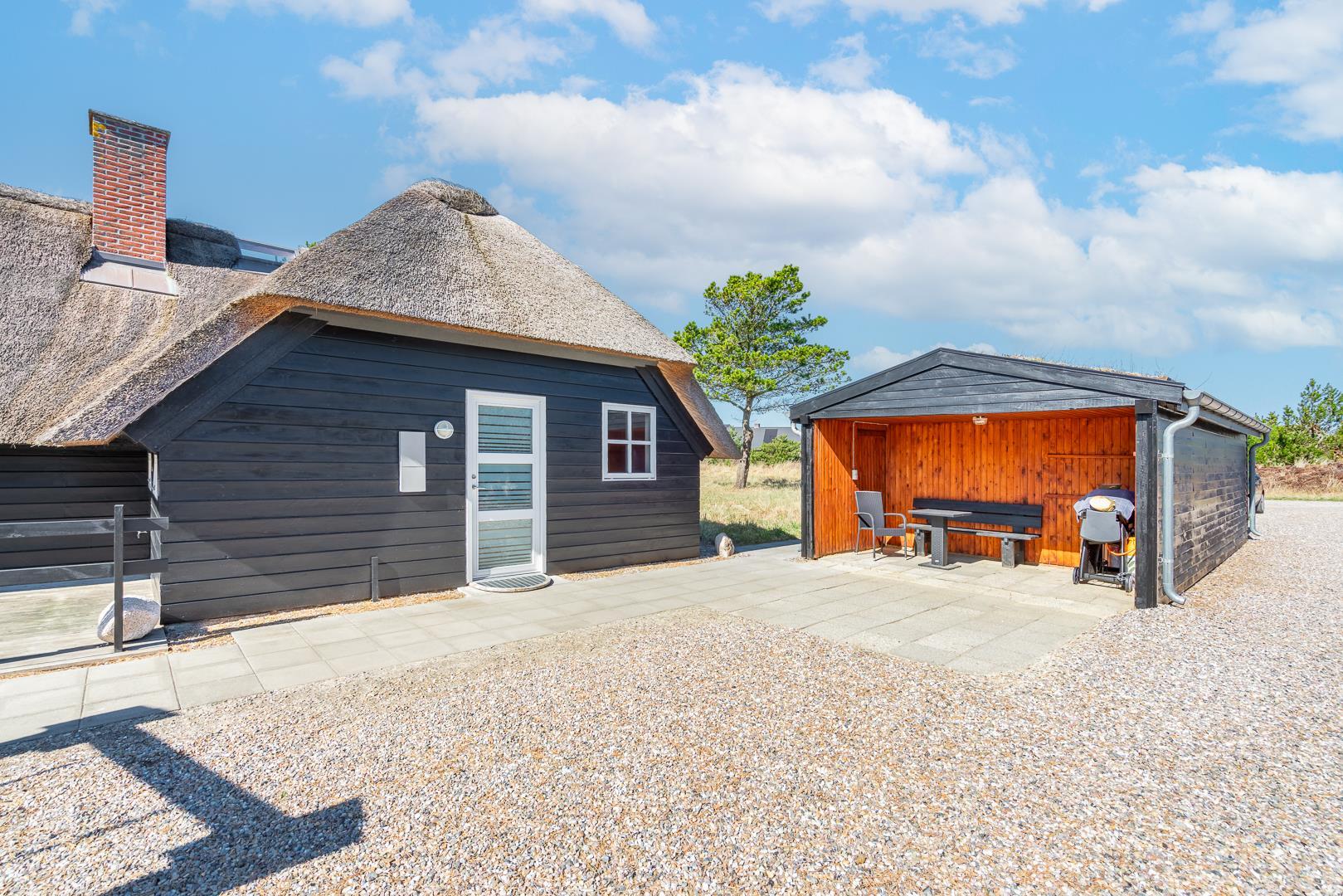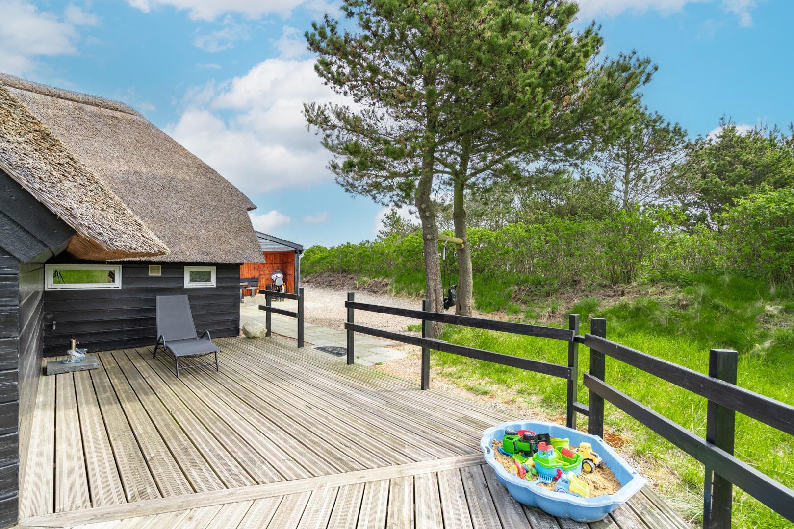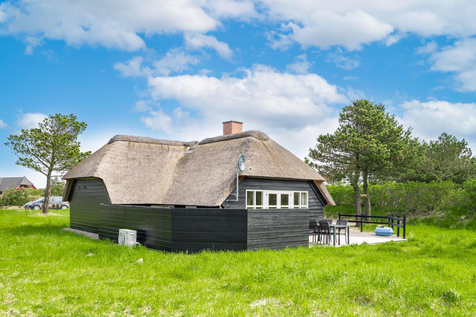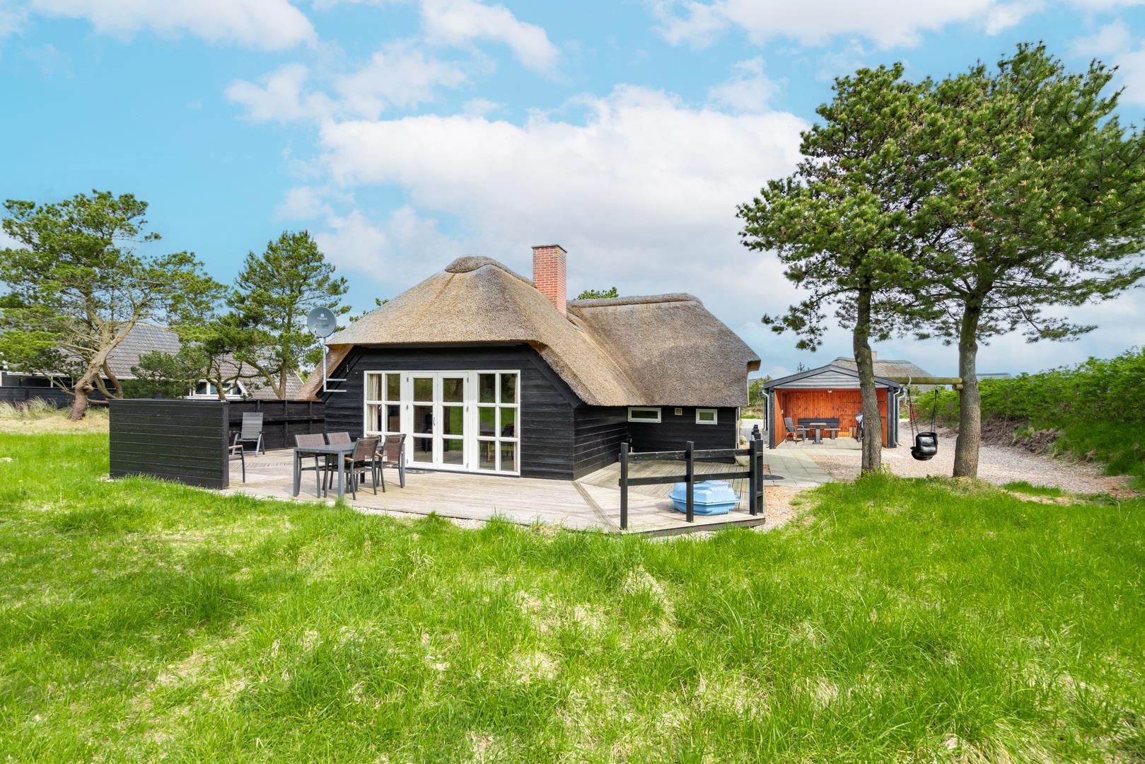 Her kan du opleve den ægte sommerhusstemning i dette hyggelige stråtækte træsommerhus på en stor naturgrund i populære Henne Strand. Her venter dig en ferieoplevelse, der vil tilfredsstille selv de mest kræsne. Indvendigt byder feriehuset på en lys og indbydende atmosfære med smuk træbeklædning og en hyggelig stue, der ligger i åben forbindelse med et velindrettet køkken og spisestue. Fra stuen kan man nyde den skønne udsigt over den store naturgrund gennem det store vinduesparti. Træterrassen, der omkranser en stor del af huset, inviterer til afslapning og hygge under åben himmel. Med to rummelige soveværelser med dobbeltsenge og et børnevenligt værelse med en etageseng og en enkelt seng er der plads til hele familien. Det store badeværelse byder på wellnessoplevelser med både sauna og spabad, mens du også kan finde et ekstra toilet i sommerhuset.