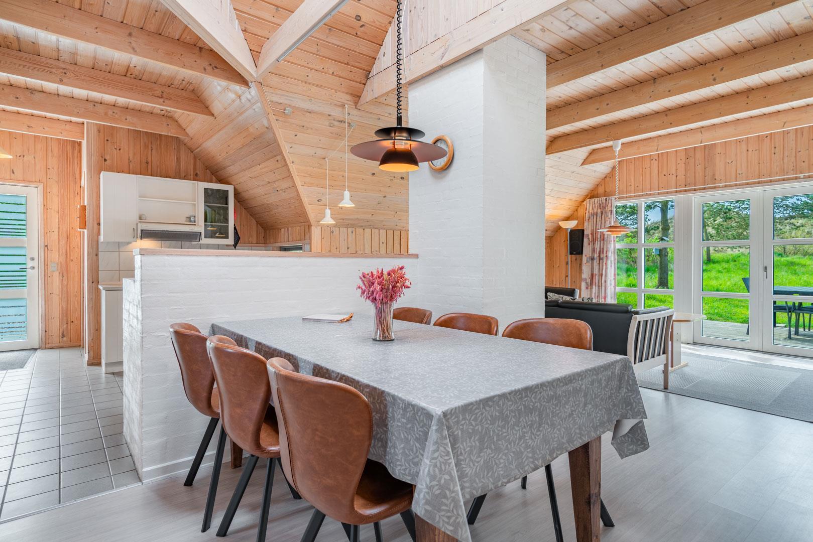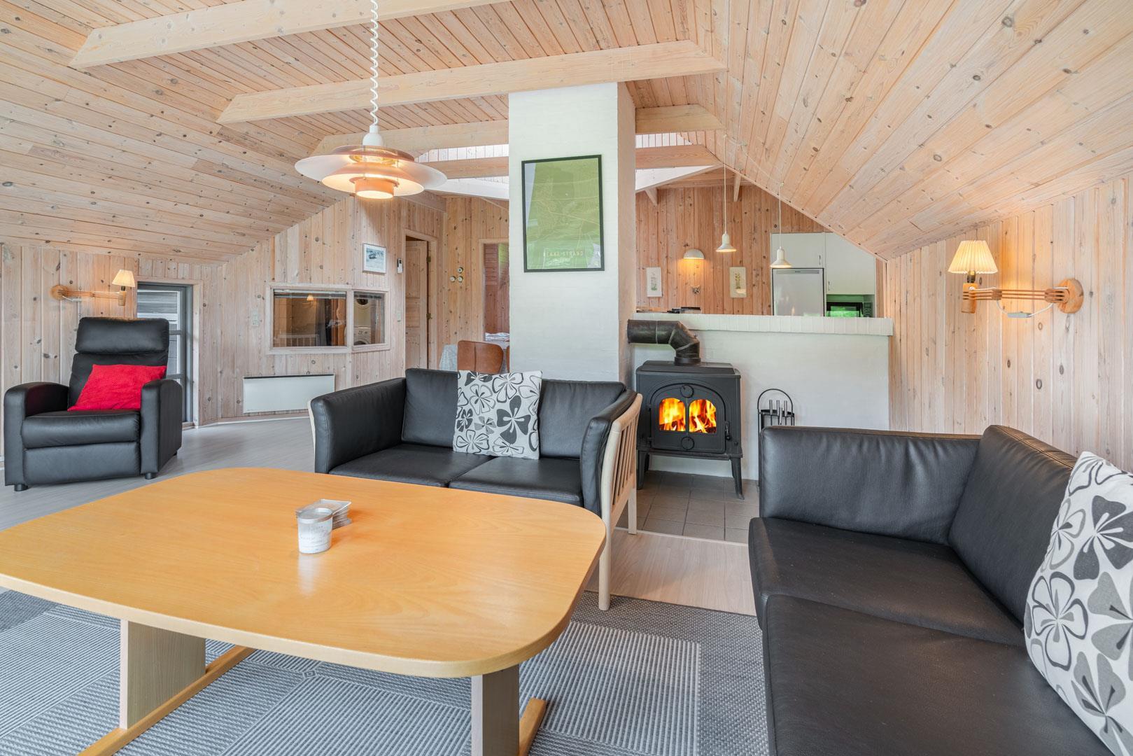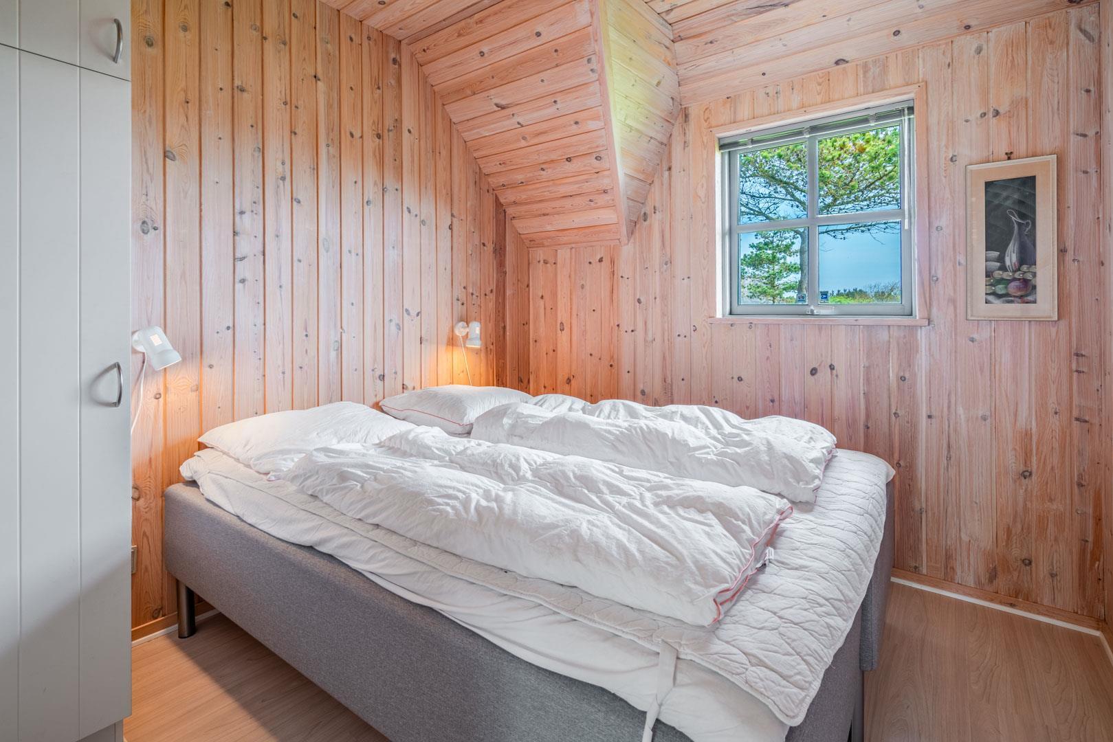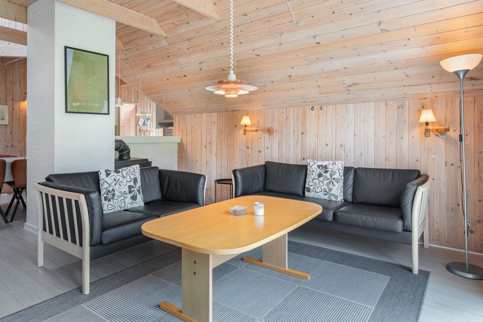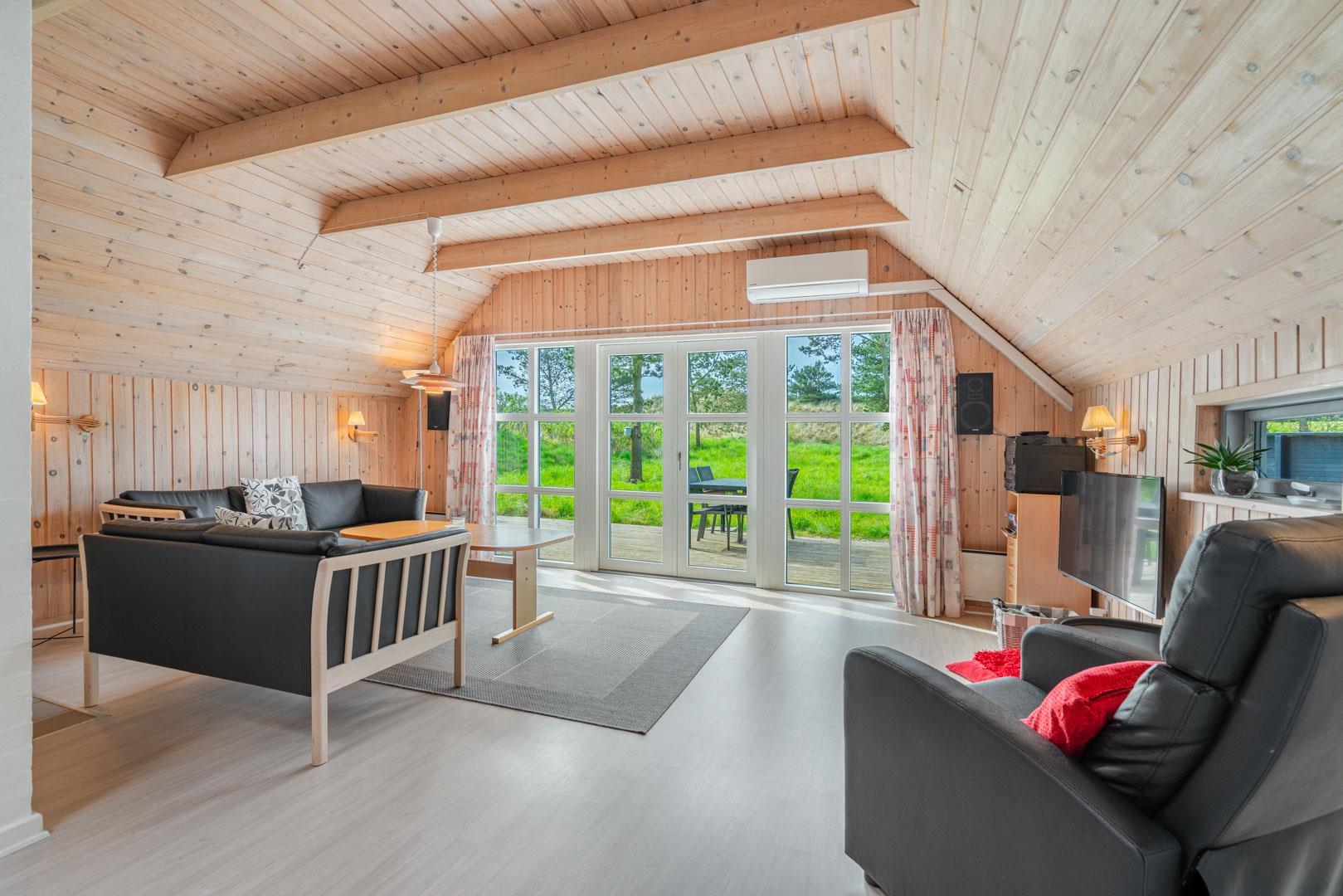 Her kan du opleve den ægte sommerhusstemning i dette hyggelige stråtækte træsommerhus på en stor naturgrund i populære Henne Strand. Her venter dig en ferieoplevelse, der vil tilfredsstille selv de mest kræsne. Indvendigt byder feriehuset på en lys og indbydende atmosfære med smuk træbeklædning og en hyggelig stue, der ligger i åben forbindelse med et velindrettet køkken og spisestue. Fra stuen kan man nyde den skønne udsigt over den store naturgrund gennem det store vinduesparti. Træterrassen, der omkranser en stor del af huset, inviterer til afslapning og hygge under åben himmel. Med to rummelige soveværelser med dobbeltsenge og et børnevenligt værelse med en etageseng og en enkelt seng er der plads til hele familien. Det store badeværelse byder på wellnessoplevelser med både sauna og spabad, mens du også kan finde et ekstra toilet i sommerhuset.