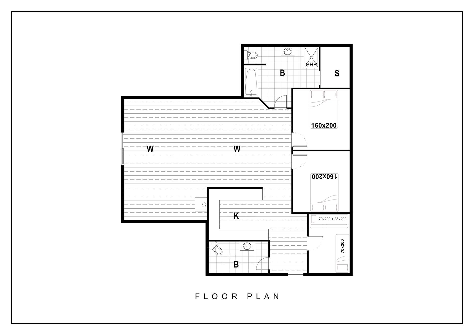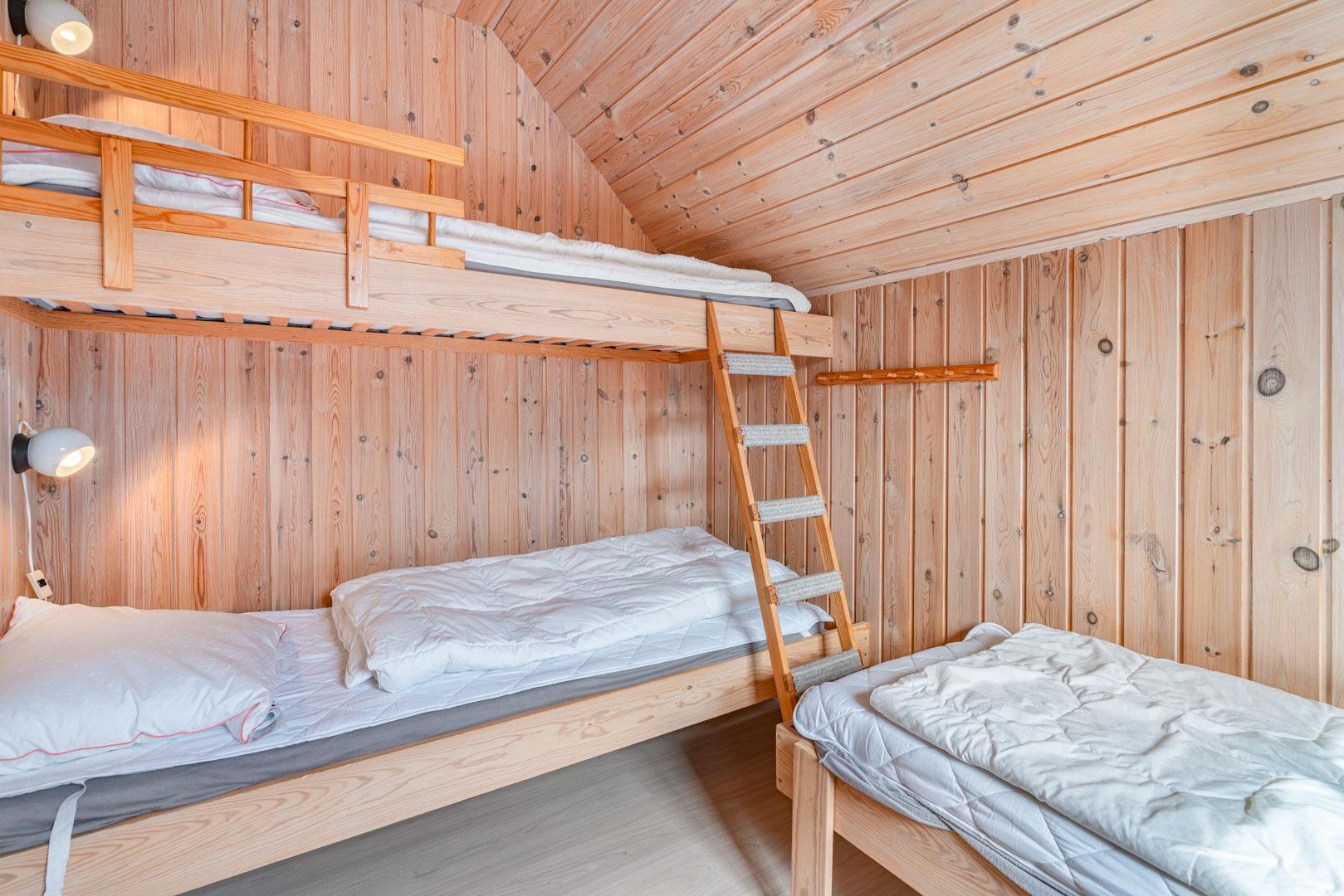 Sengestørrelse: 2 dobbeltsenge 160 x 200 cm + 1 enkeltseng 70 x 200 cm + 1 køjeseng, hvor overkøjen er 70 x 200 cm og underkøjen er 85 x 200 cm.