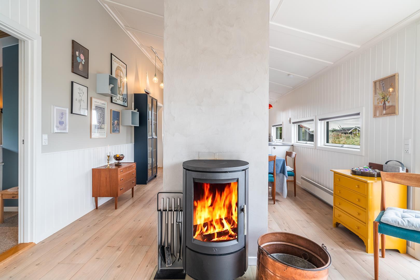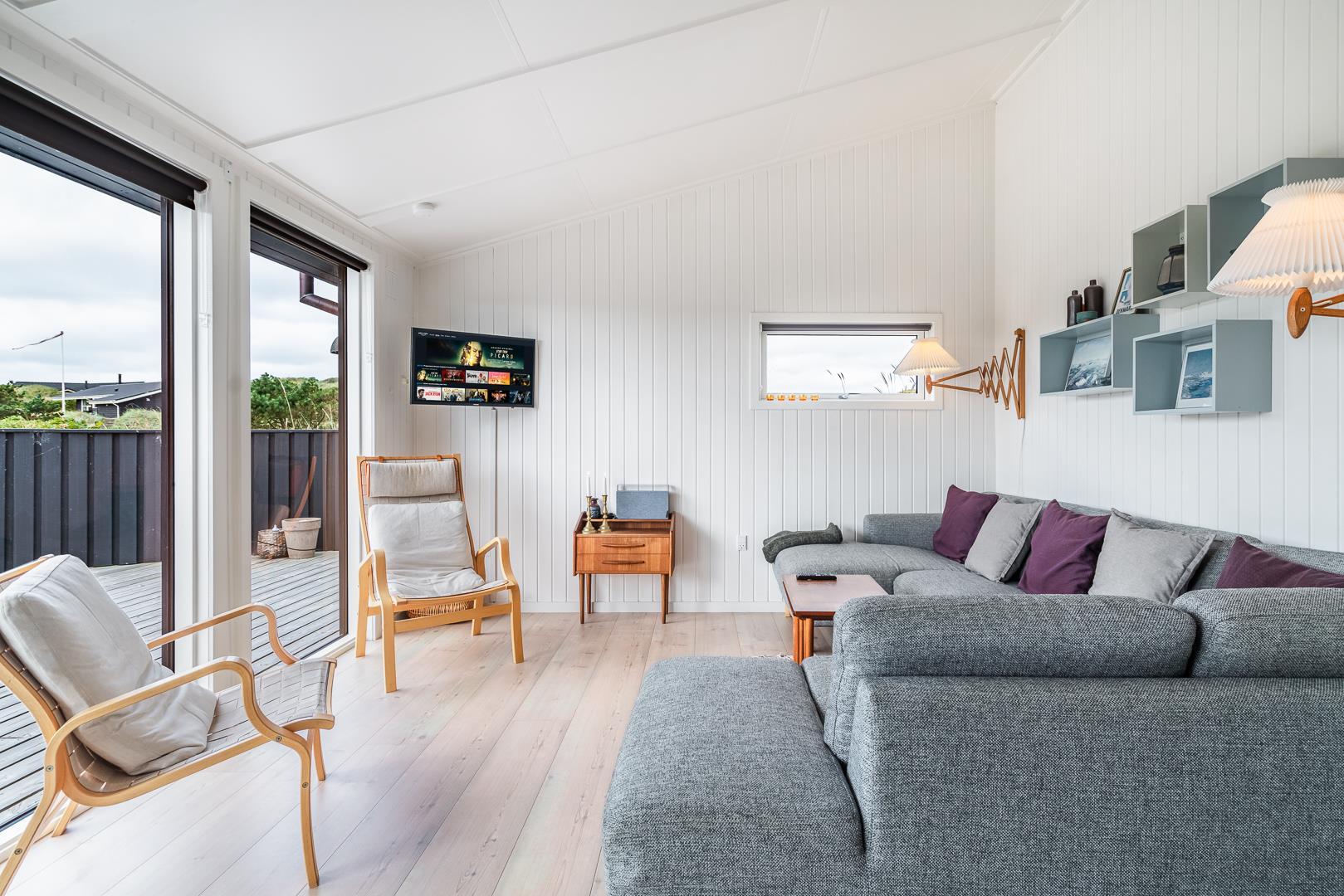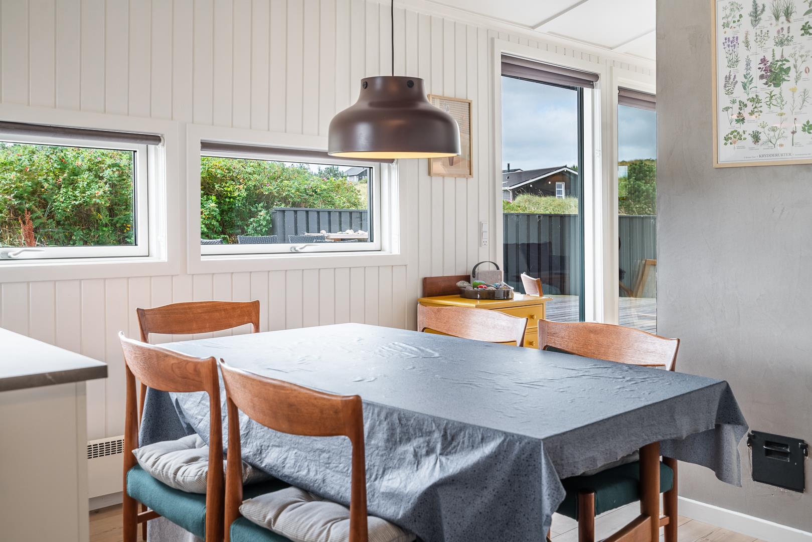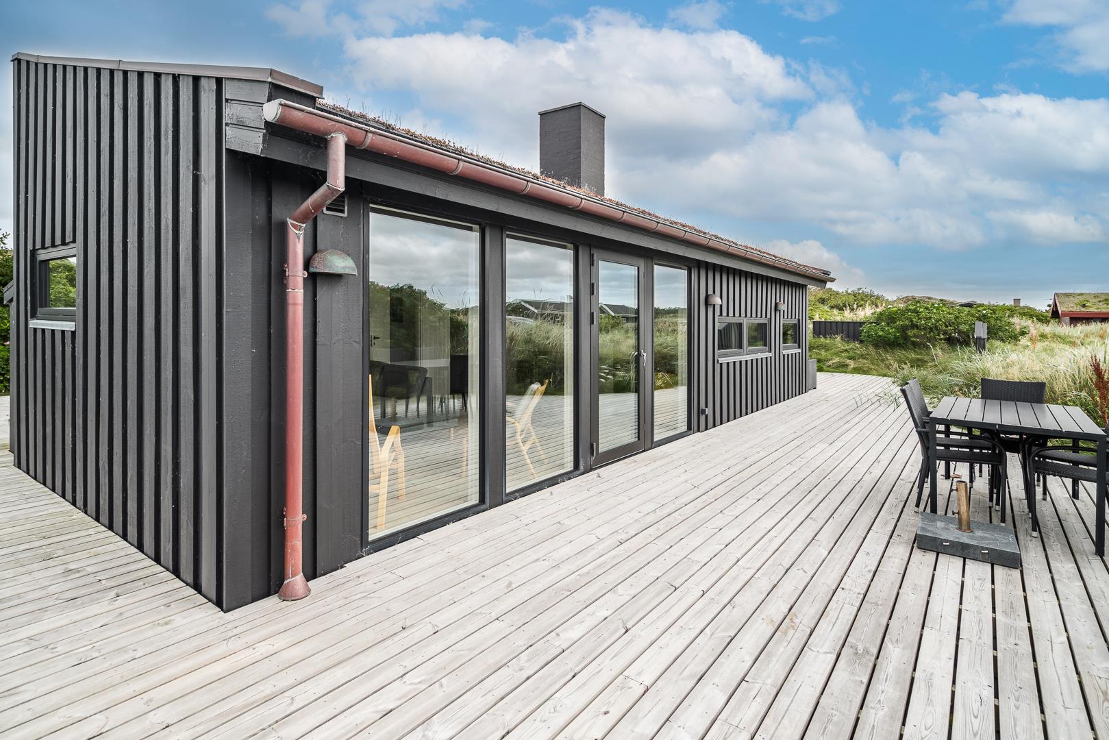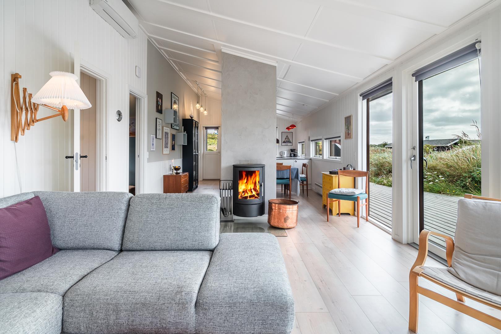 På en pragtfuld naturgrund tæt på Henne Mølle Å og i nærheden af stort fredet hede område ligger dette totalt renoverede feriehus. Huset er moderne indrettet med en smag af retro. Smart køkken med opvaskemaskine og separat fryser i åben forbindelse til spiseafdeling og stue. Hyggelig stue med central placeret brændeovn og udgang til ugeneret sydvendt, stor træ terrasse, hvorfra solen og den flotte natur kan nydes i fulde drag. Der findes 3 soverum, 2 soverum med dobbelt seng, hvoraf det ene har TV, derudover findes mindre værelse med køjer og TV. Energi besparende og miljøvenlig varmepumpe. Et rigtig dejligt feriehus med stil og charme til familien, der ønsker at bo midt i den skønneste natur med udsigt til klitter og ikke langt fra Vesterhavet.
