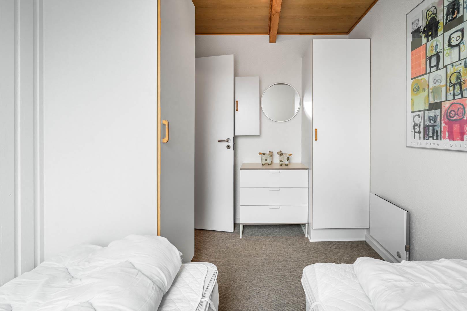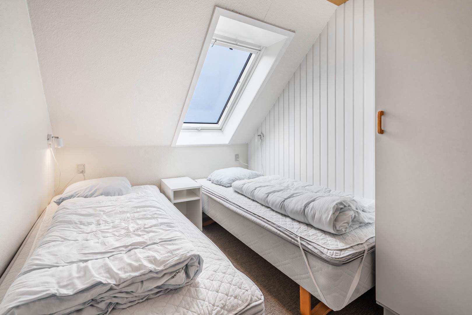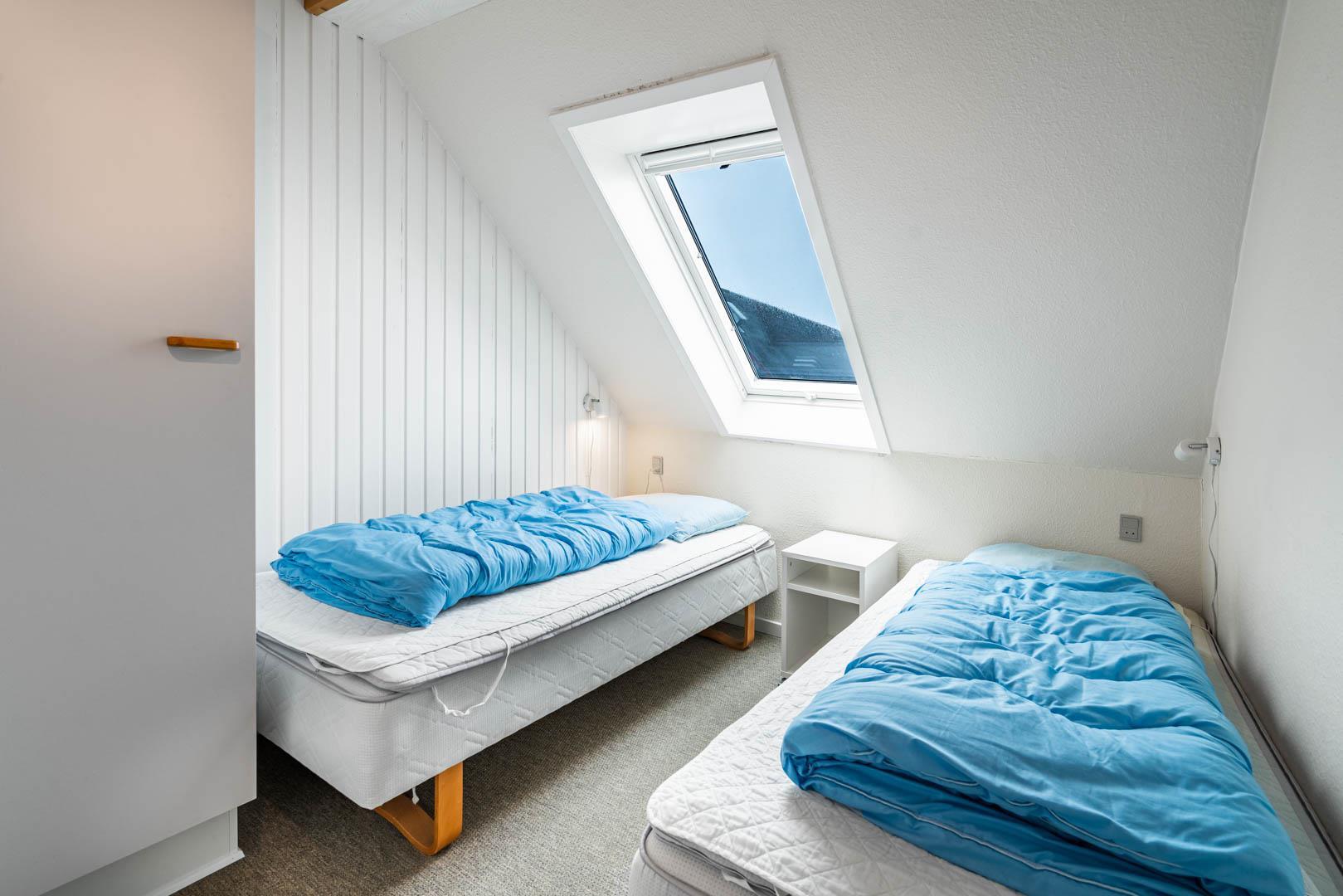 De to soveværelser er begge indrettet med komfortable enkeltsenge (4 x 90x200 cm), og fra begge værelser kan du ane havets glimt i horisonten – en stemningsfuld detalje, der understreger ferieatmosfæren.