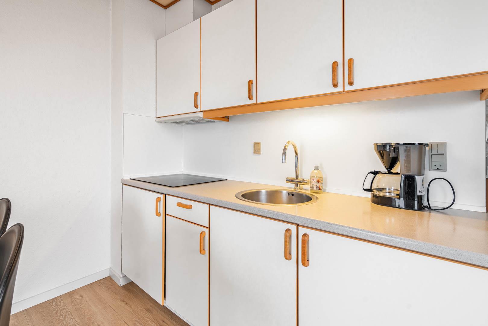 Lejligheden fremstår indbydende med lyse trægulve i både køkken og stue, og er udstyret med en kombiovn (mikroovn og bageovn), så du nemt kan tilberede dine måltider.