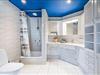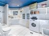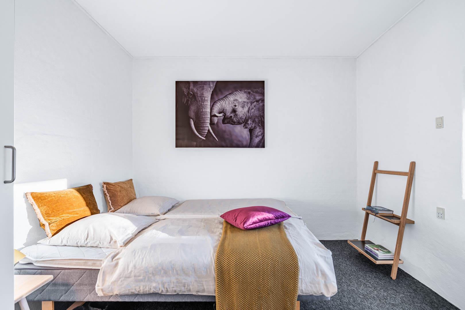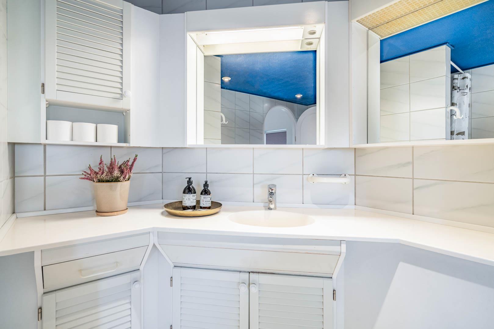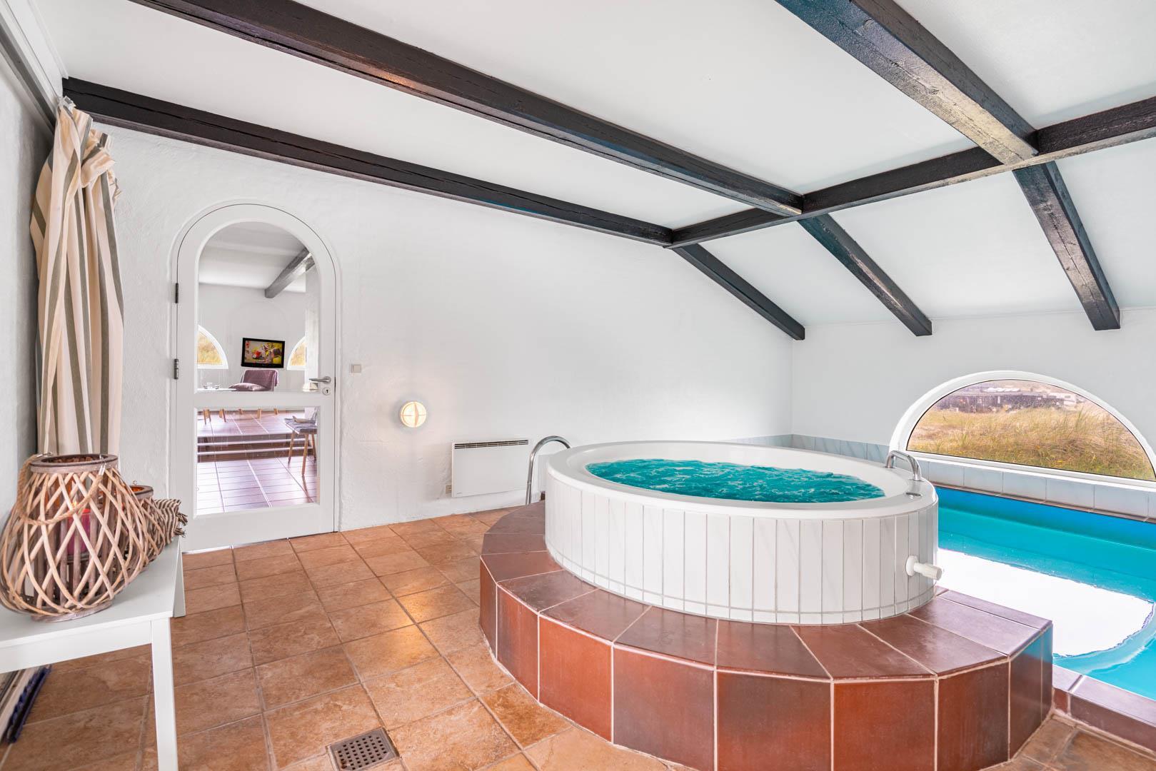 Et rundbuet vindue i samme stil som pejsen lader dagslyset danse i fine mønstre på poolens klare vand. Bassinet måler 3,8 x 3,3 meter, og poolafdelingen byder desuden på både badekar, sauna og badeværelse. Husets andet badeværelse ligger i værelsesafdelingen. Der er plads til seks overnattende feriegæster i huset, som er indrettet med to dobbeltværelser og et tvillingeværelse med enkeltsenge.