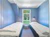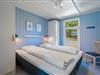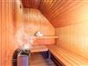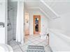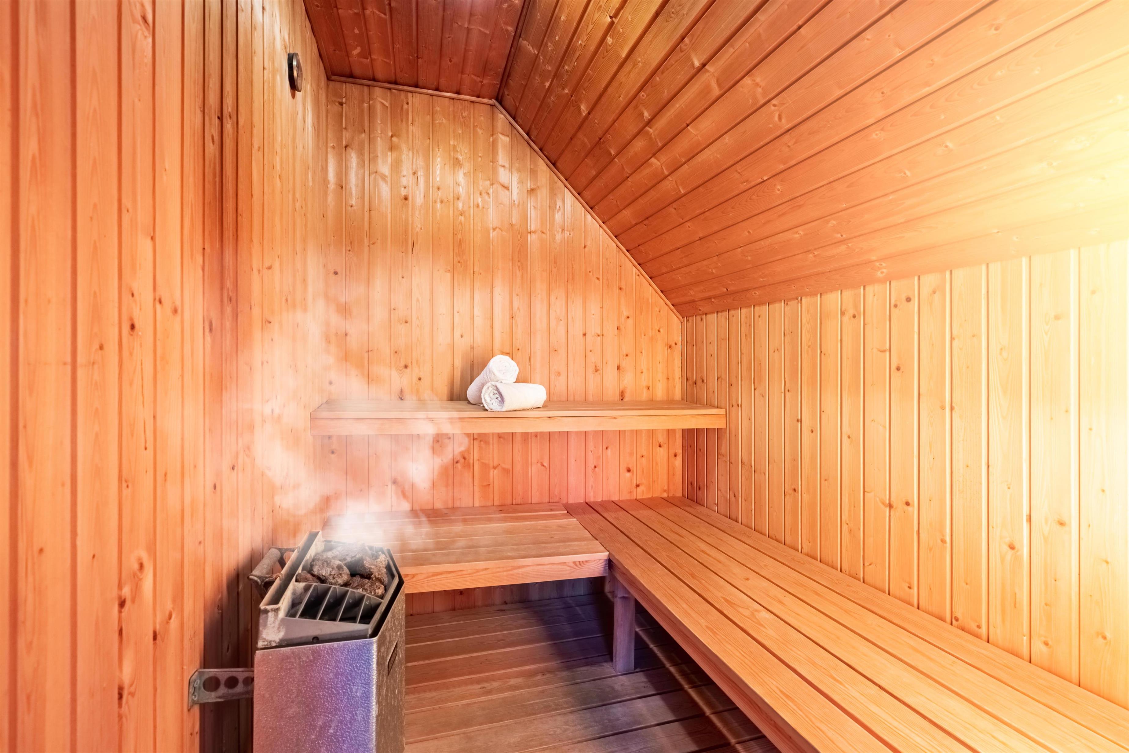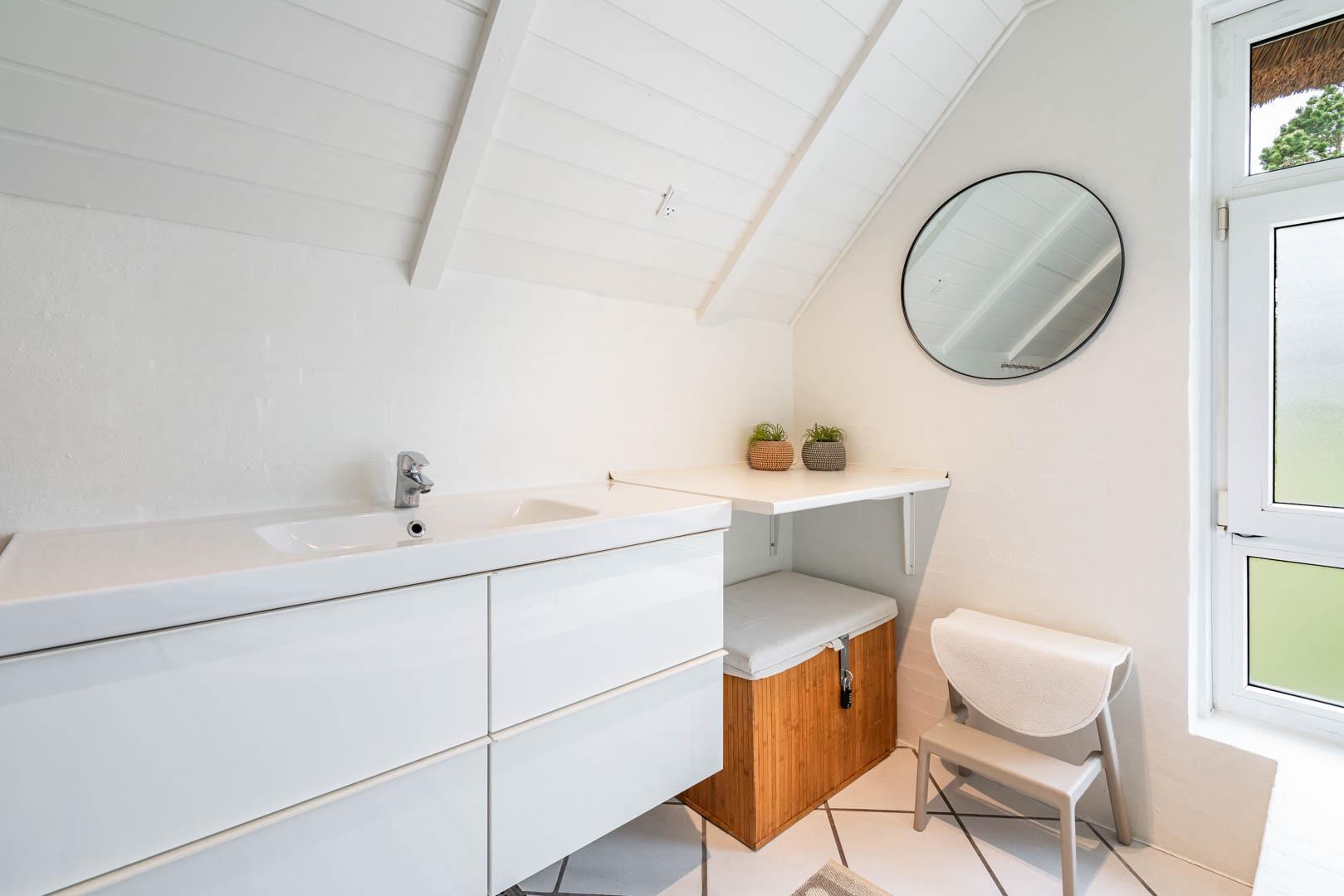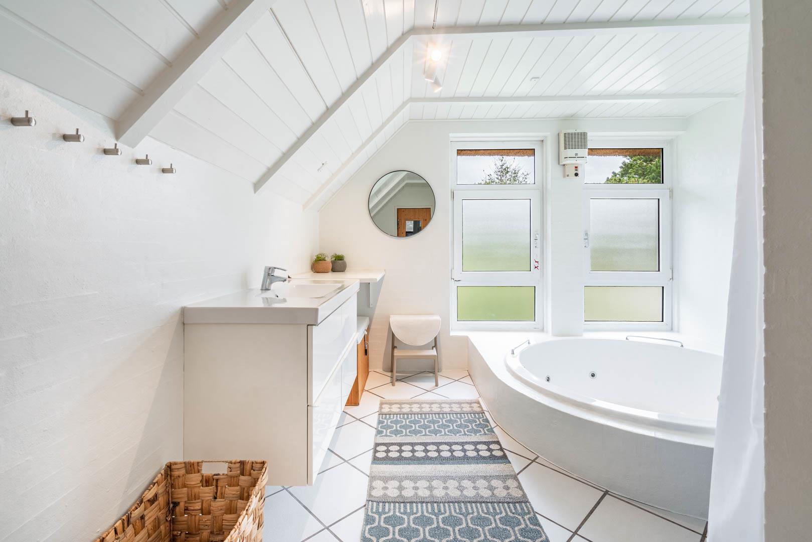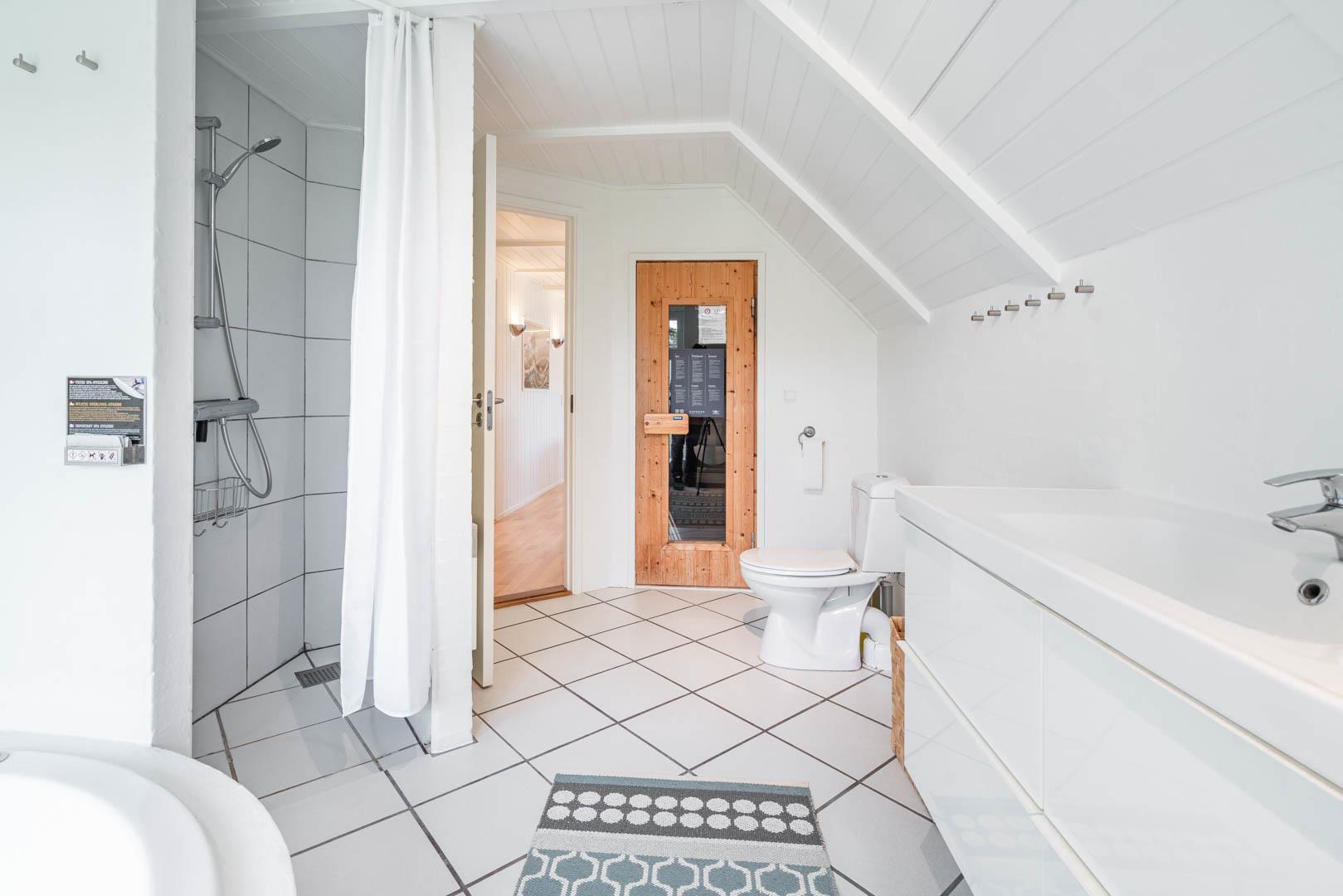 Der er et stort og lyst badeværelse med spabad og en rummelig sauna – perfekt til afslapning efter en lang dag ved stranden.