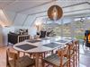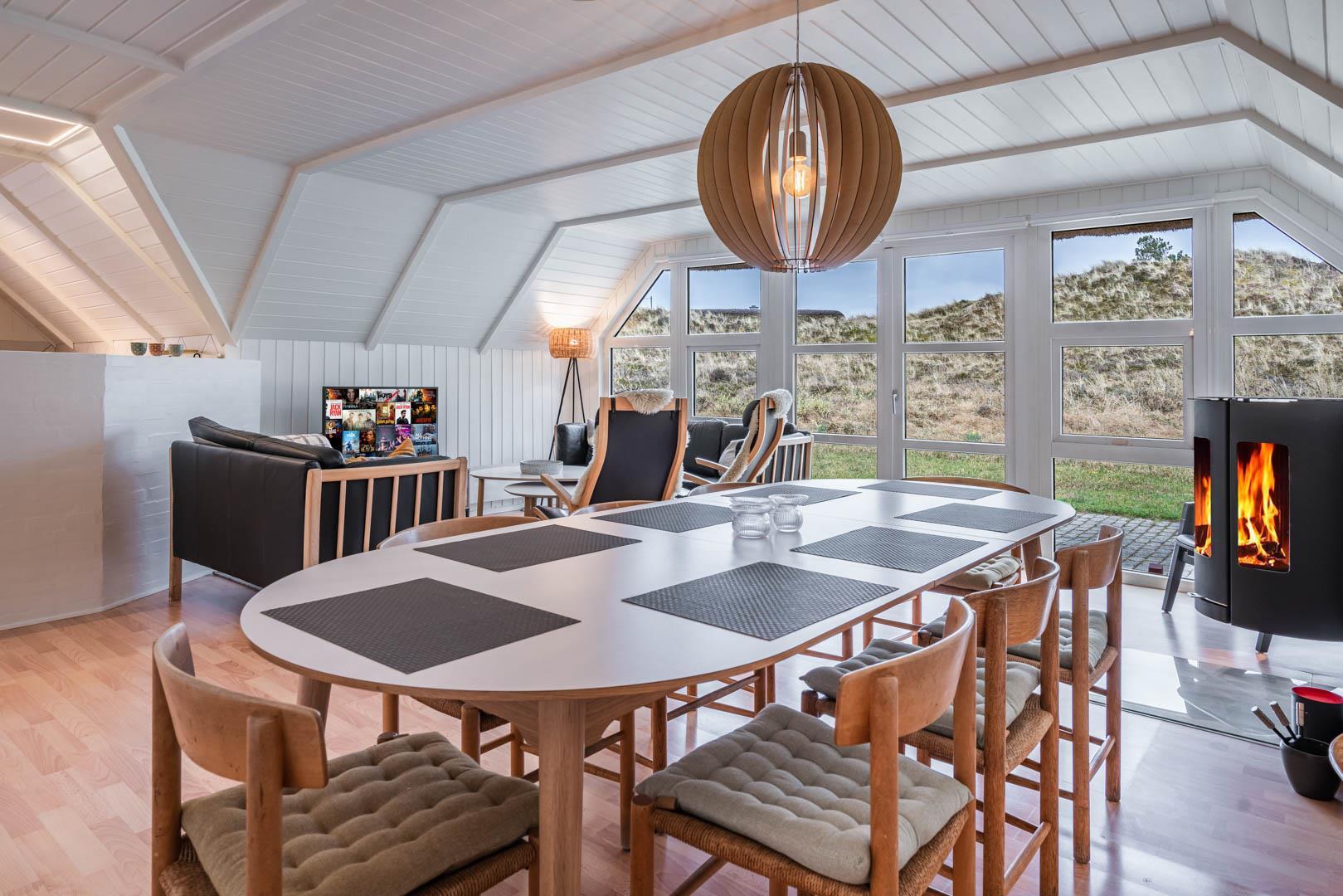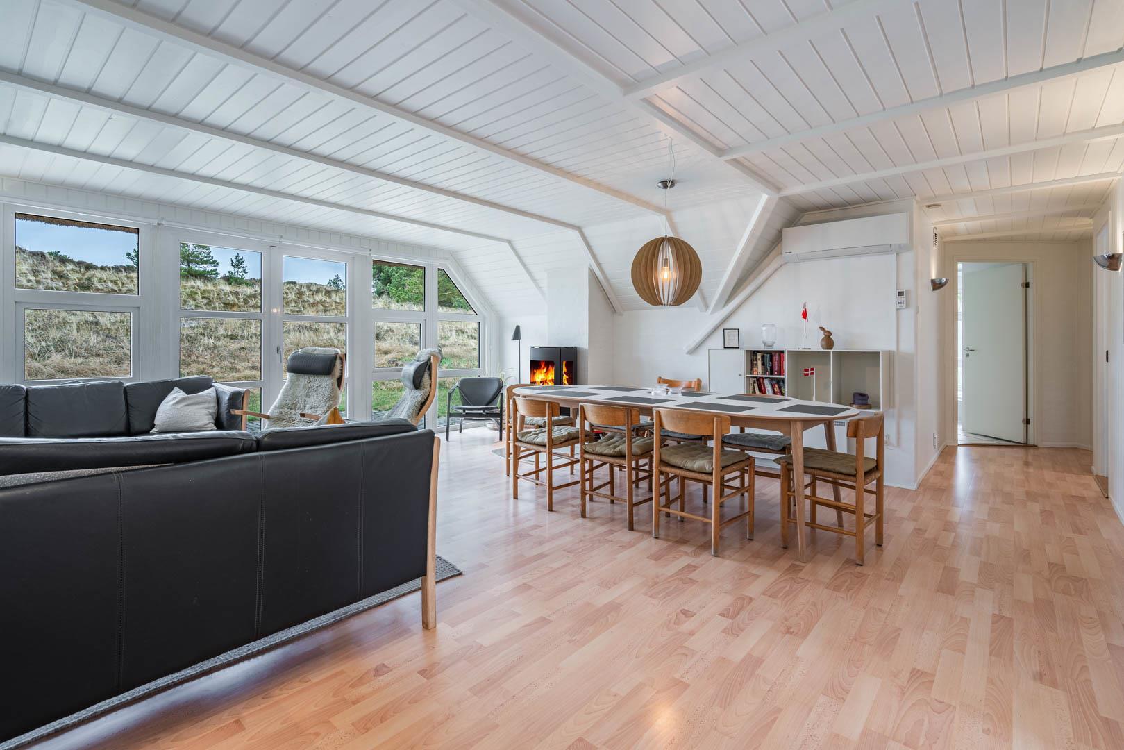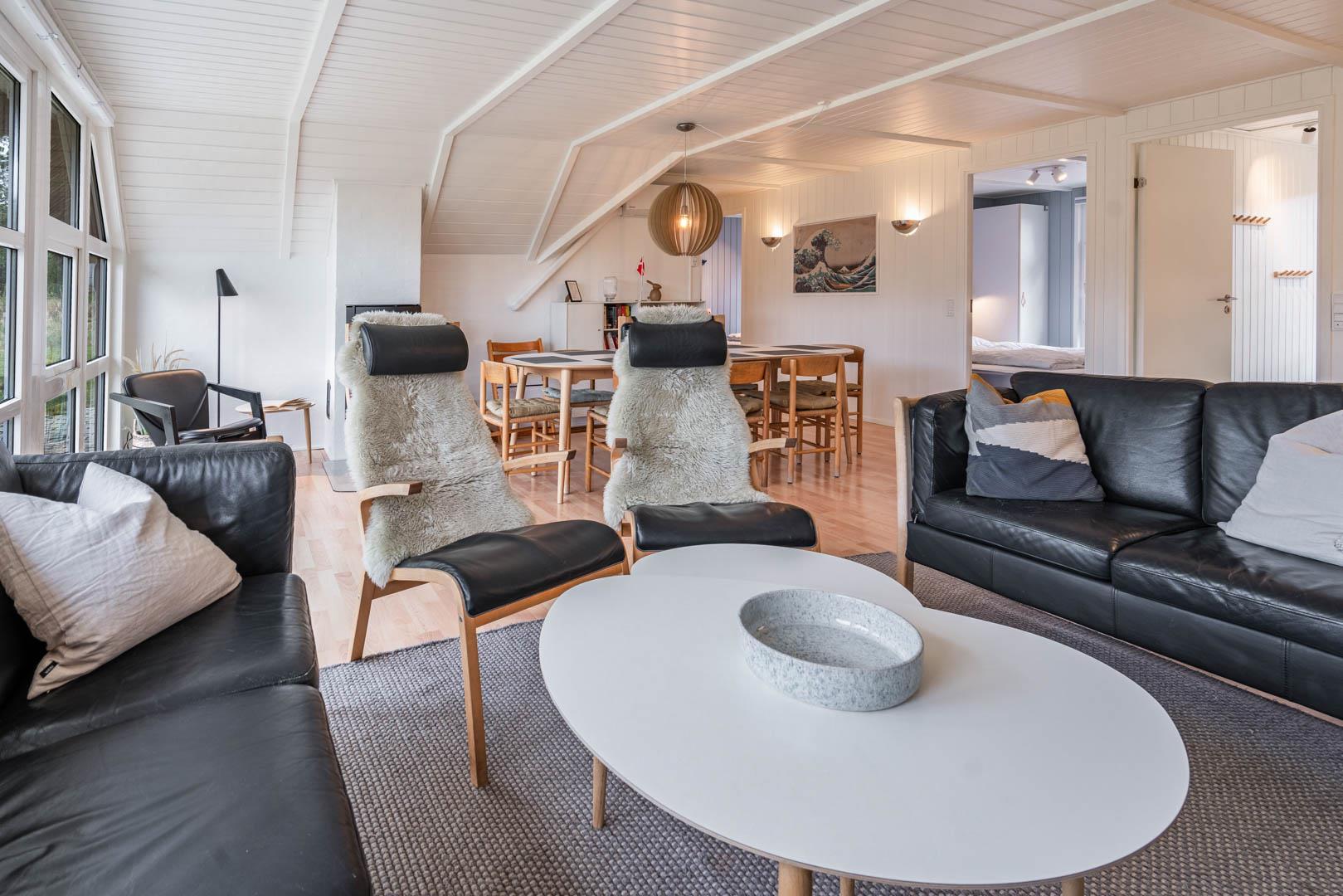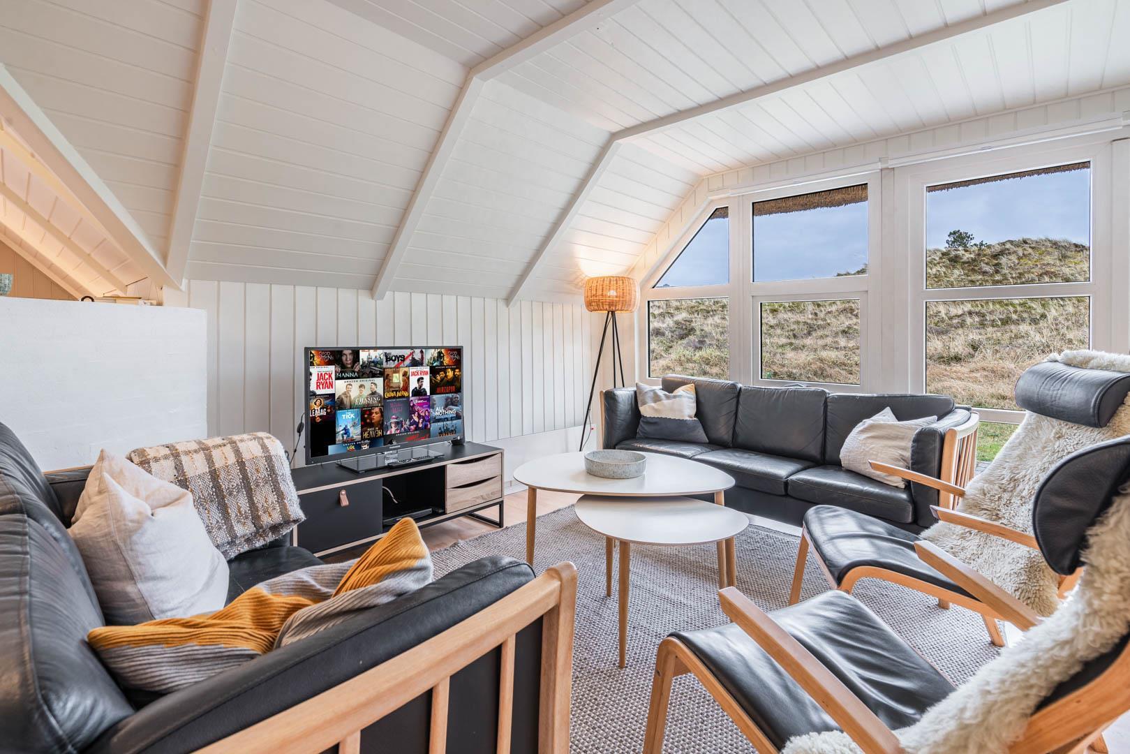 Den lyse stue er smagfuldt indrettet og har åben forbindelse til det veludstyrede køkken, hvilket skaber en dejlig, social ramme for ferieopholdet.