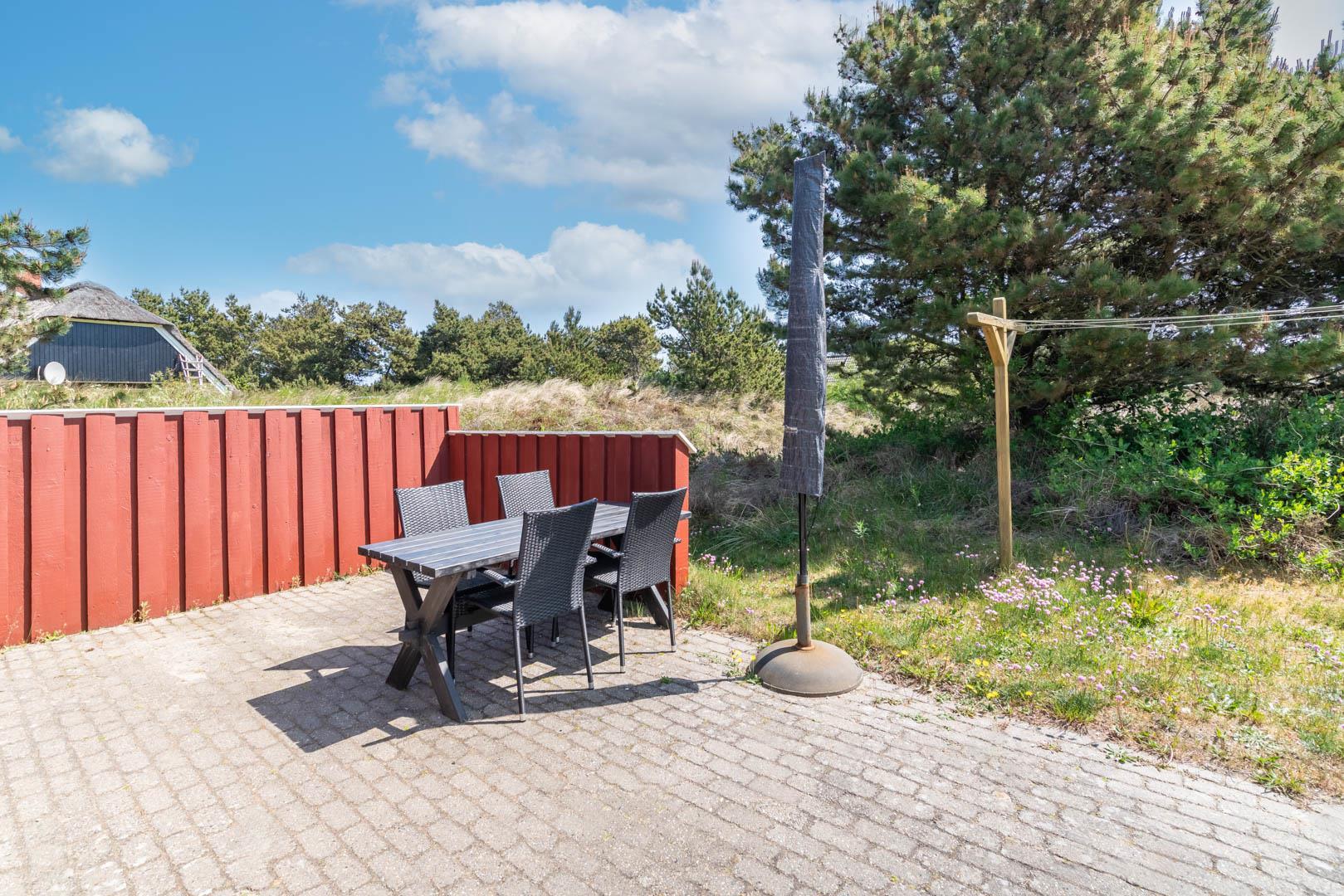 Udendørs venter en stor, flisebelagt og læfuld terrasse, hvor du helt ugeneret kan nyde solen og den omkringliggende natur.