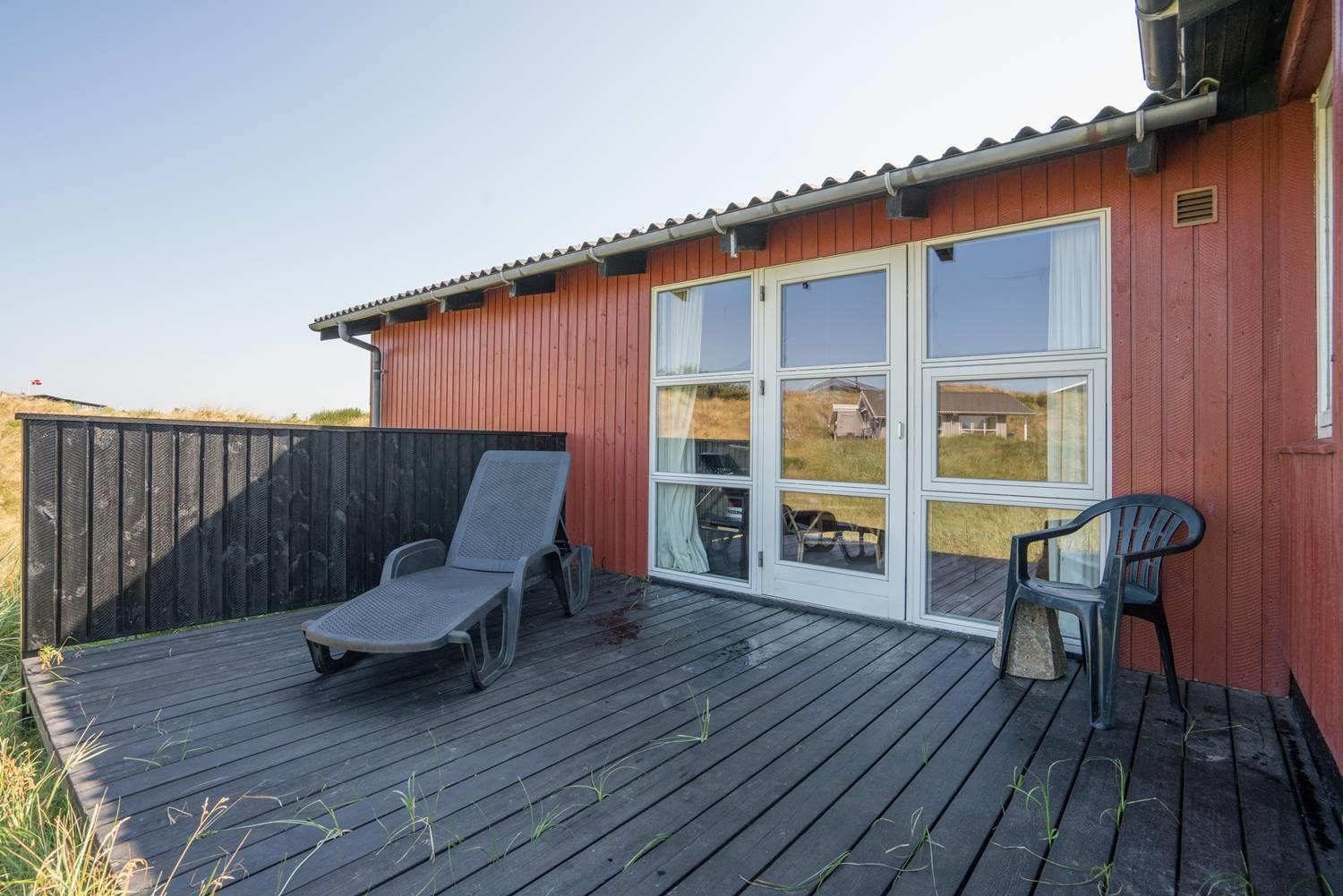 Hyggeligt feriehus i Henne Strand med sauna, 3 terrasser og dejlig udsigt over klitterne, kun 400 m fra vandet.