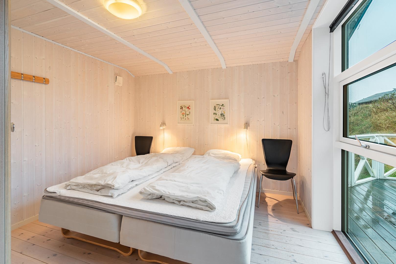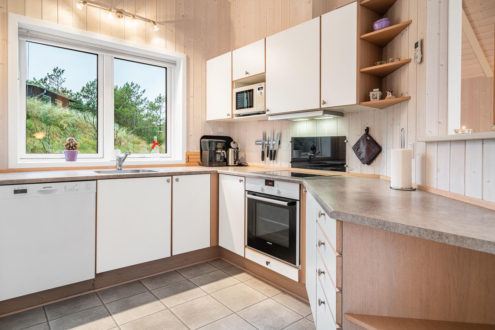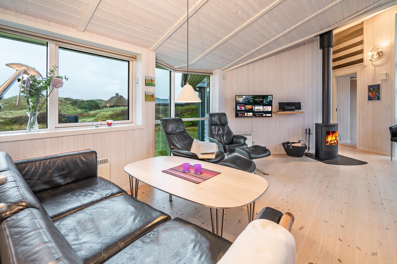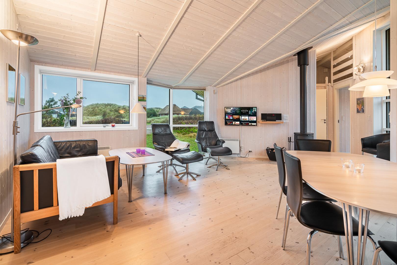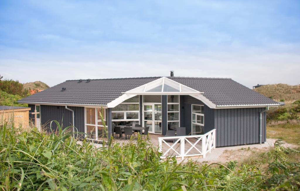 På en klitgrund i rolige omgivelser ligger dette dejlige feriehus. Huset fremstår overalt lyst og venligt med trægulve, er smagfuldt indrettet med mange moderne bekvemmeligheder. Huset har 3 gode soverum og et flot badeværelse med spa og sauna, samt ekstra badeværelse med bruser. Det veludstyrede køkken ligger i åben forbindelse med stuen med brændeovn og fladskærms TV. Fra stuen er der udgang til skøn træterrasse hvor sol, fred og udsigt kan nydes.