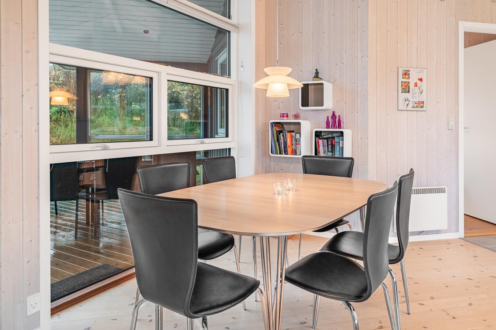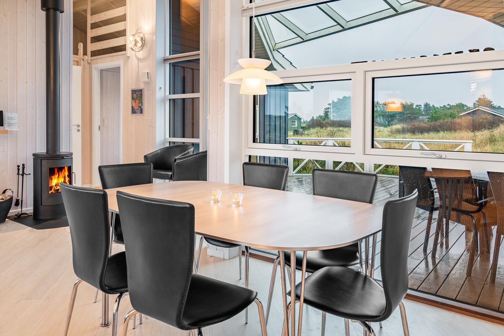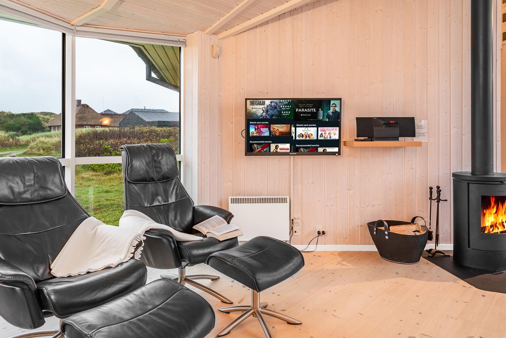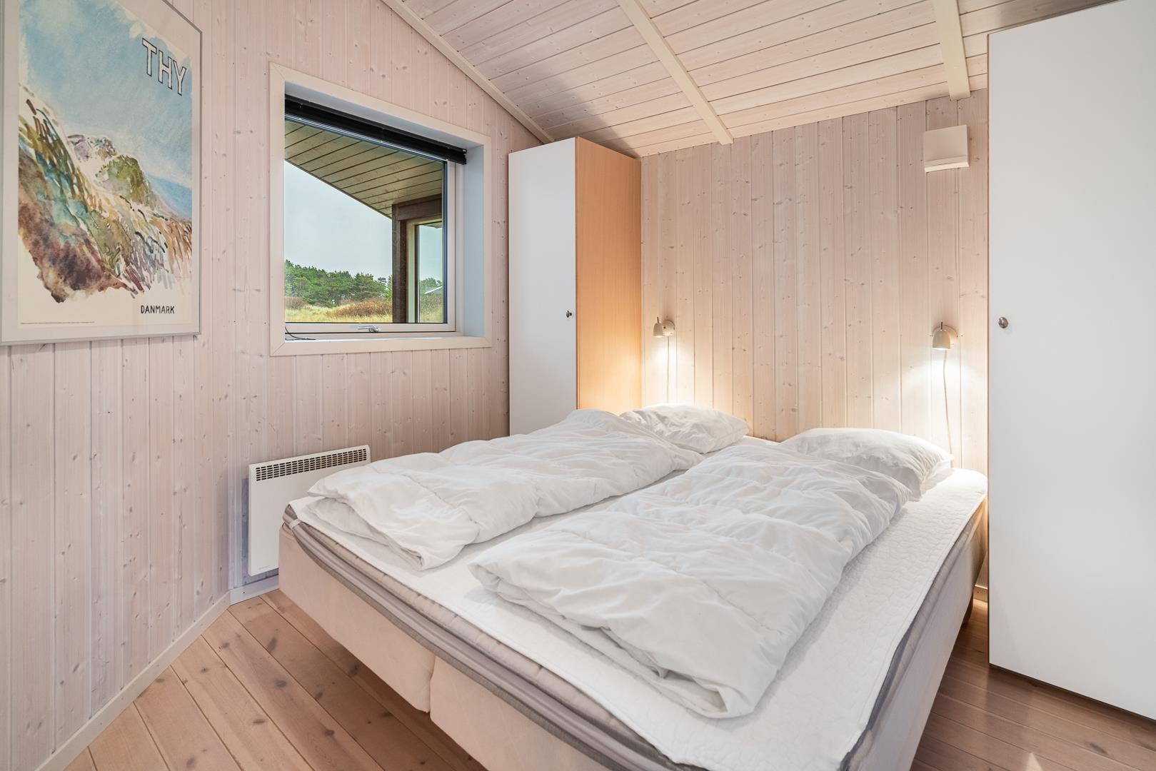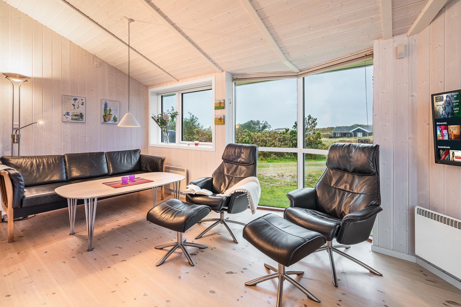På en klitgrund i rolige omgivelser ligger dette dejlige feriehus. Huset fremstår overalt lyst og venligt med trægulve, er smagfuldt indrettet med mange moderne bekvemmeligheder. Huset har 3 gode soverum og et flot badeværelse med spa og sauna, samt ekstra badeværelse med bruser. Det veludstyrede køkken ligger i åben forbindelse med stuen med brændeovn og fladskærms TV. Fra stuen er der udgang til skøn træterrasse hvor sol, fred og udsigt kan nydes.