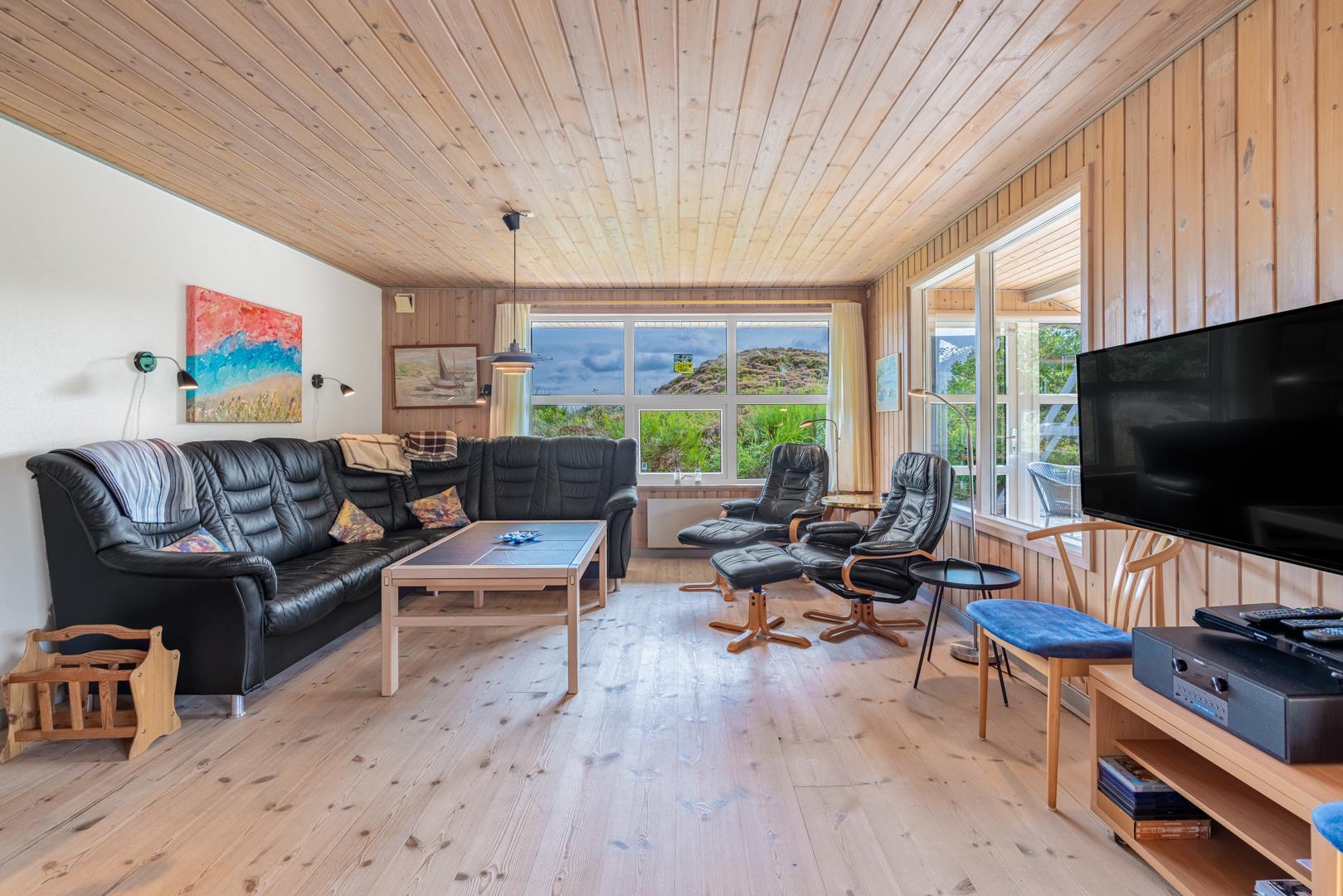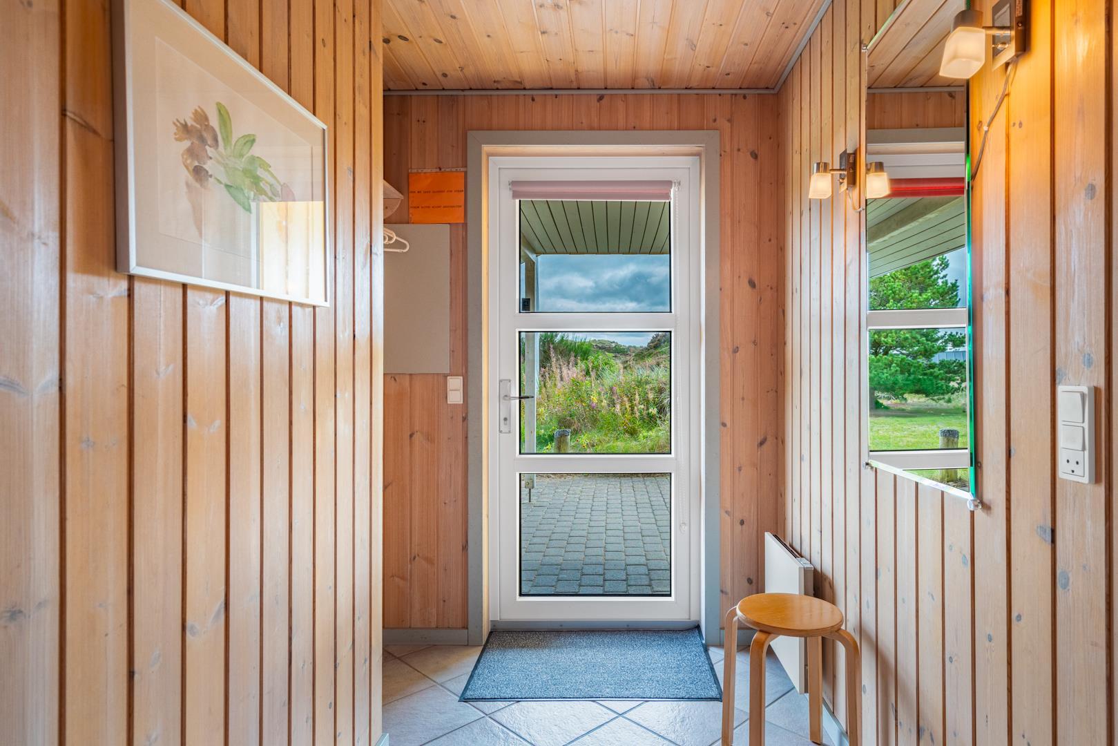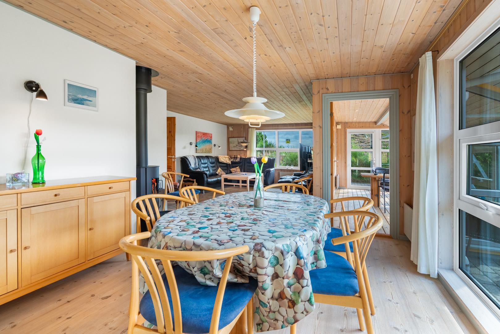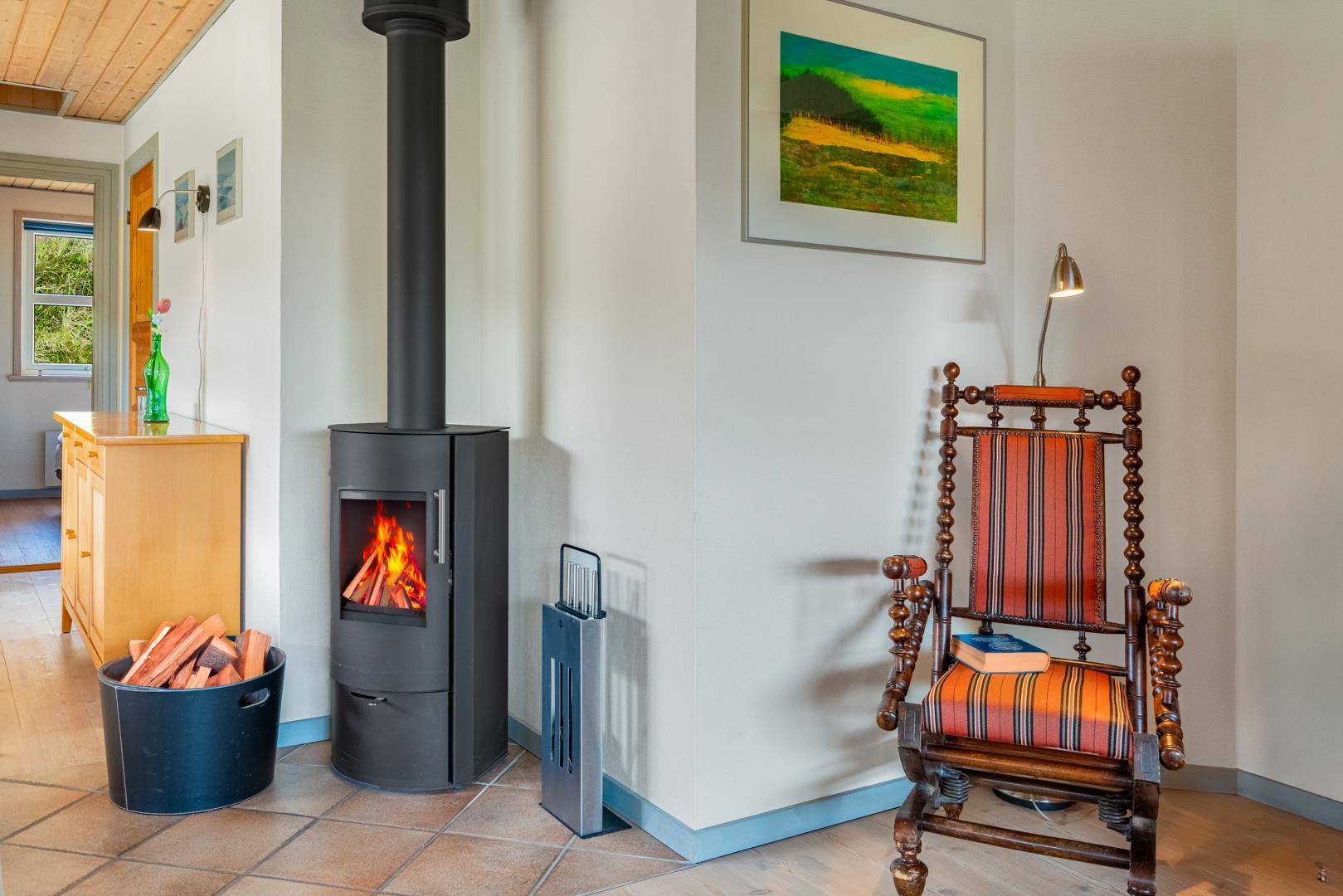 Indendørs finder du entréen med praktisk plads til overtøj og sko, stuen byder velkommen med en hyggelig brændeovn og adgang til en dejlig udestue - perfekt til aftener med spil og bland selv slik, mens du mærker varmen fra brændeovnen.
