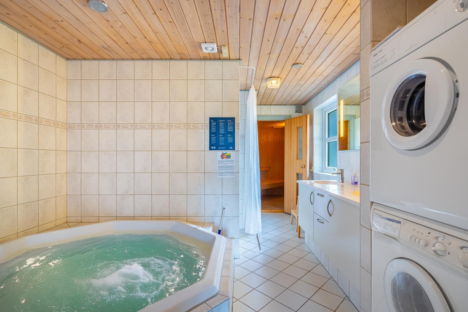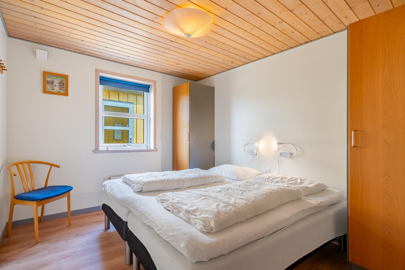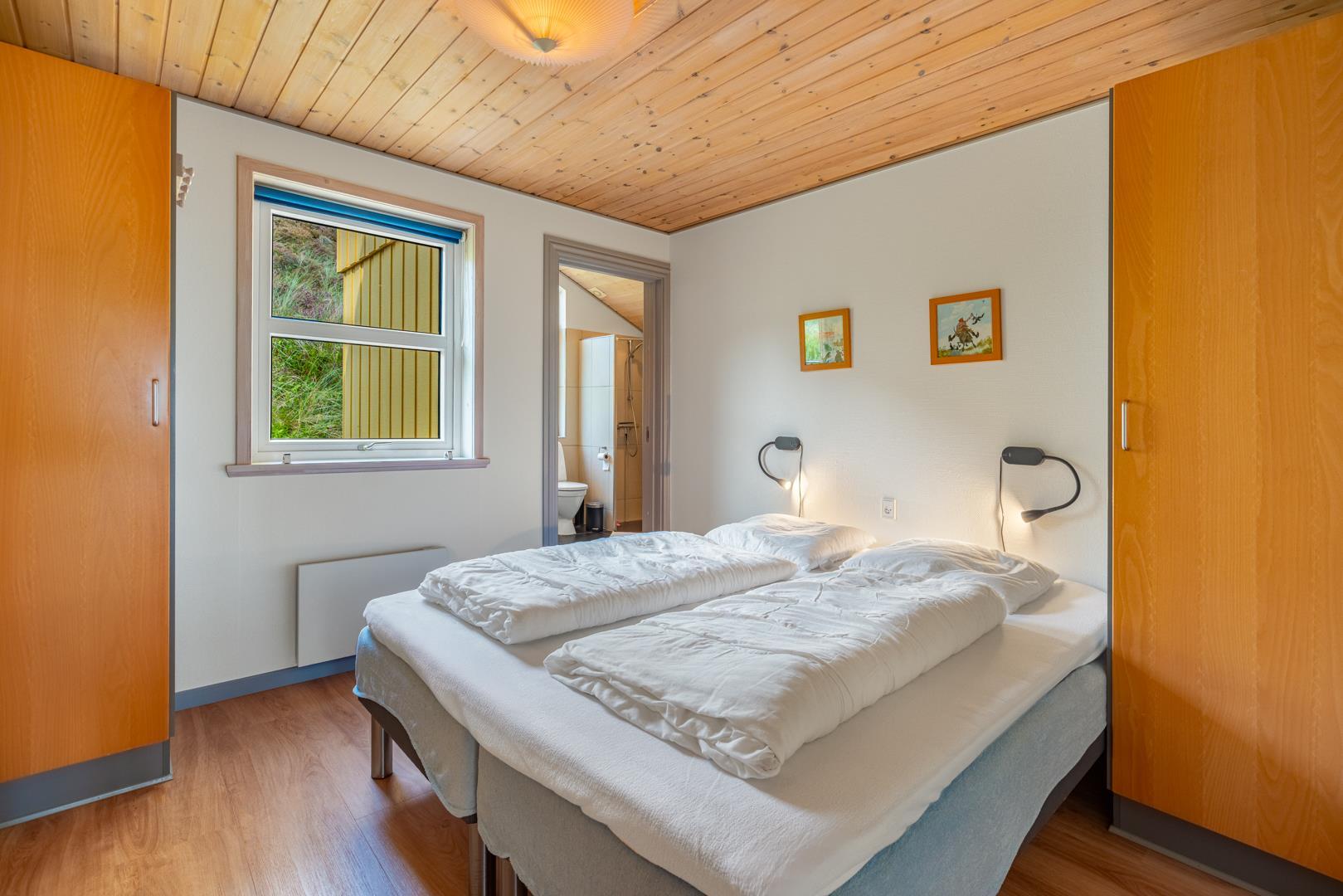 Badeværelset forkæler med en fire-personers spa og sauna, suppleret af et ekstra toilet. I feriehuset finder du to soveværelser med dobbeltsenge på 180x200 cm (1 madras) og 160x200cm (1 madras), et værelse med to køjesenge med sengestørrelser på 80x200 cm samt to sovepladser på hemsen.