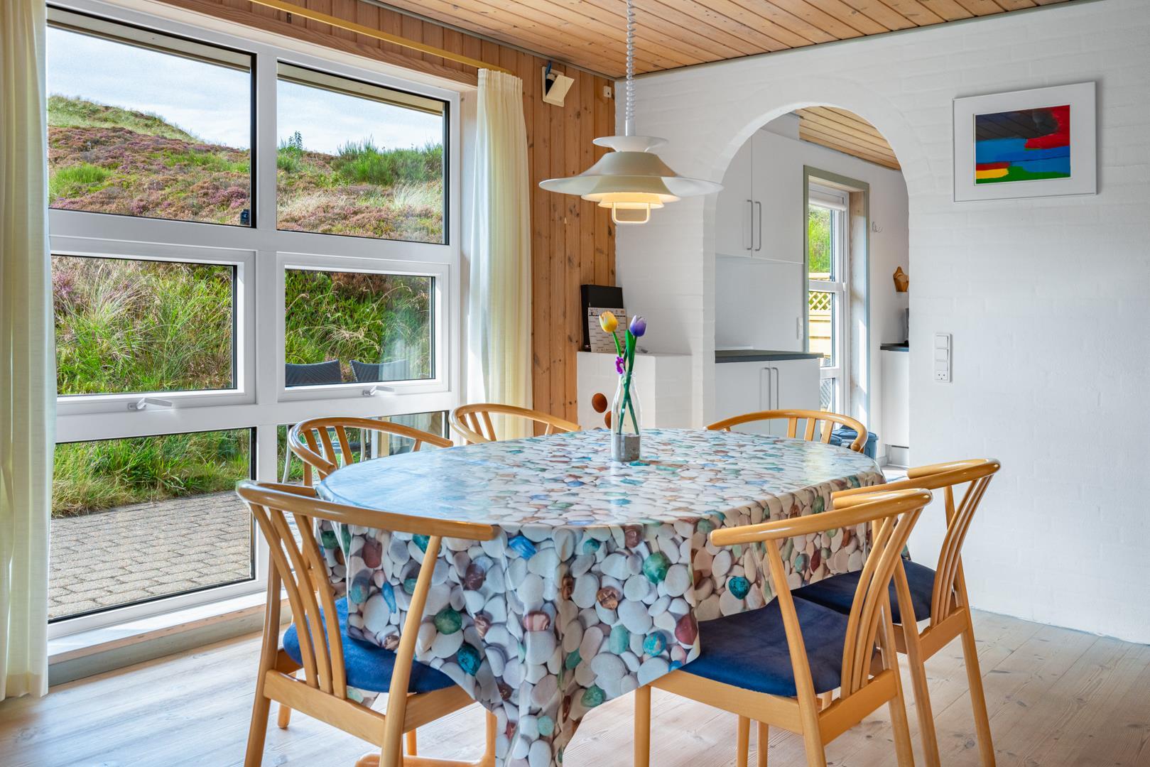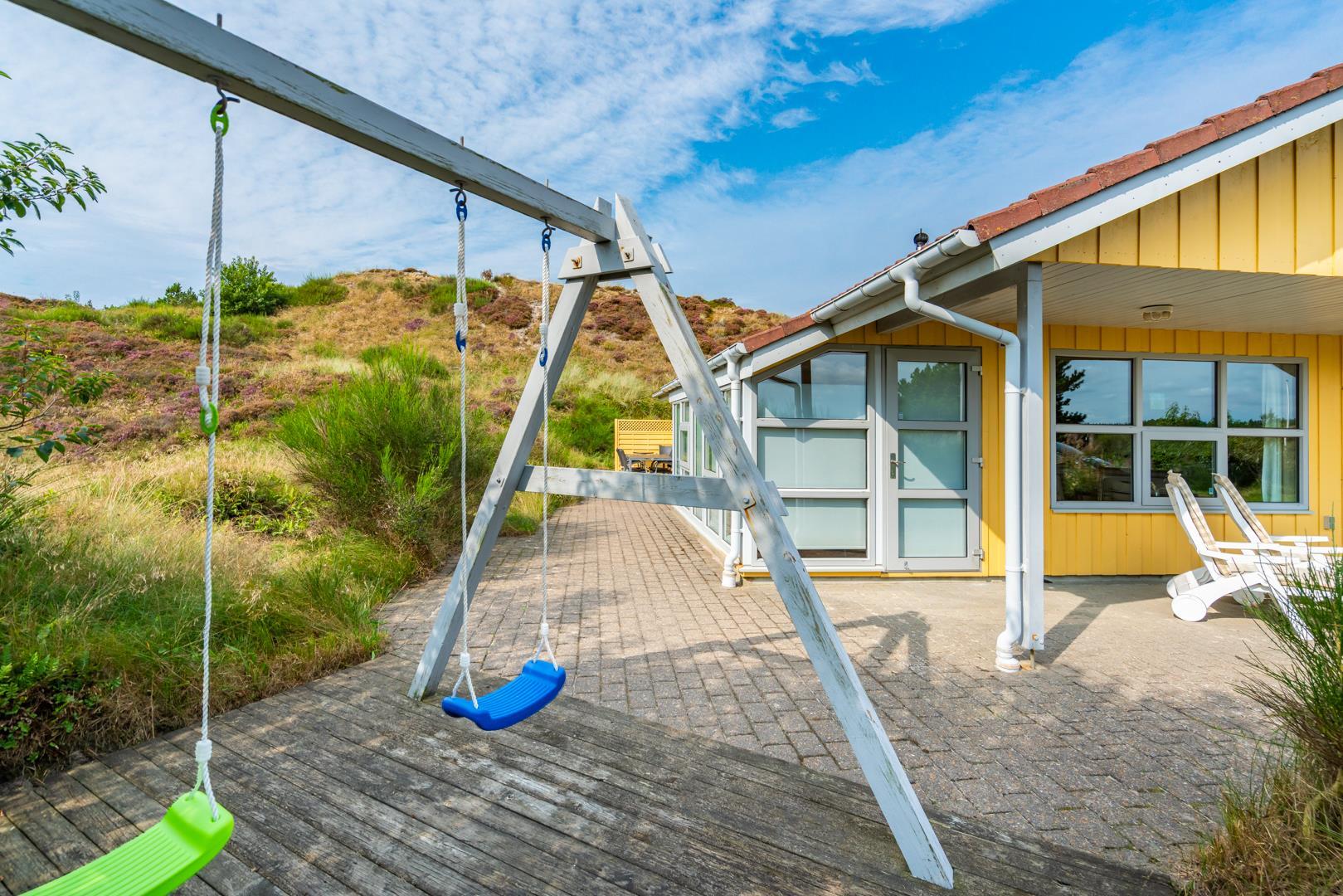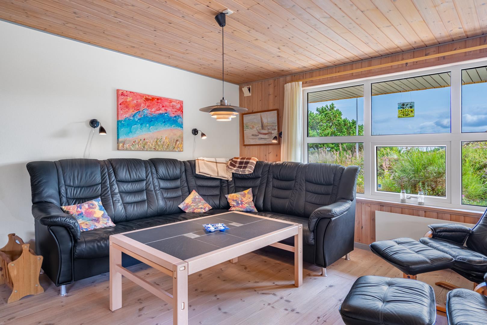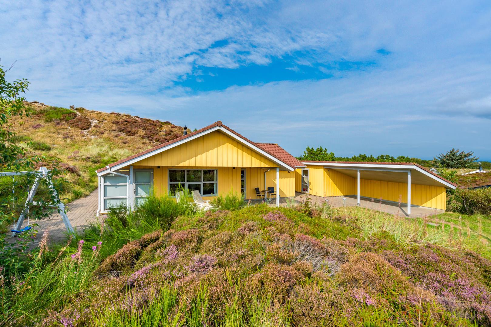 Sommerhuset ligger i gåafstand til Henne Strand by, hvor du kan nyde byens gode shopping muligheder, restauranter og lyden af Vesterhavets brusen. Der er gode muligheder for at udforske de omkringliggende naturstier – husk derfor at medbringe cyklerne.