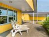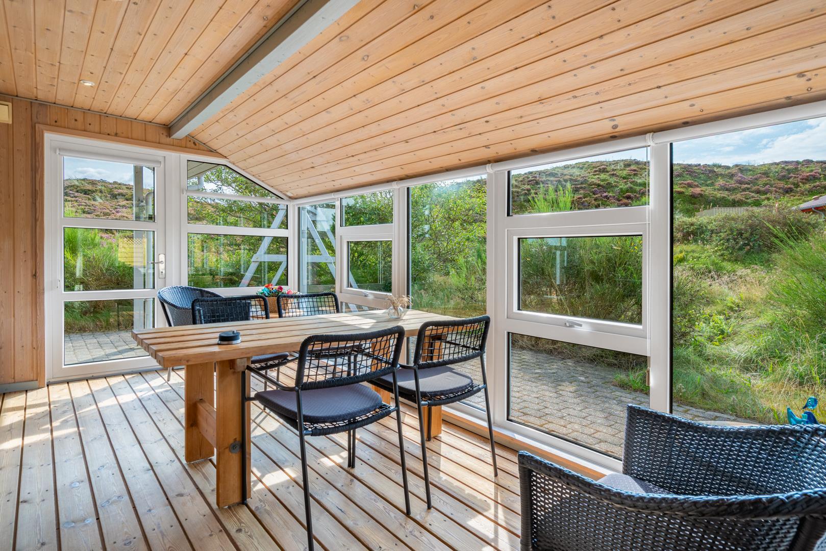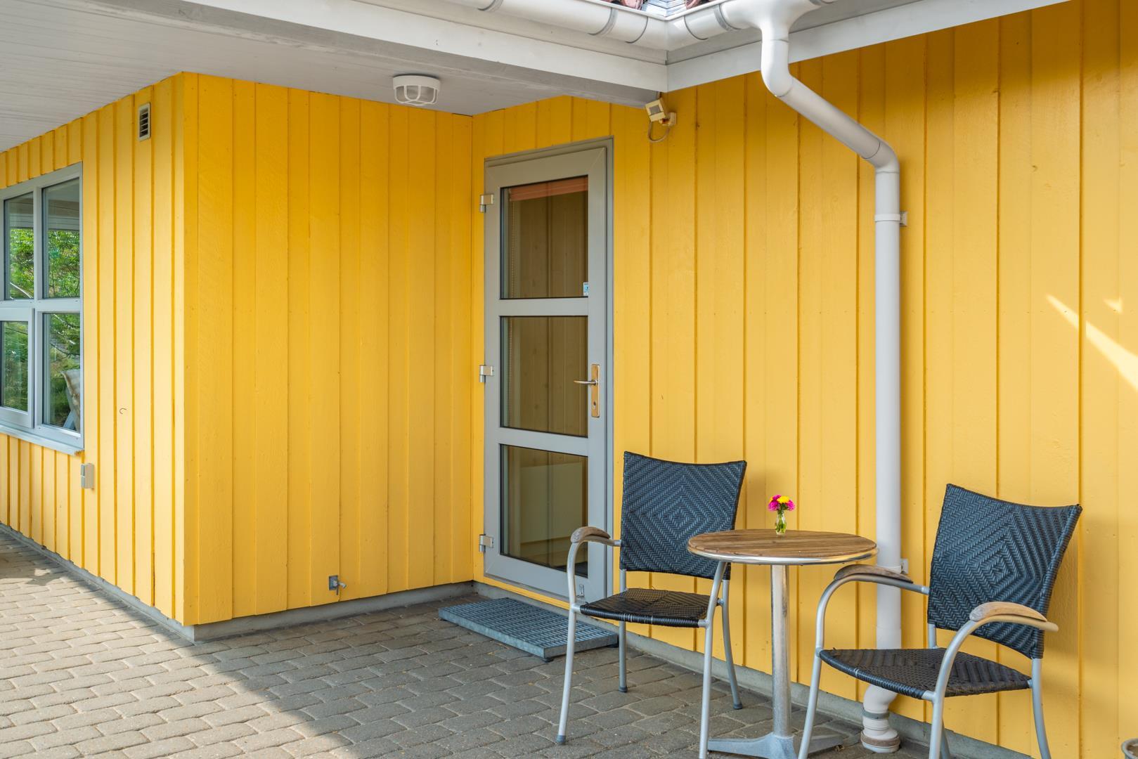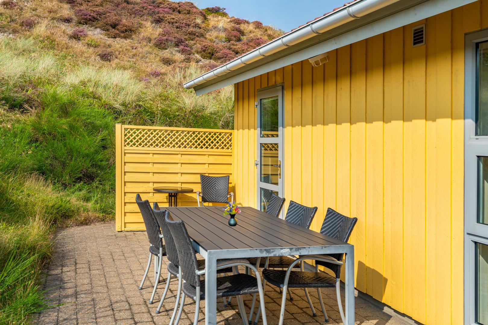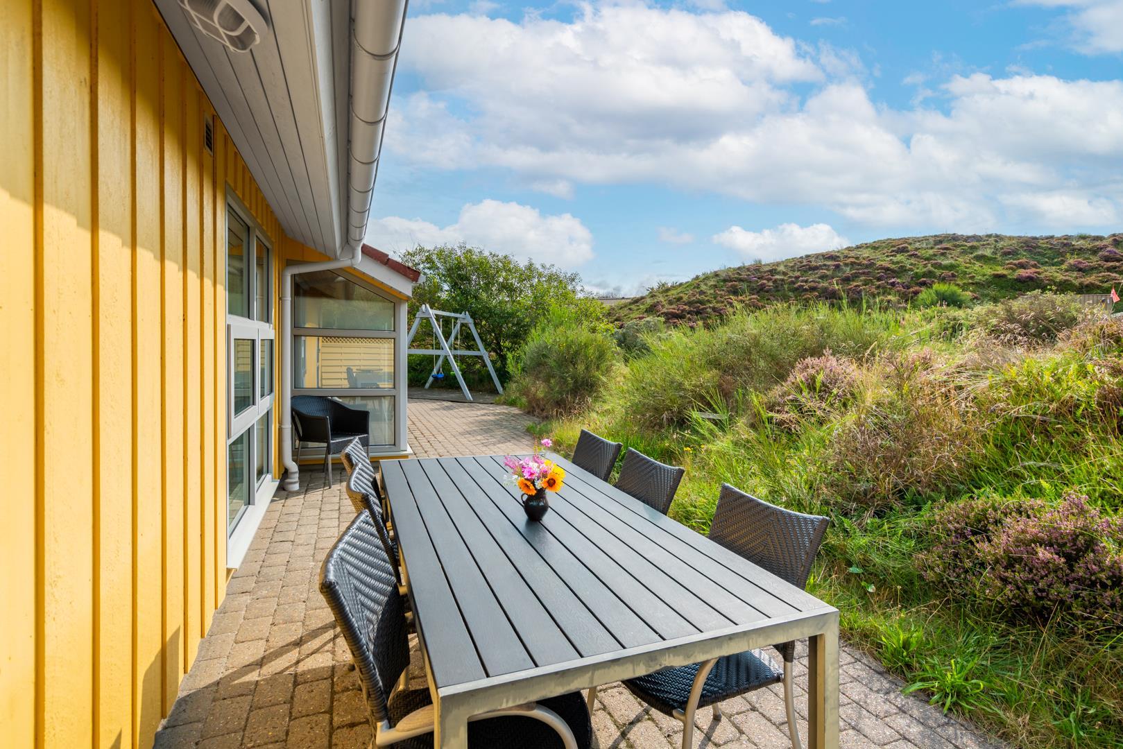 En stor, flisebelagt terrasse byder på muligheden for at fordybe sig i den smukke natur du finder lige uden for sommerhuset.