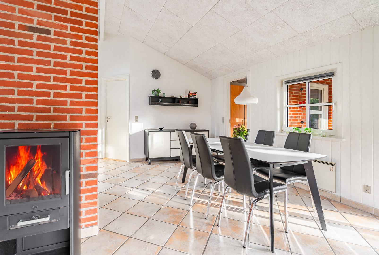 Turen hen til sommerhuset er en del af charmen; allerede når du kører gennem det grønne sommerhusområde, kan du begynde at slappe af. Hedelandskabet åbner sig på venstre side af bilen, lidt nede af Lyngbovej, og når du kommer til nummer 32, titter det røde murstenshus frem mellem nåletræerne trukket lidt tilbage for vejen. Sommerhusstemningen er skruet helt op indenfor i huset. Ikke mindst i stuen, hvor brændeovn og bløde møbler er med til at sætte scenen. Mange timer kan gå med at hygge og pjatte i spabadet eller saunaen, og gode familiestunder med brætspil kan finde sted i brændeovnens skær i stuen.