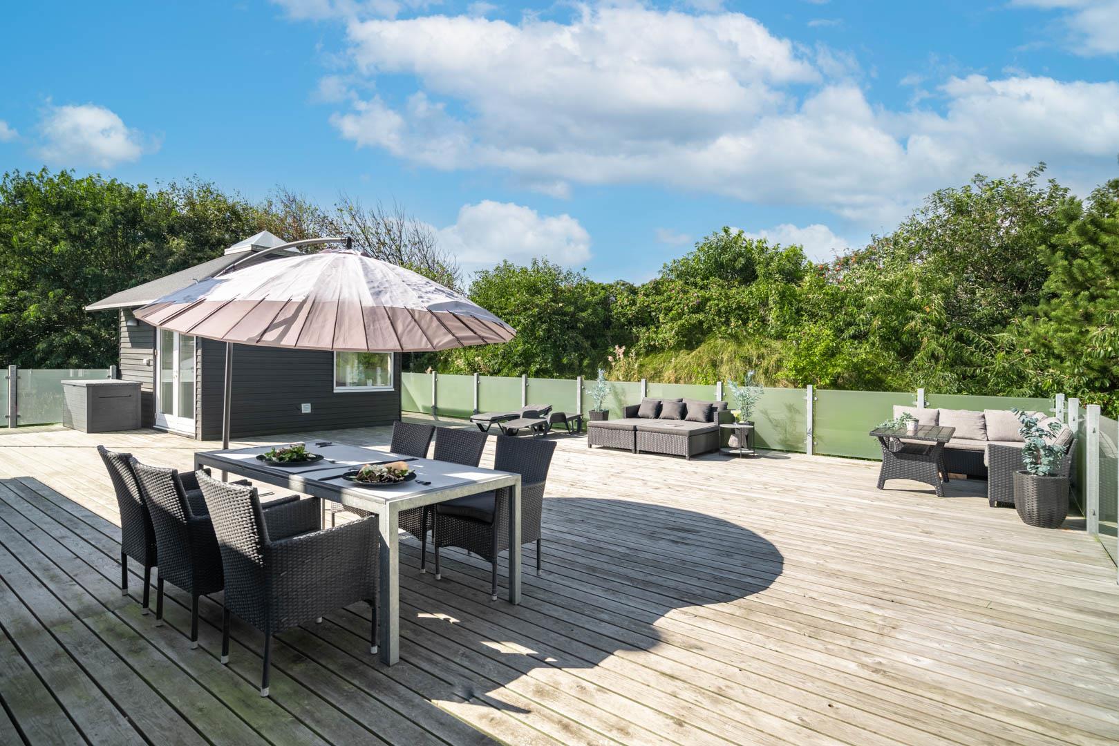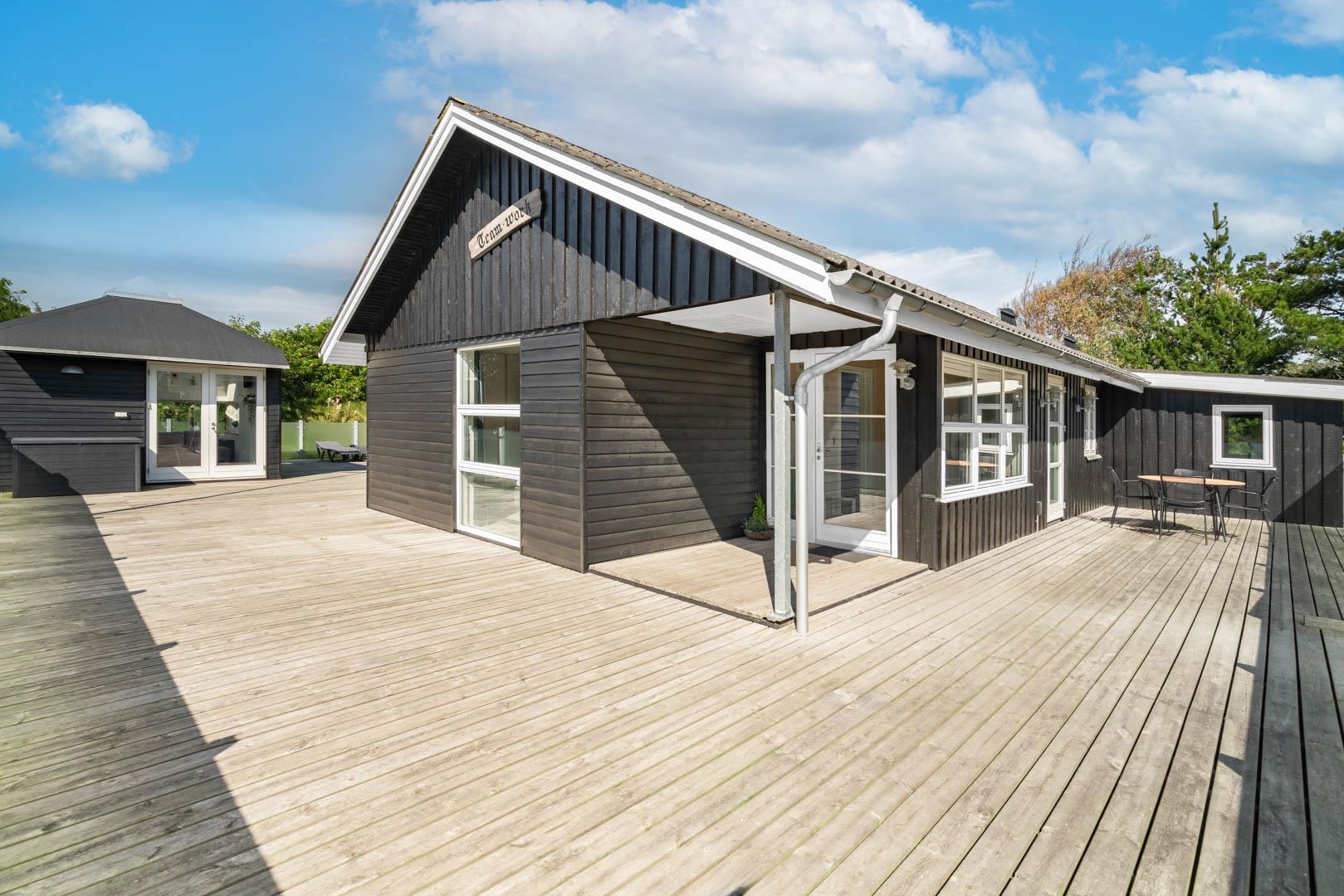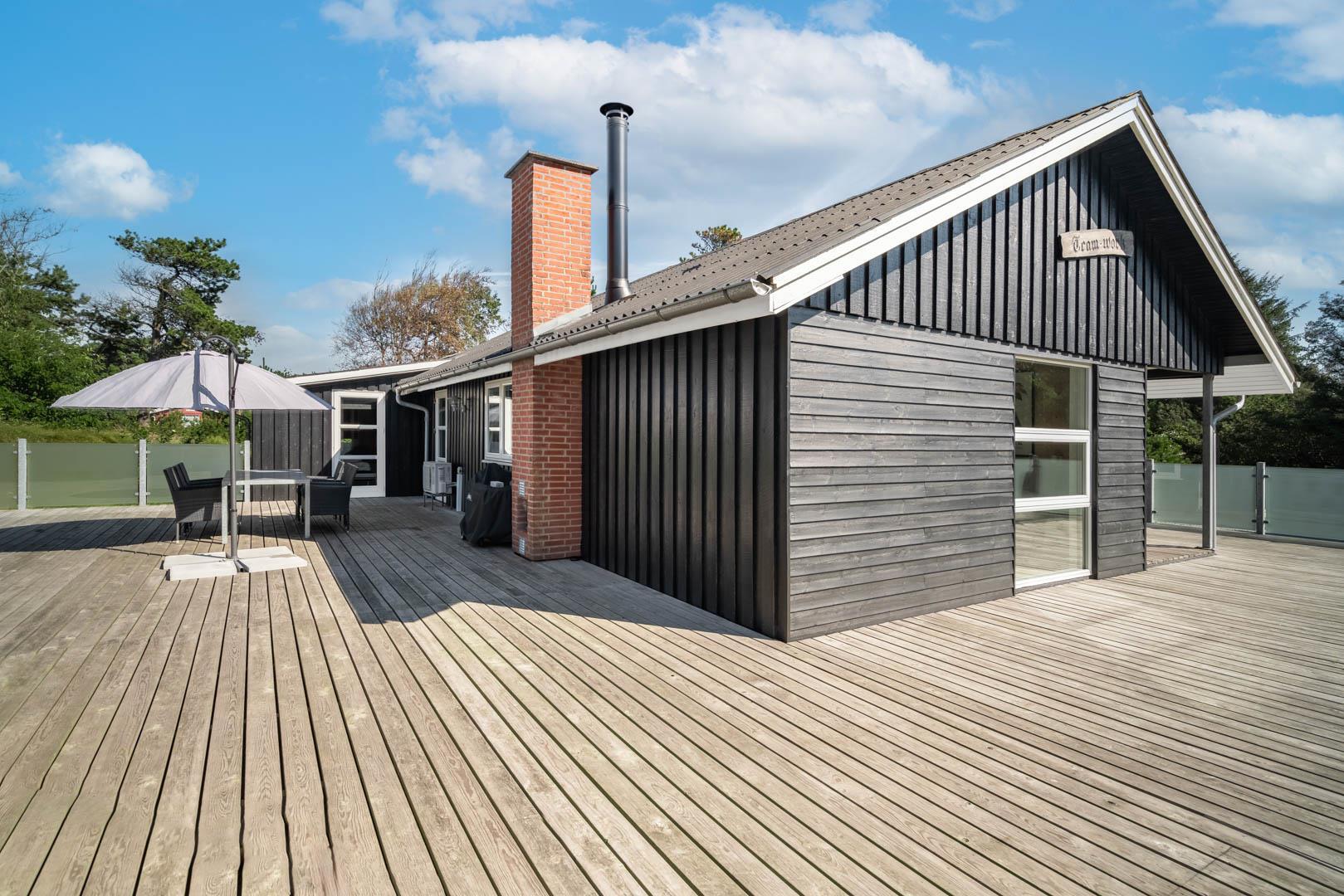 Hyggeligt feriehus ved Henne Strand med stor lukket terrasse, sauna og tæt på Vesterhavet og natur.