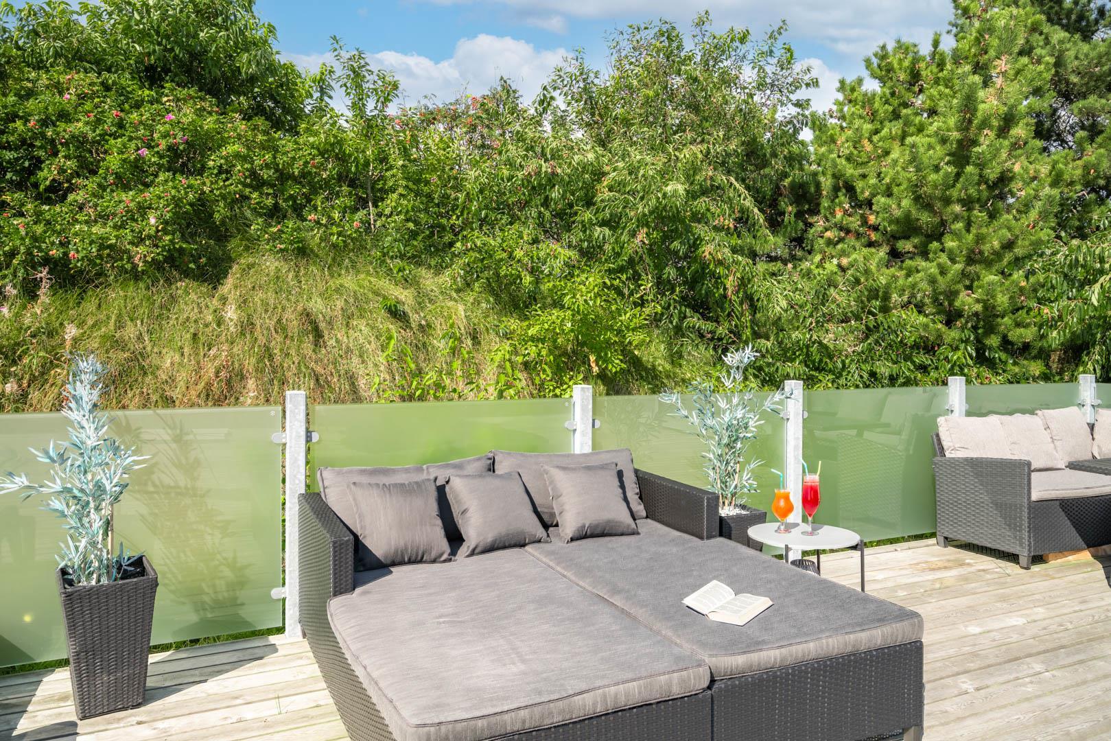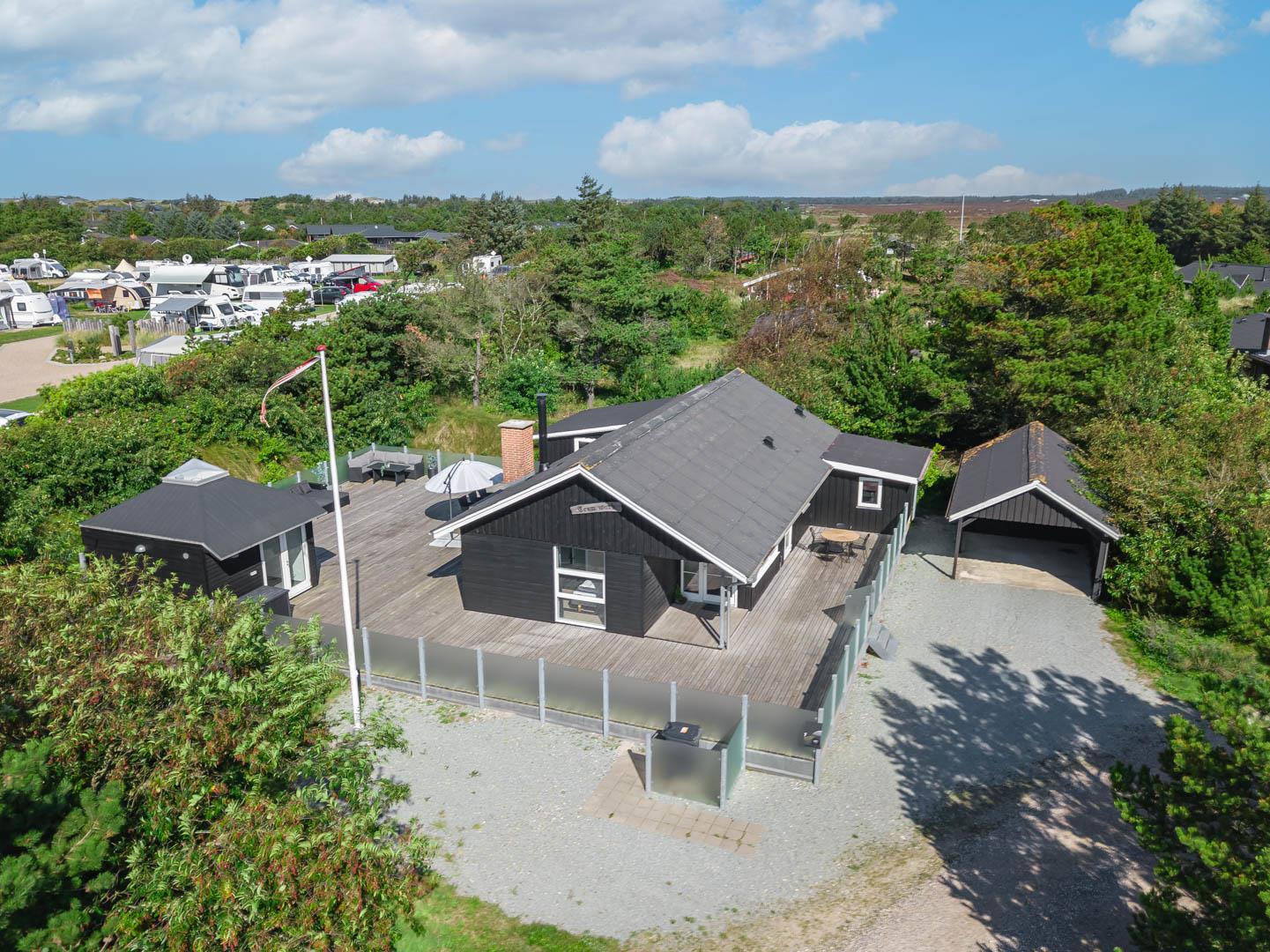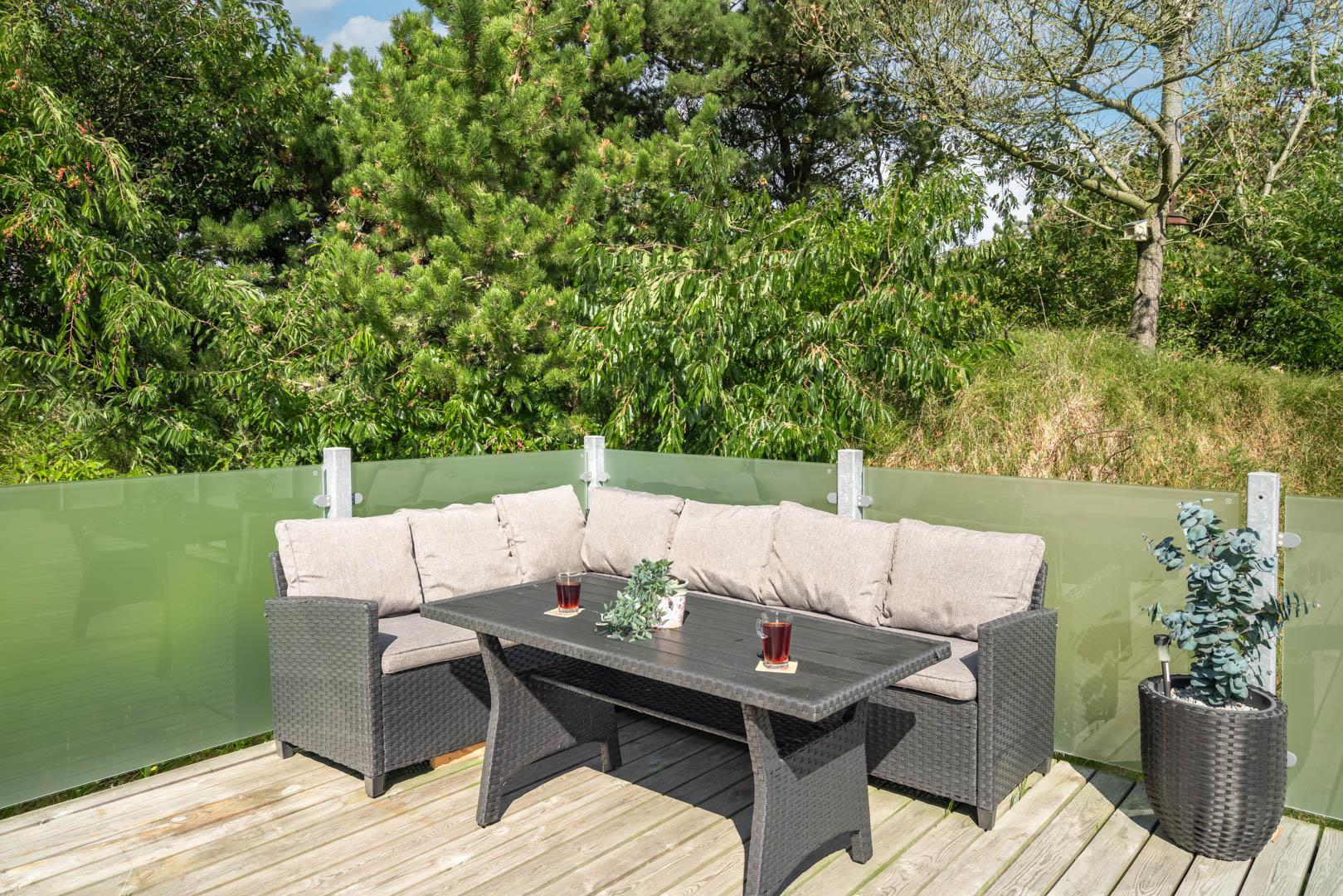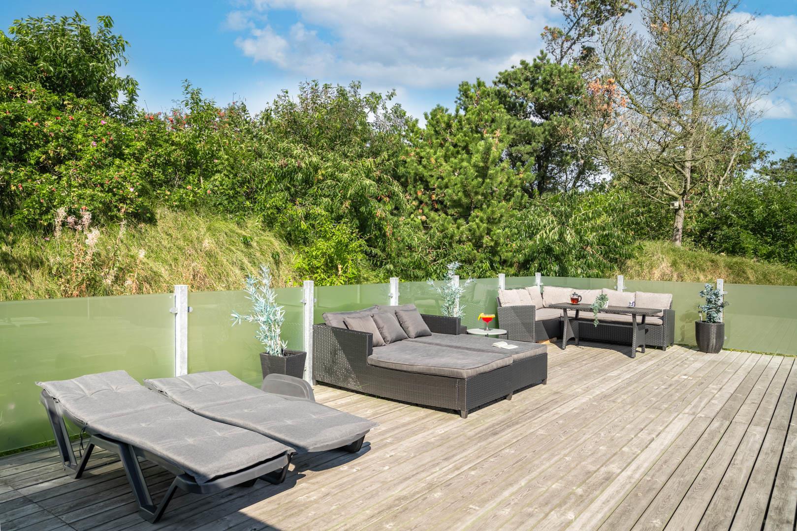 Hyggeligt feriehus ved Henne Strand med stor lukket terrasse, sauna og tæt på Vesterhavet og natur.