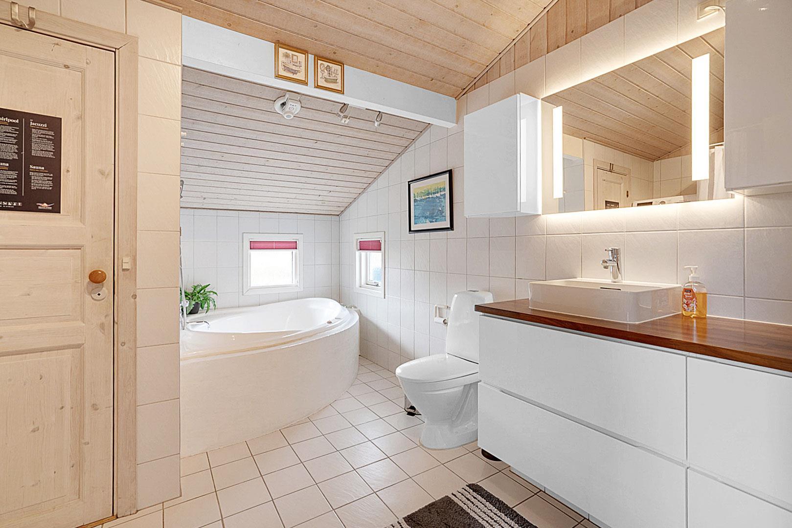 Veludstyret køkken/alrum indrettet med flotte møbler. Stort lækkert badeværelse med spa og sauna. Huset råder endvidere over et gæstetoilet.