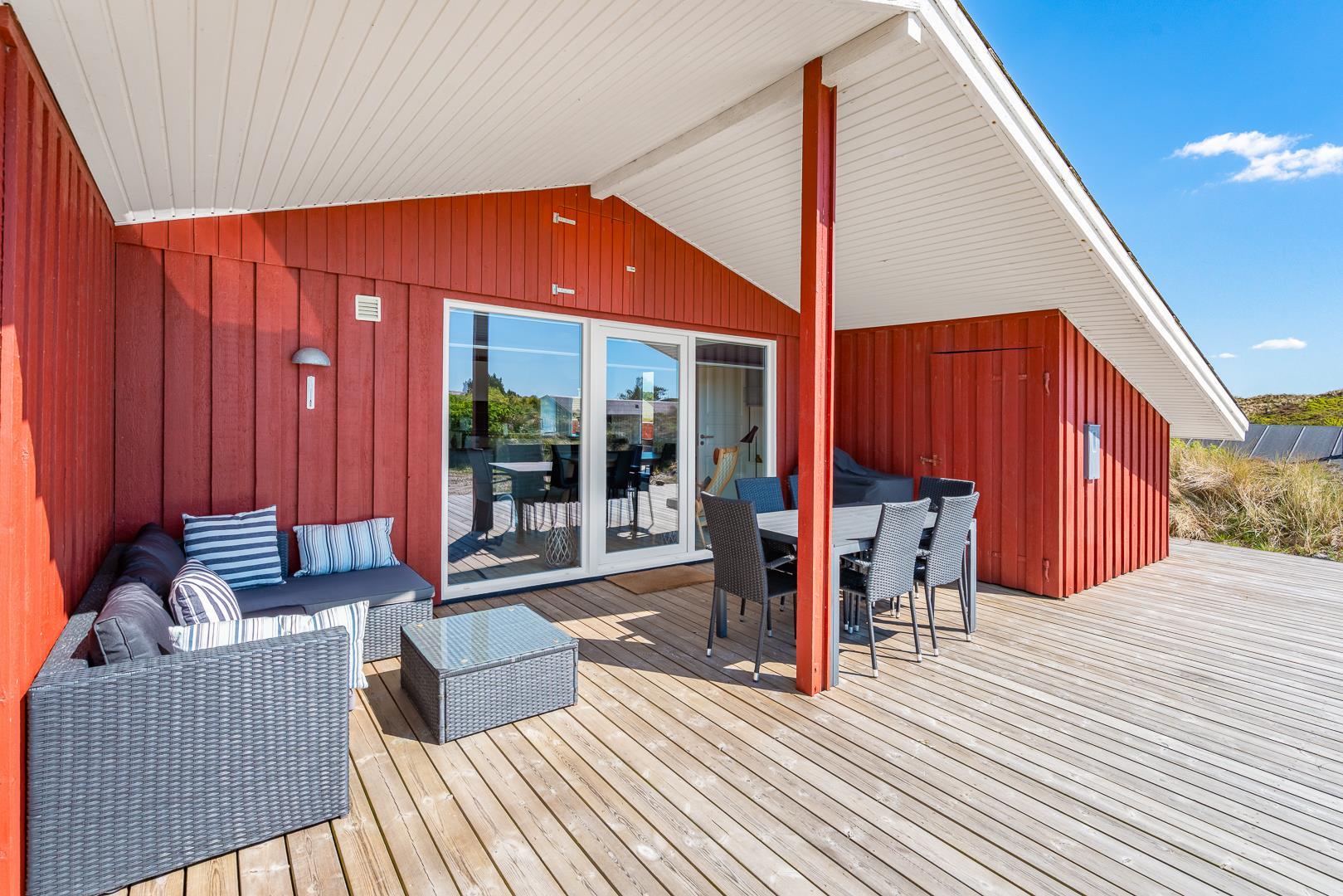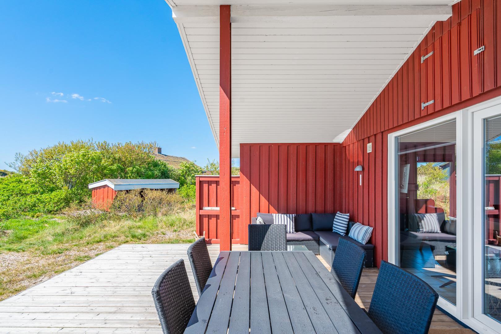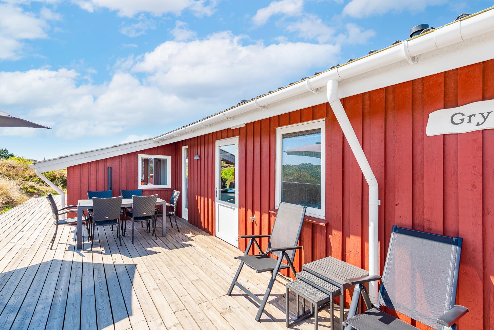 Udenfor inviterer huset jer til at nyde dagen fra morgen til aften. På sydterrassen kan I fange de første solstråler, mens vestterrassen er oplagt til at afslutte dagen med en smuk solnedgang.