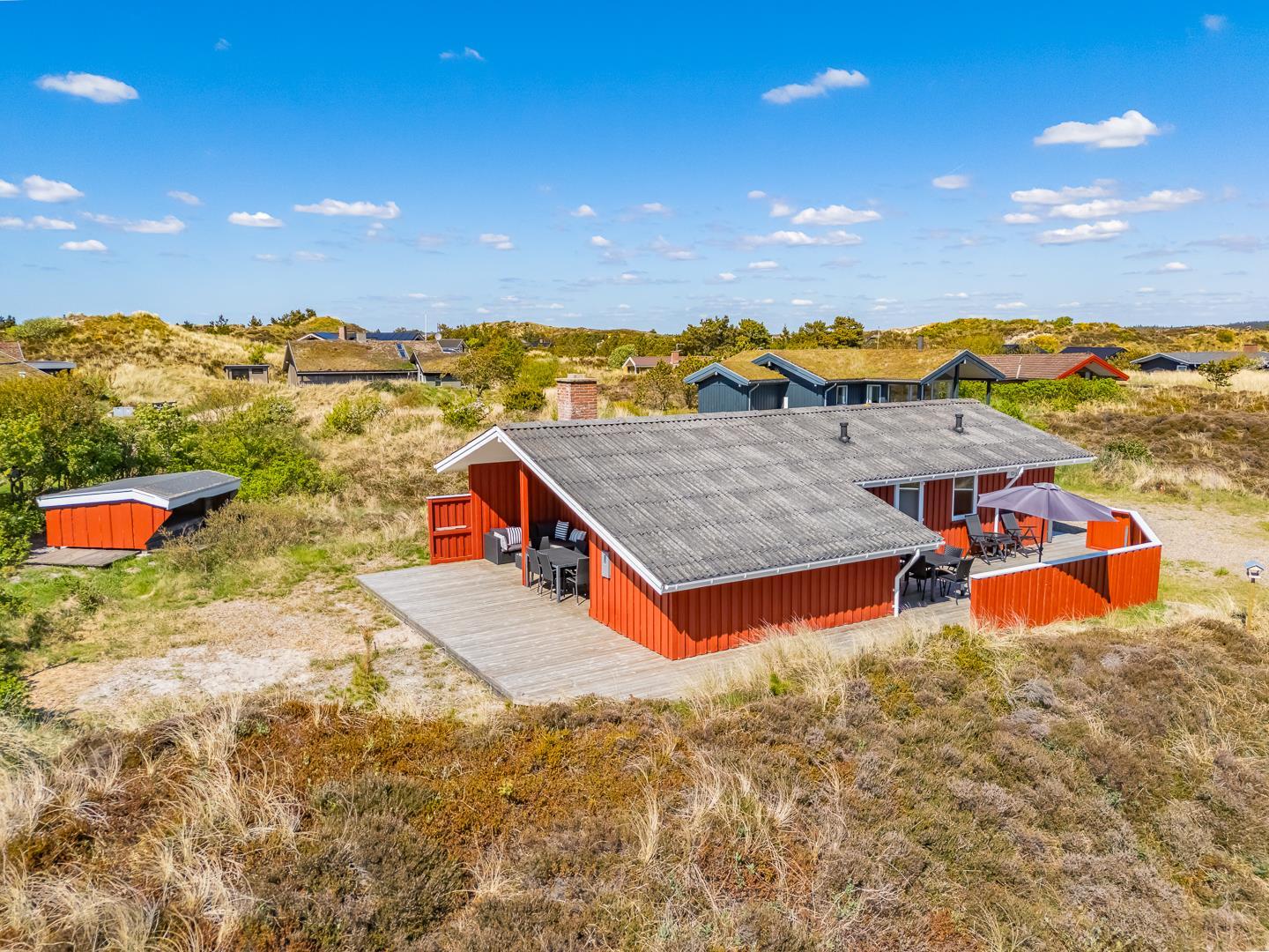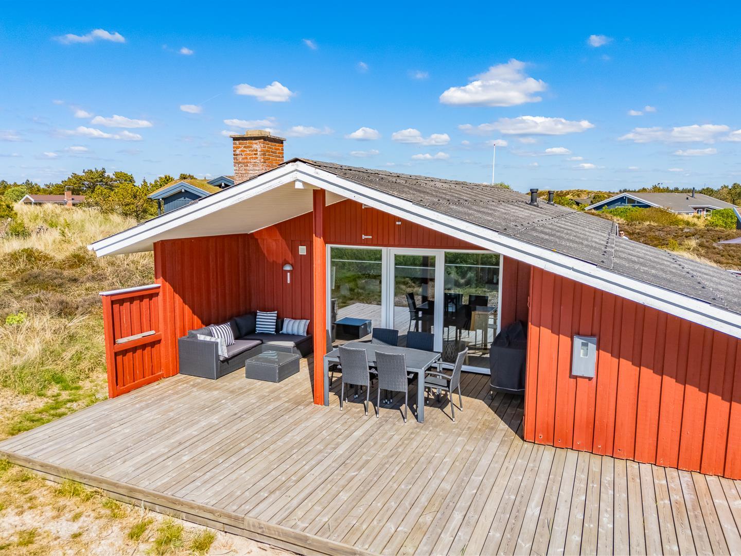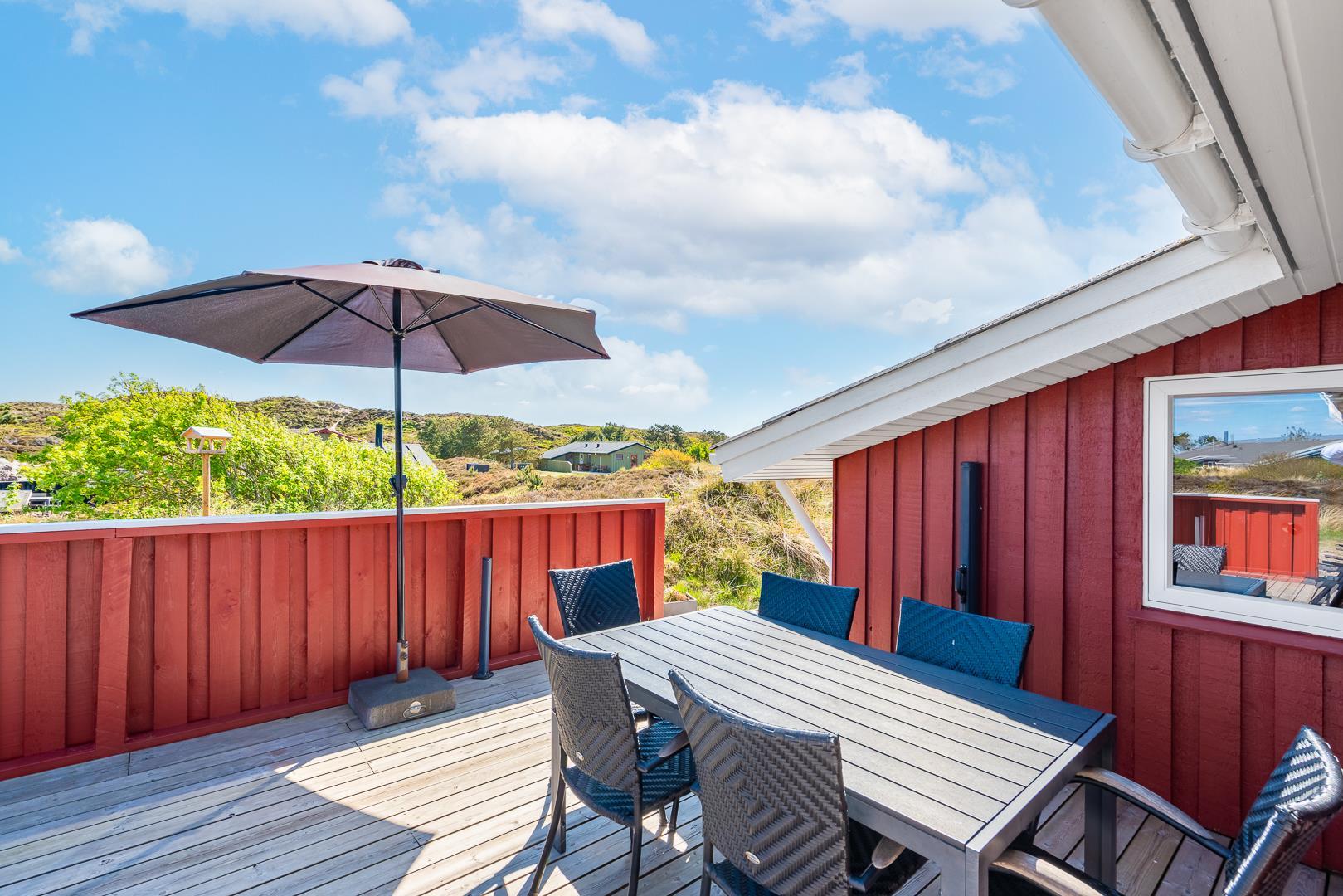 Udenfor inviterer huset jer til at nyde dagen fra morgen til aften. På sydterrassen kan I fange de første solstråler, mens vestterrassen er oplagt til at afslutte dagen med en smuk solnedgang.