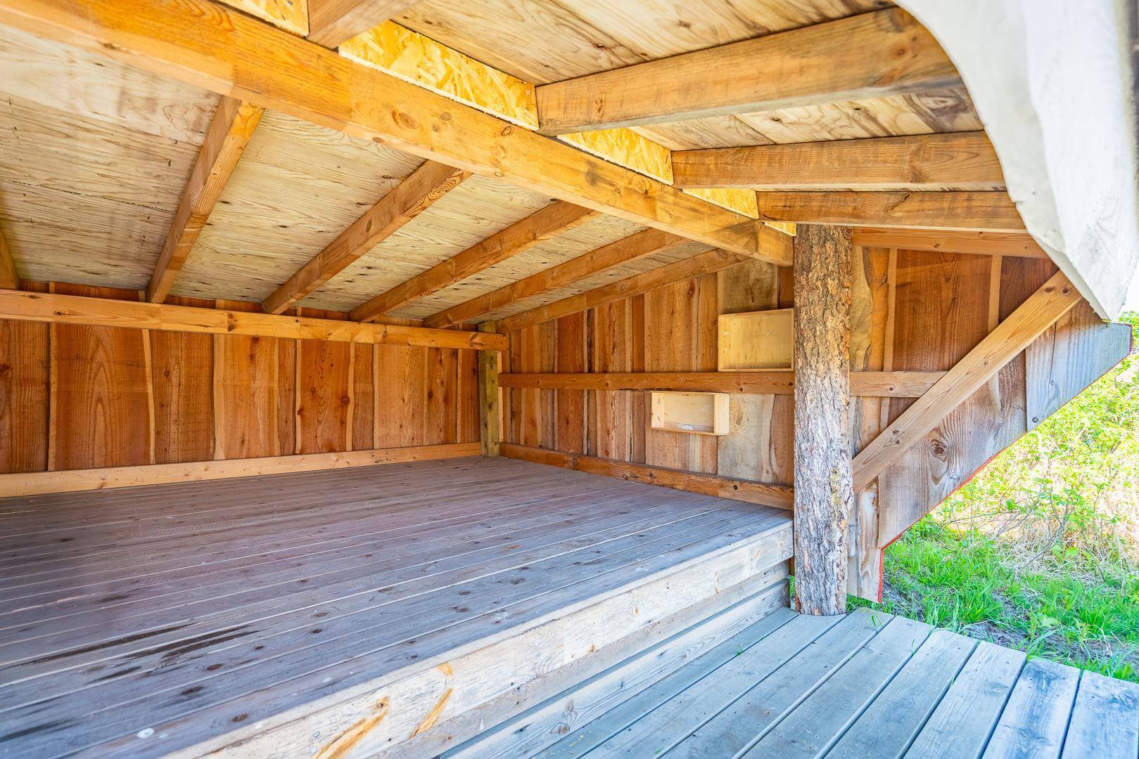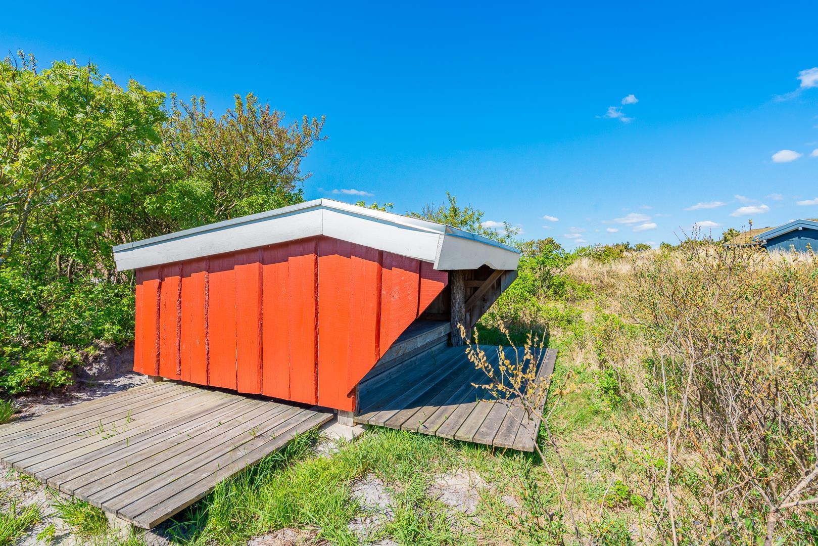 Solterrasser, udsigt til klitterne og et shelter midt i naturen