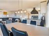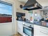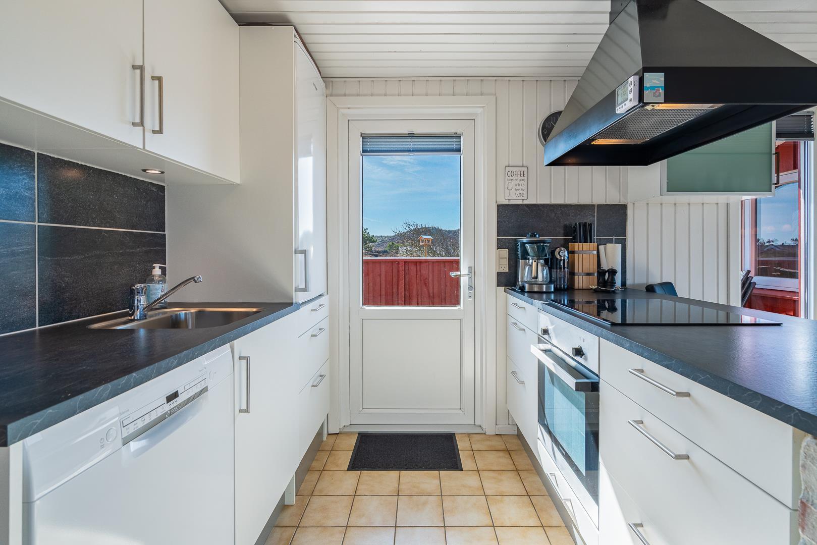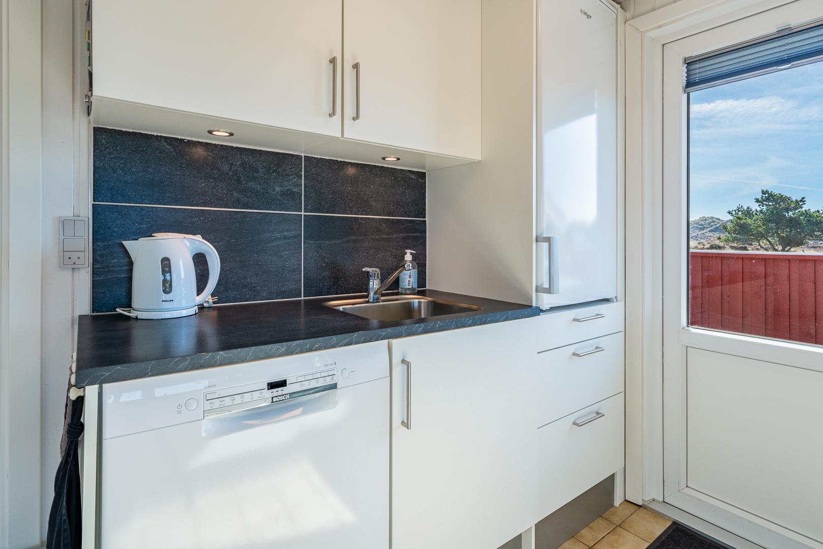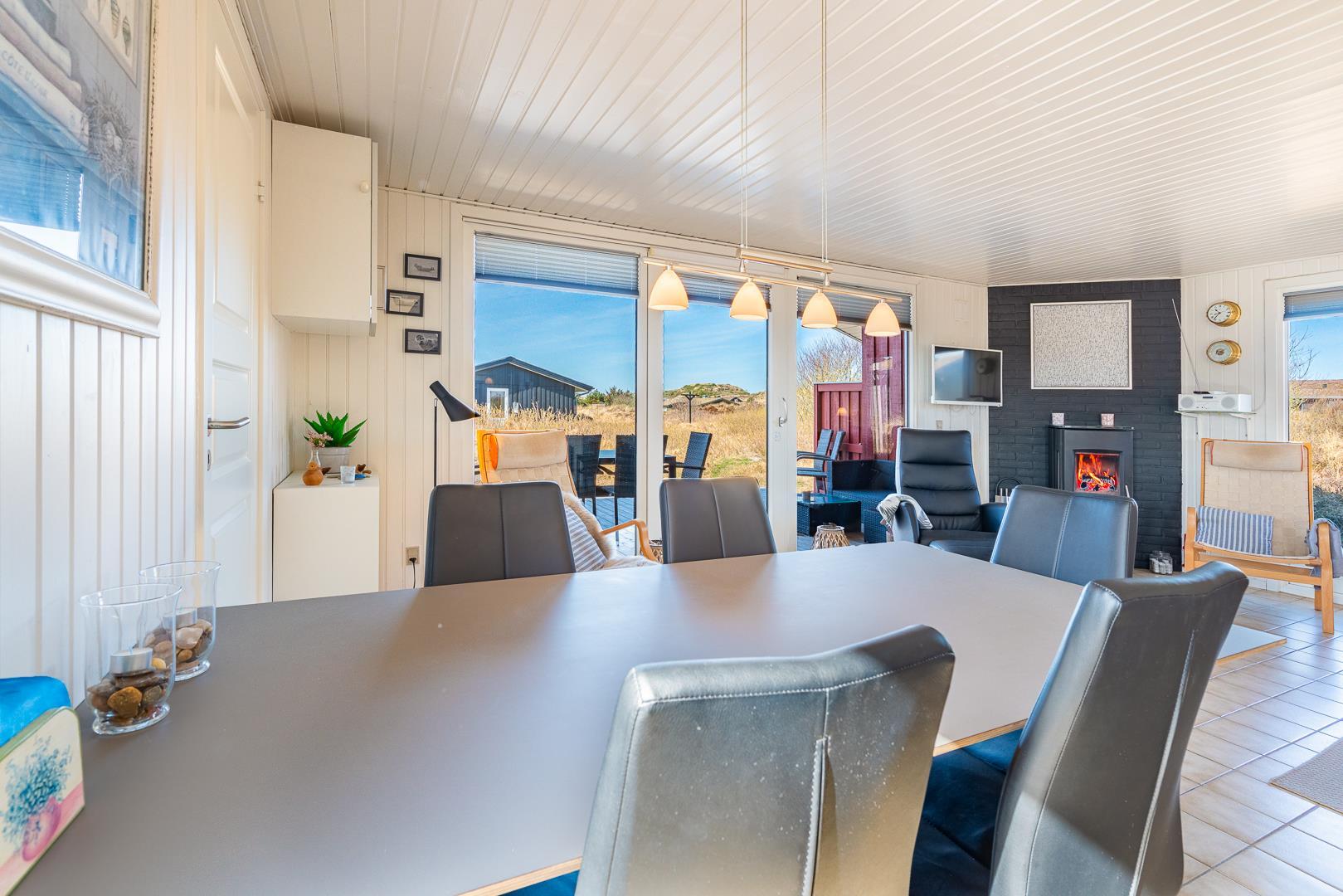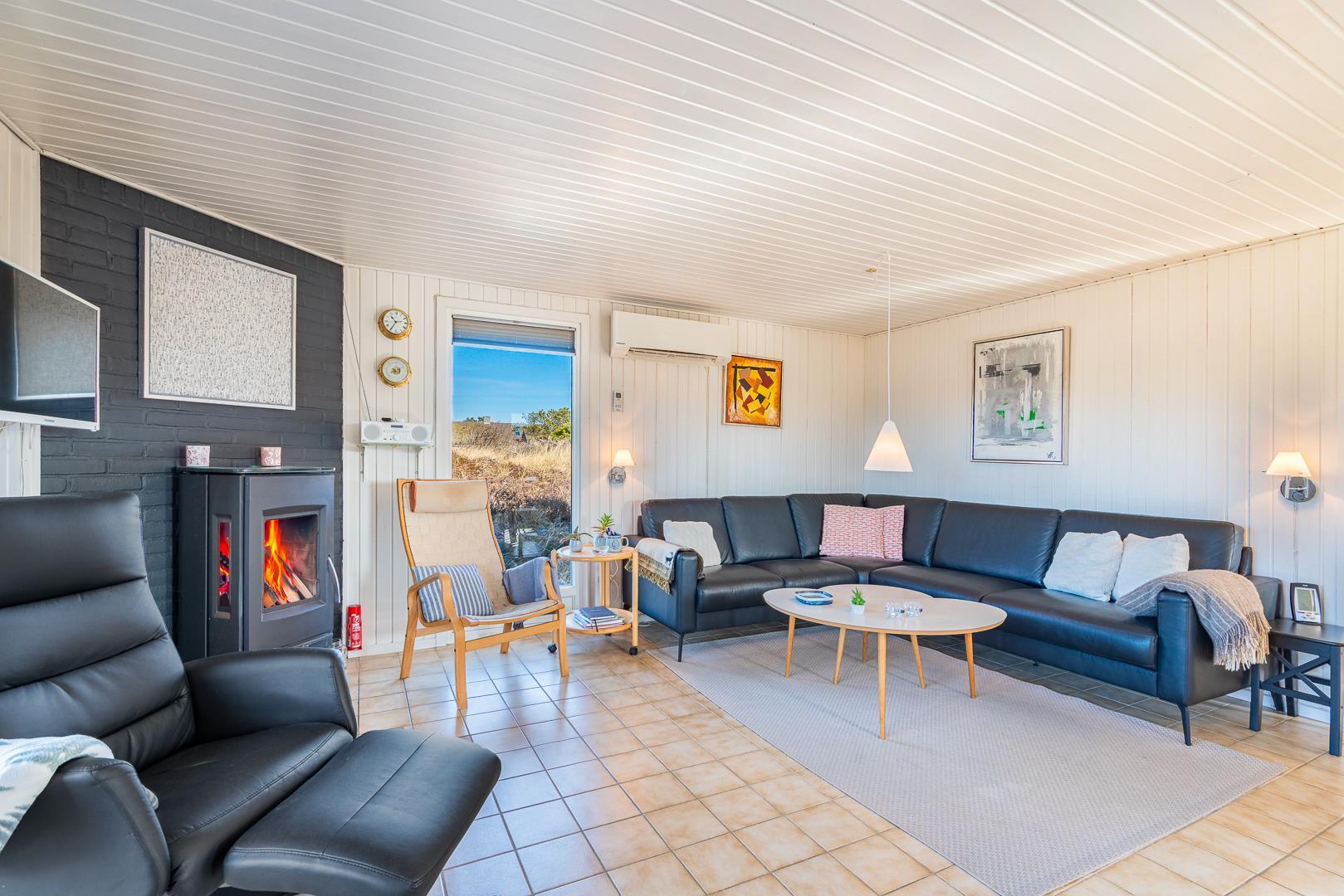 Stuen er integreret med køkkenet, og her kan I nyde varme stunder foran brændeovnen. En varmepumpe sørger for et behageligt indeklima året rundt. Køkkenet er veludstyret med bl.a. opvaskemaskine og ovn, og en vaskemaskine gør ferien ekstra bekvem – især hvis opholdet er lidt længere.