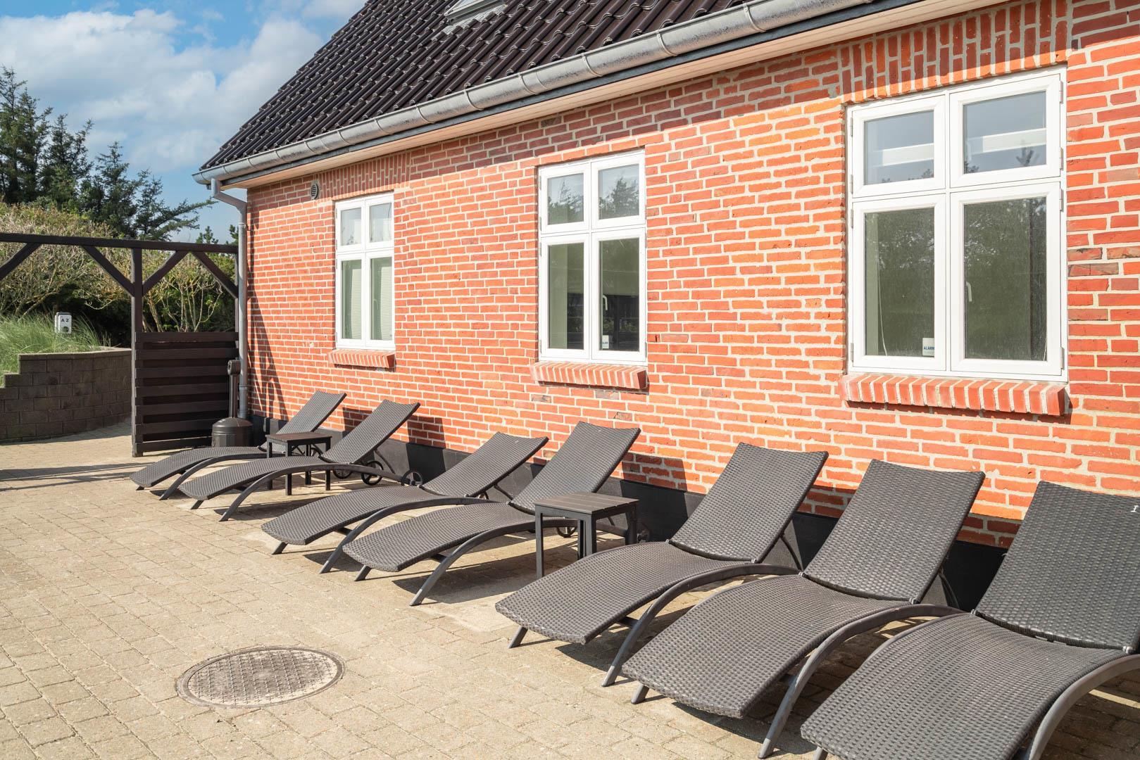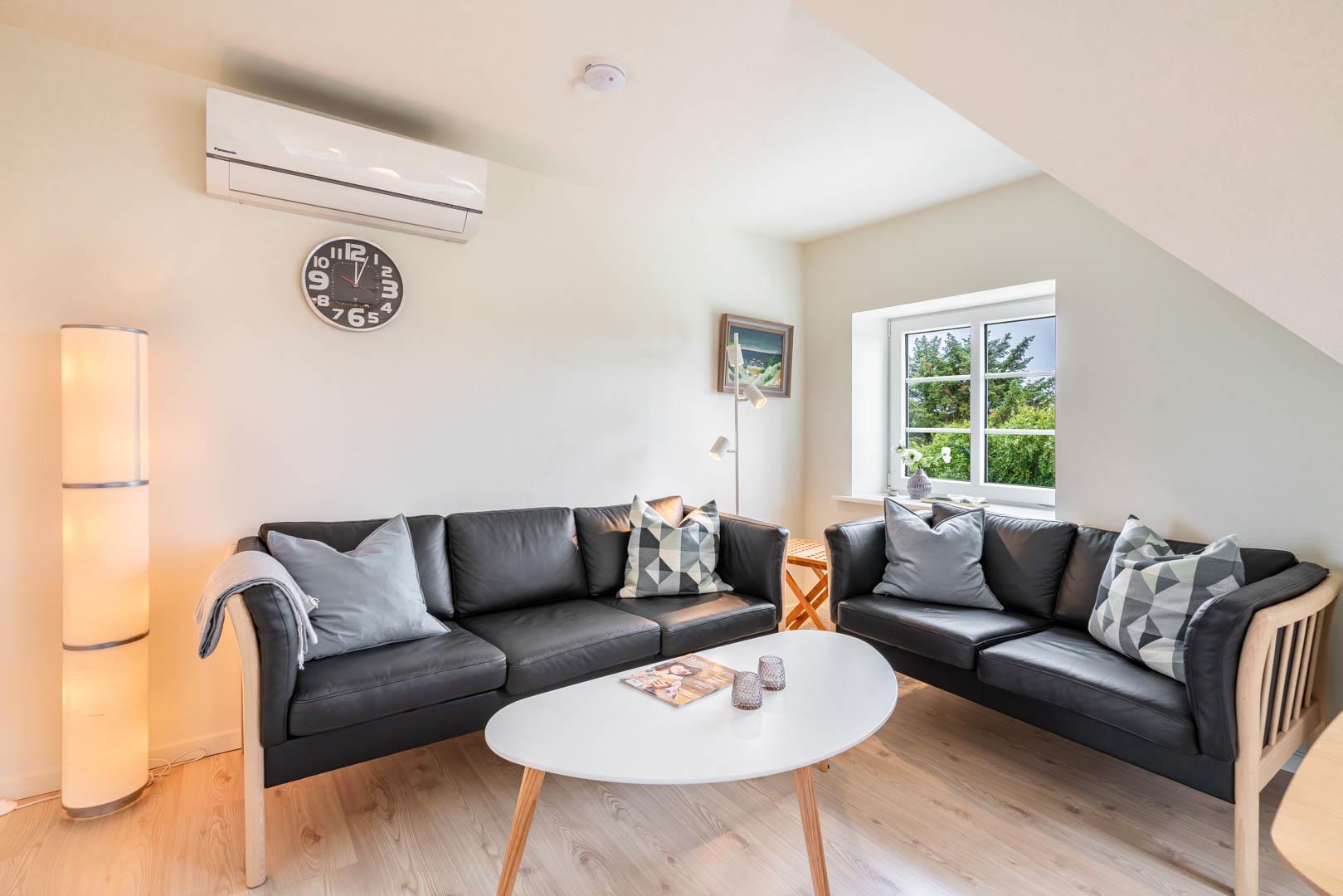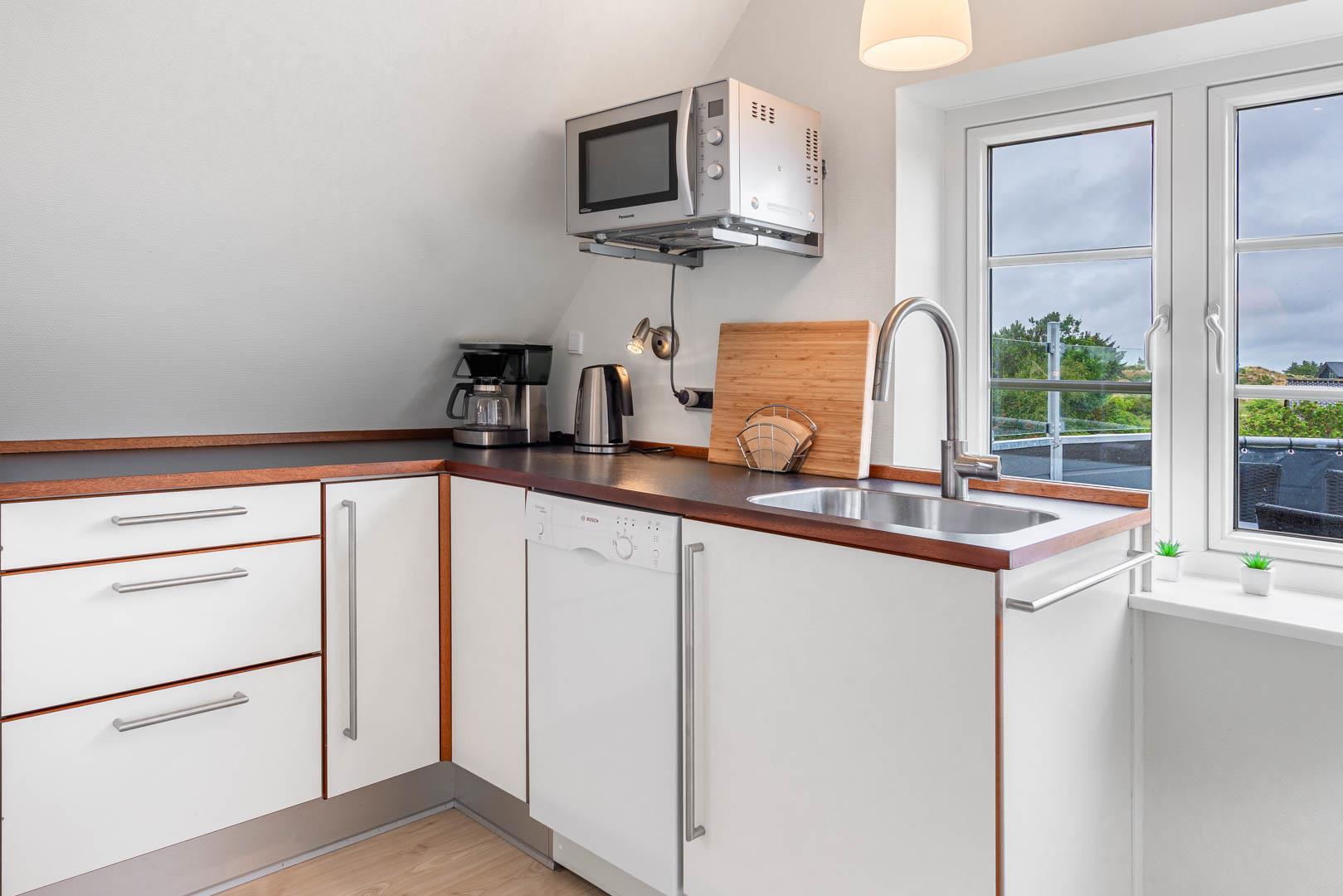 Veludstyret kvalitetslejlighed på 1. sal beliggende på en stor lukket naturgrund ikke langt fra Henne Strands centrum og vandet. Stor solrig terrasse. Lejligheden er løbende blevet renoveret, så alt fremstår lyst og venligt. Der er trådløs internet. TV i begge soverum. El klima-/varmepumpe anlæg (energibesparende). BEMÆRK: Følgende ting findes ikke direkte lejligheden, men i et fællesrum med vaskemaskine og tørretumbler, som betales ekstra med mønt-indkast.