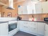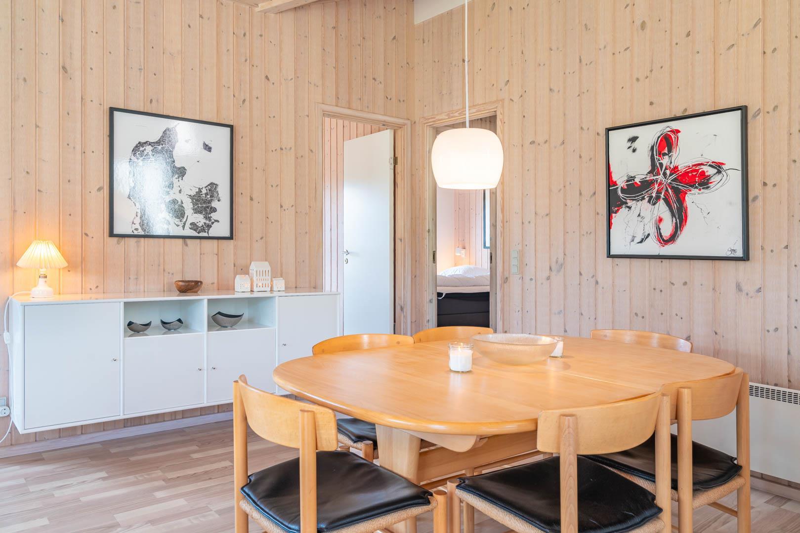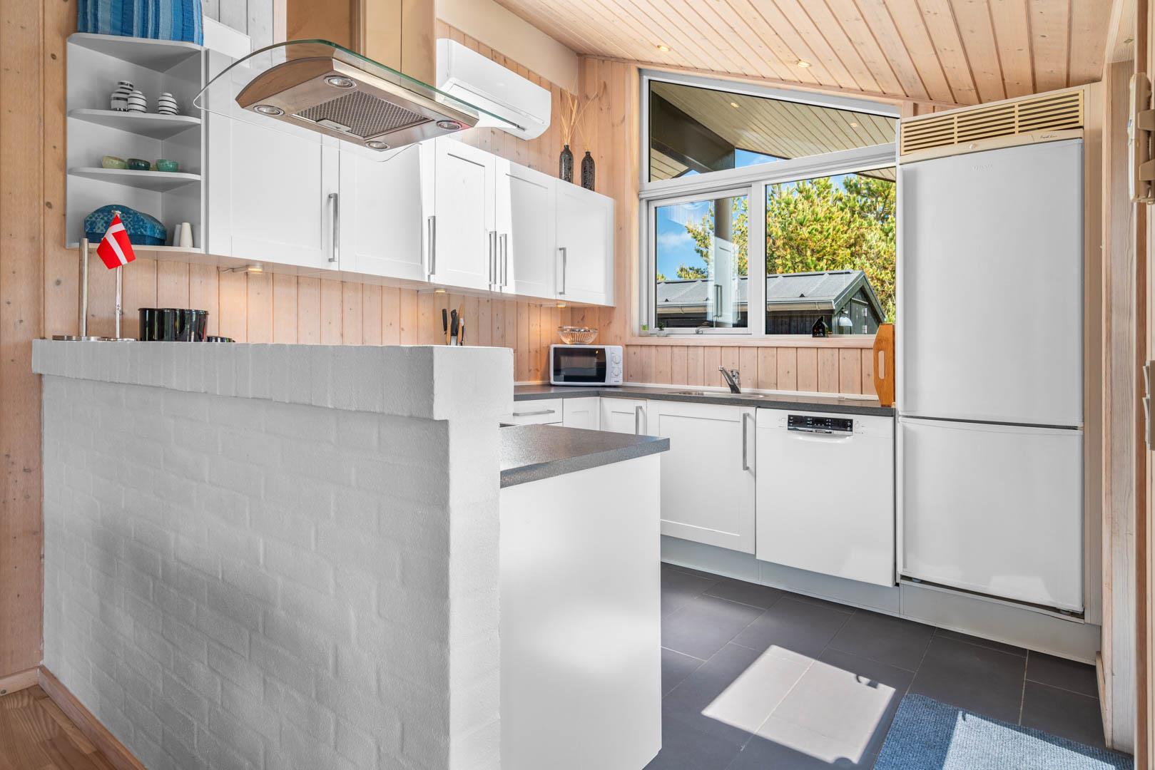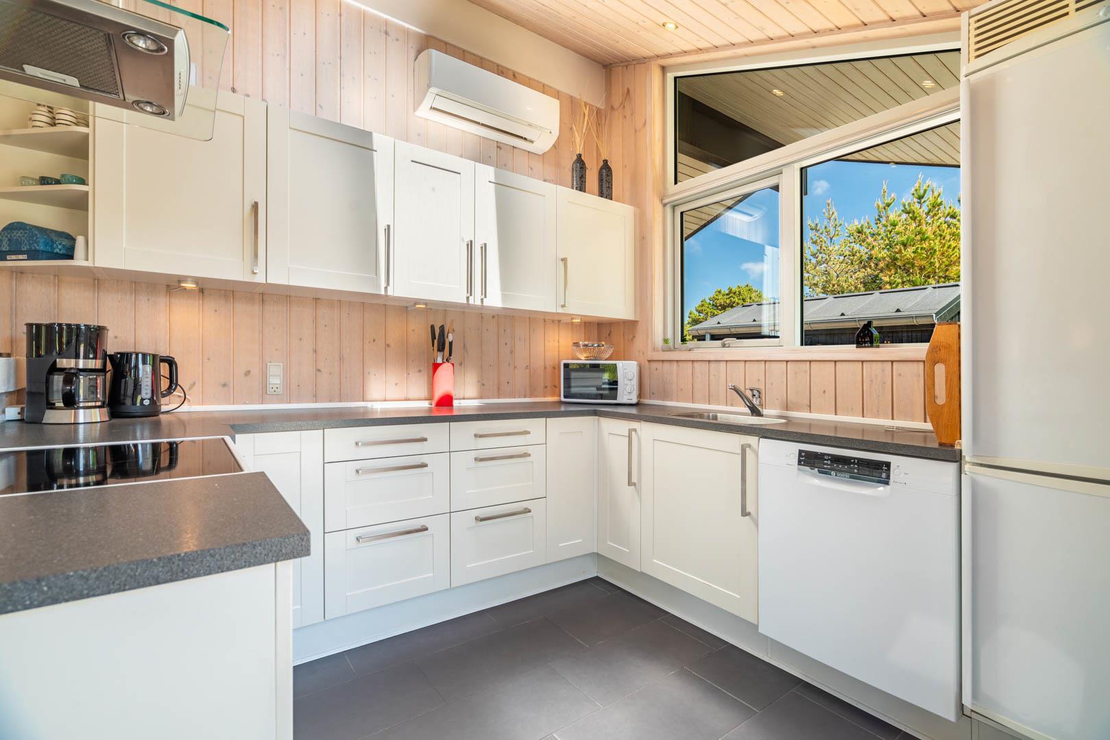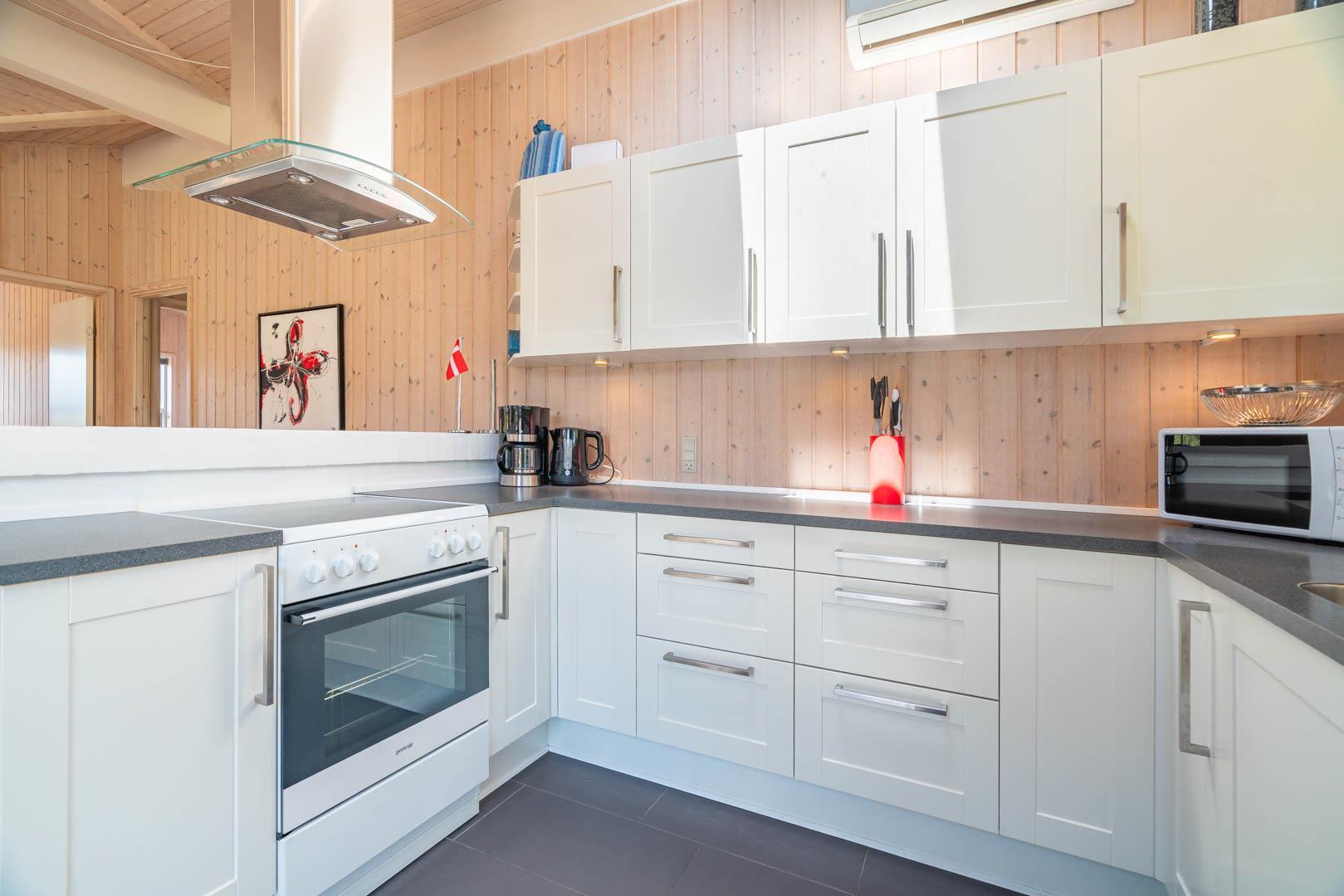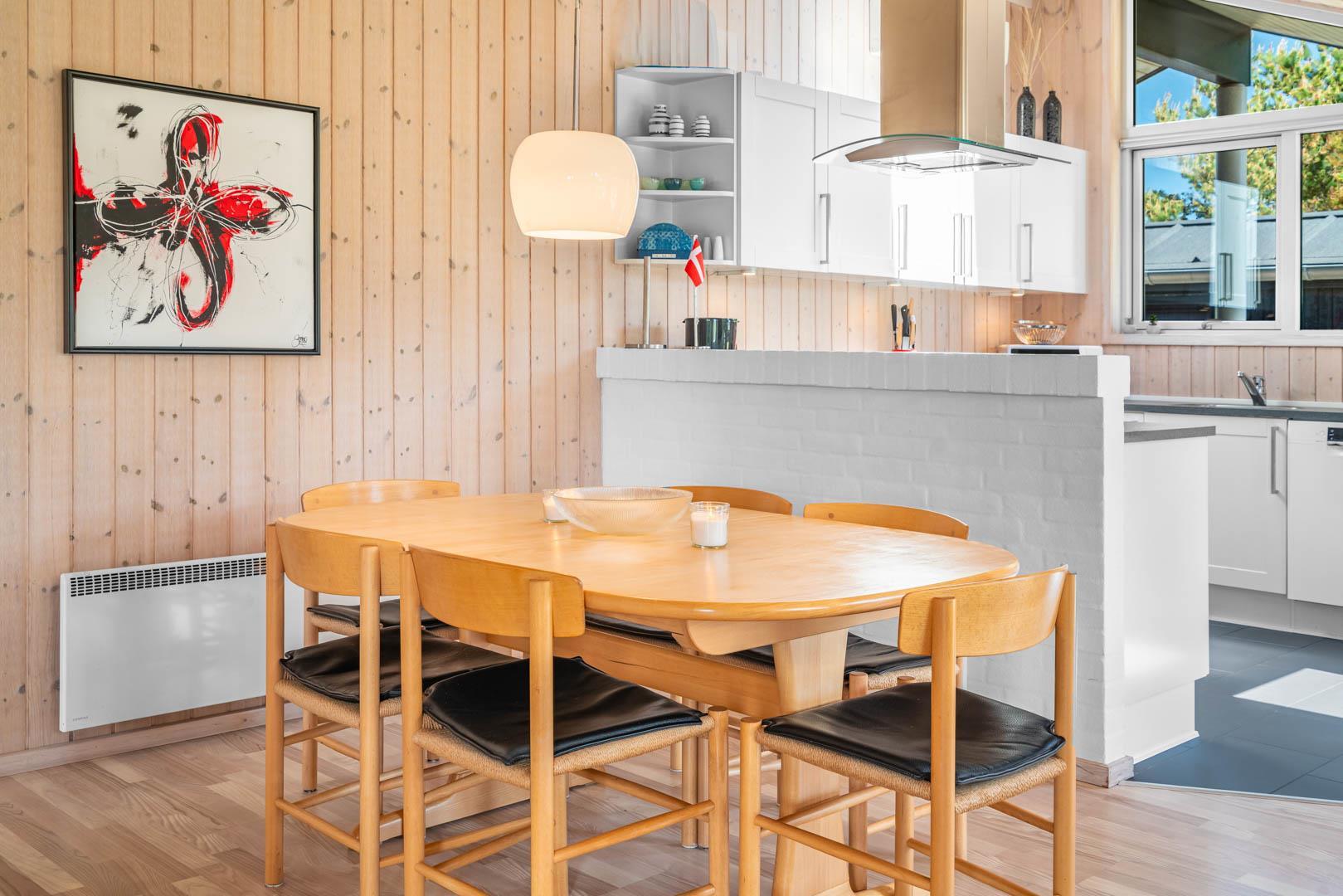 Opholdsstue, spiseafdeling og det veludstyrede køkken er i åben forbindelse.