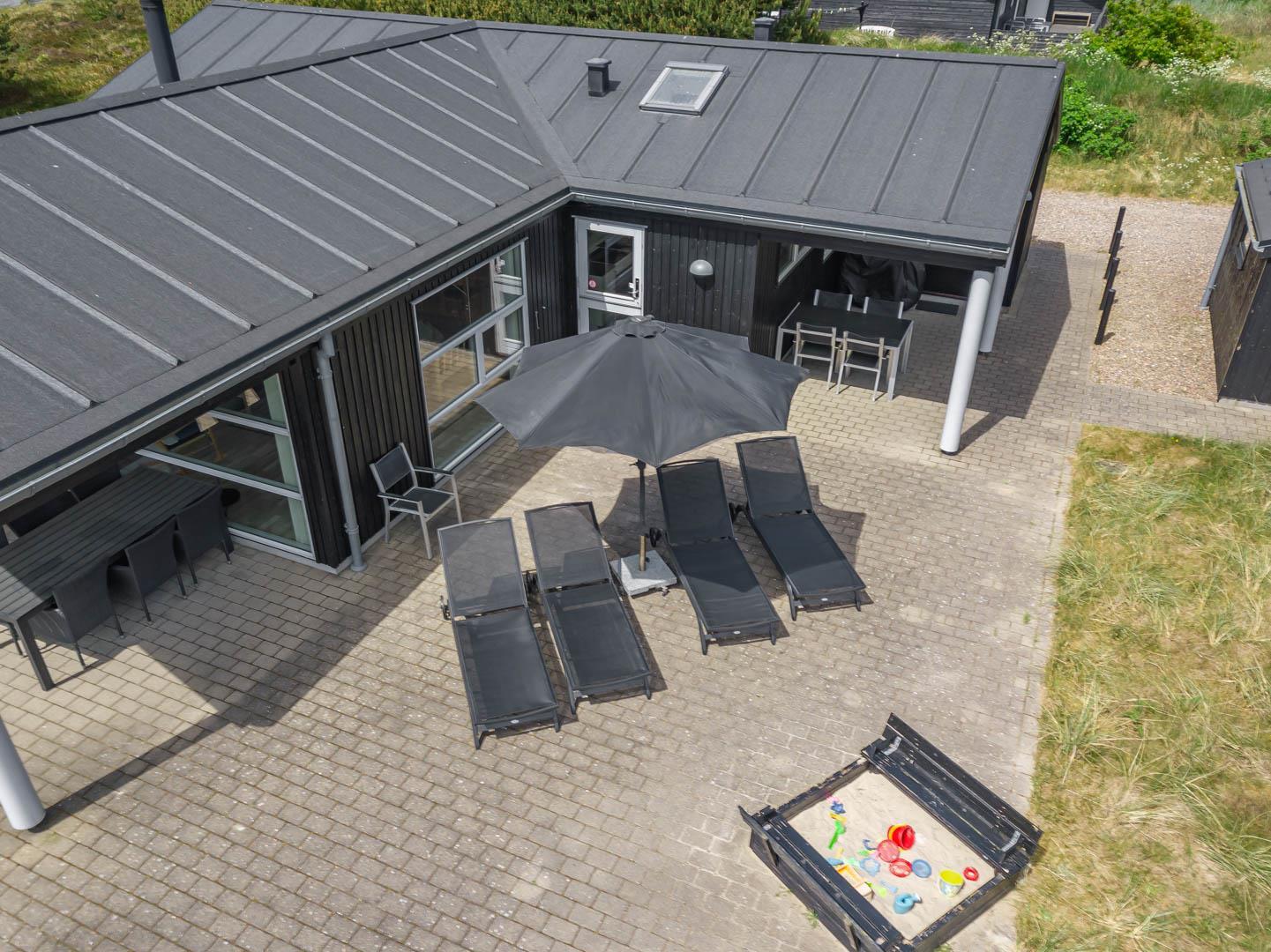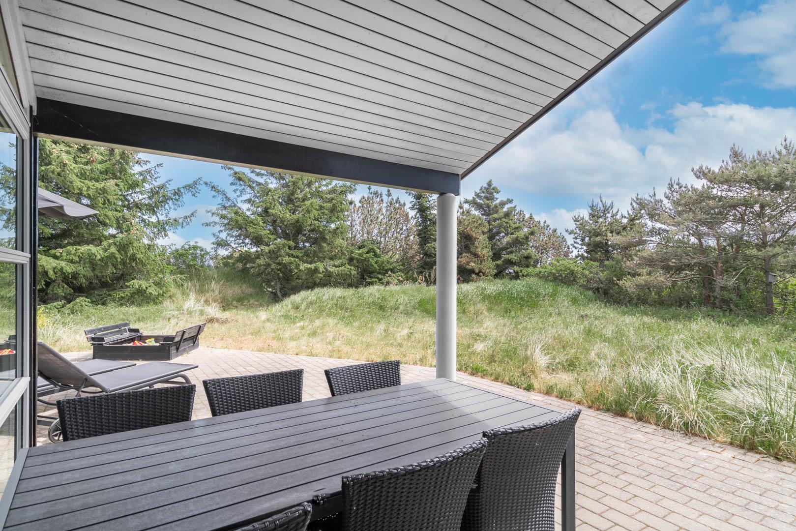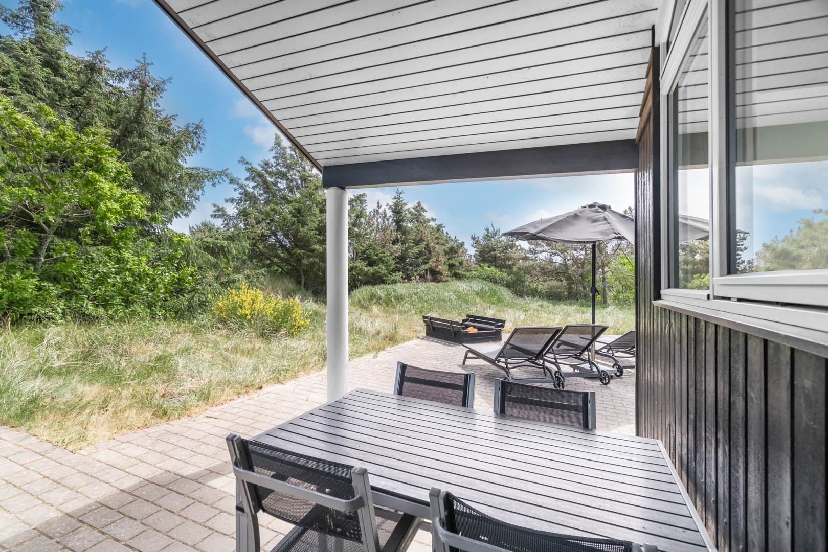 Omkring huset er der anlagt stor terrasse, hvorfra solen og freden kan nydes i fulde drag.