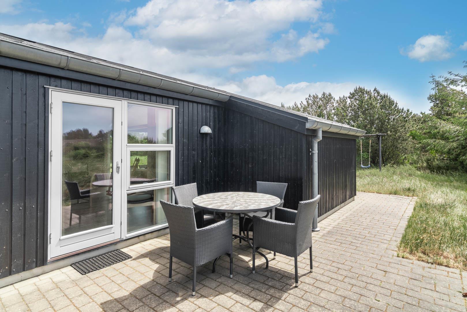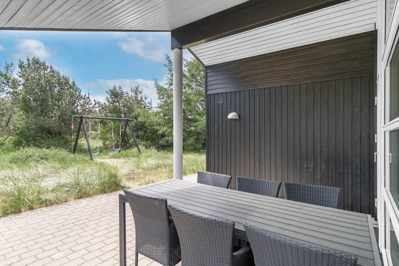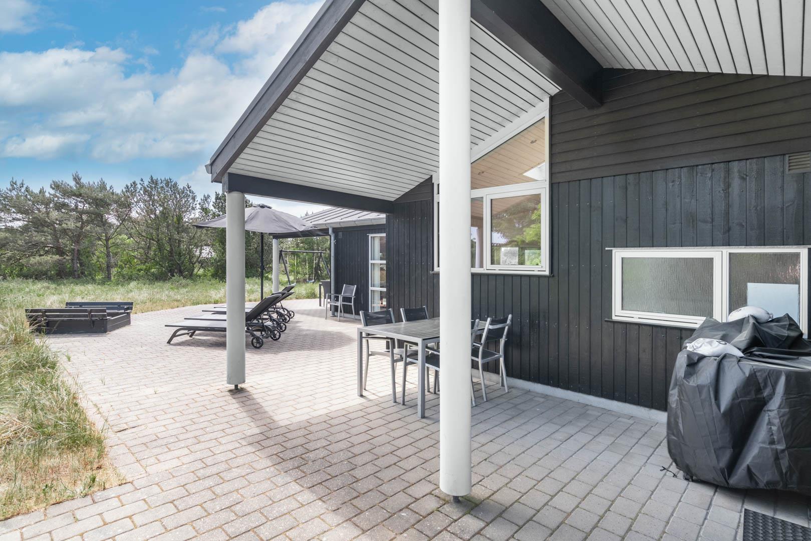 Omkring huset er der anlagt stor terrasse, hvorfra solen og freden kan nydes i fulde drag.