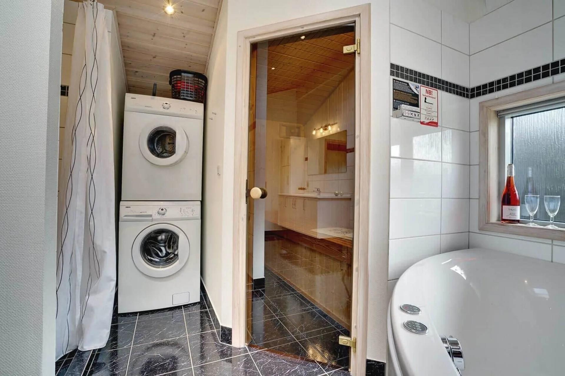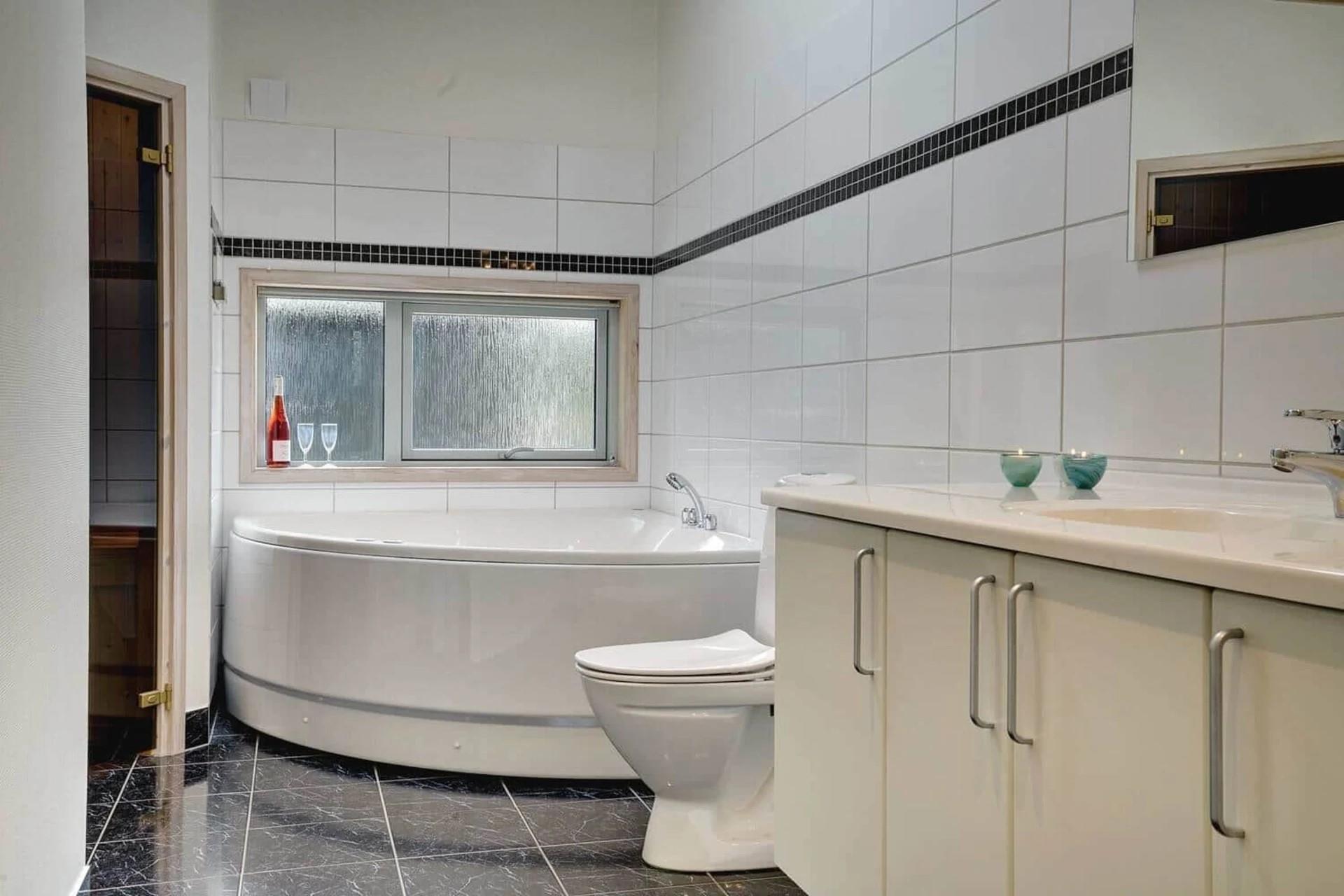 De store badeværelse er udstyret med spabad og sauna.